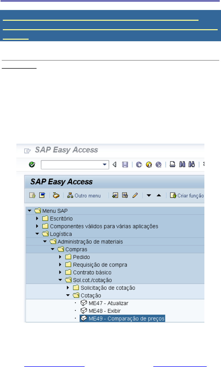 <p>Curso Prático de MM 2 – Administração de Materiais</p><p>Sites: www.grandesprojetos.com www.juliobattisti.com.br</p><p>Página 1 – Última Atualização – 30.07.2021</p><p>Proibido o uso deste material em sala de aula e em treinamentos sem autorização do autor.</p><p>Aula 16 – Escolha da Melhor Cotação e Criação de</p><p>Novo Pedido de Compra Baseado em Cotação - me49 e</p><p>me21n</p><p>Escolha da Melhor Cotação e Criação de Novo Pedido de Compra Baseado em Cotação -</p><p>me49 e me21n</p><p> O que é: A escolha da Melhor Cotação Baseada na melhor oferta de preços e a</p><p>criação de um novo pedido de compras baseado nesta cotação;</p><p> Quando usar: Quando se quer comparar os preços enviados pelos</p><p>Fornecedores, deixar registrada a melhor cotação e criar um novo pedido de</p><p>compras baseado nesta cotação;</p><p> Como Fazer: O código da transação é: me49 e me21n</p><p>Copyright by SAP AG</p><p>Figura – Comparação de Preços – me49</p><p>Curso Prático de MM 2 – Administração de Materiais</p><p>Sites: www.grandesprojetos.com www.juliobattisti.com.br</p><p>Página 2 – Última Atualização – 30.07.2021</p><p>Proibido o uso deste material em sala de aula e em treinamentos sem autorização do autor.</p><p>Copyright by SAP AG</p><p>Figura – Comparação de Preços – Por RQF /Org. Compras</p><p>Na aula anterior, pedimos para que você anotasse os números das cotações geradas. Os</p><p>nossos números foram (mas no seu caso, serão números diferentes). Agora iremos realizar a</p><p>comparação de Preços e posterior escolha da melhor cotação.</p><p>Copyright by SAP AG</p><p>Figura – Botão Pesquisar</p><p>Copyright by SAP AG</p><p>Figura – Comparação de Preços</p><p>No nosso caso, a melhor proposta foi a da Cotação 6000000026 com o Preço Final de 43.000.</p><p>Curso Prático de MM 2 – Administração de Materiais</p><p>Sites: www.grandesprojetos.com www.juliobattisti.com.br</p><p>Página 3 – Última Atualização – 30.07.2021</p><p>Proibido o uso deste material em sala de aula e em treinamentos sem autorização do autor.</p><p>Para marcar as demais cotações como “Perdedoras”, basta dar um duplo clique em cima do</p><p>número da cotação.</p><p>Copyright by SAP AG</p><p>Figura – Cotação Perdedora</p><p>Copyright by SAP AG</p><p>Figura – Flag de Eliminação</p><p>Copyright by SAP AG</p><p>Figura – R- Recusa</p><p>Curso Prático de MM 2 – Administração de Materiais</p><p>Sites: www.grandesprojetos.com www.juliobattisti.com.br</p><p>Página 4 – Última Atualização – 30.07.2021</p><p>Proibido o uso deste material em sala de aula e em treinamentos sem autorização do autor.</p><p>Copyright by SAP AG</p><p>Figura – Botão Gravar</p><p>Marque o Flag R (Recusa) dos três itens e clique no Botão Gravar. Depois faça a mesma coisa</p><p>para a outra cotação perdedora.</p><p>Copyright by SAP AG</p><p>Figura – Criar Pedido de Compras – me21n</p><p>Para inserir um novo pedido de compras baseado numa cotação existem 03 formas:</p><p>1ª Maneira: Na coluna SolCot. e item, preencha com o número da solicitação ganhadora e o</p><p>código da linha dos itens. Ao final tecle ENTER.</p><p>Curso Prático de MM 2 – Administração de Materiais</p><p>Sites: www.grandesprojetos.com www.juliobattisti.com.br</p><p>Página 5 – Última Atualização – 30.07.2021</p><p>Proibido o uso deste material em sala de aula e em treinamentos sem autorização do autor.</p><p>Copyright by SAP AG</p><p>Figura – Sol Cot. / Item</p><p>Para testar os lançamentos, iremos lançar a cotação PERDEDORA para ver qual mensagem</p><p>aparece. Coloca-se o Centro 3000 caso seja pedido:</p><p>Copyright by SAP AG</p><p>Figura – Mensagem de Aviso – Cotação Recusada</p><p>Copyright by SAP AG</p><p>Figura – Alteração</p><p>Curso Prático de MM 2 – Administração de Materiais</p><p>Sites: www.grandesprojetos.com www.juliobattisti.com.br</p><p>Página 6 – Última Atualização – 30.07.2021</p><p>Proibido o uso deste material em sala de aula e em treinamentos sem autorização do autor.</p><p>Copyright by SAP AG</p><p>Figura – Entrada de Centro</p><p>Em seguida entre com o Centro = 3000 e tecle ENTER.</p><p>Copyright by SAP AG</p><p>Figura – Carregamento da Cotação Ganhadora</p><p>2ª Maneira: Na transação me21n clique no botão “Ativar Síntese de Documentos”.</p><p>Copyright by SAP AG</p><p>Figura – Botão Ativar Síntese de Documentos</p><p>Curso Prático de MM 2 – Administração de Materiais</p><p>Sites: www.grandesprojetos.com www.juliobattisti.com.br</p><p>Página 7 – Última Atualização – 30.07.2021</p><p>Proibido o uso deste material em sala de aula e em treinamentos sem autorização do autor.</p><p>Copyright by SAP AG</p><p>Figura – Tela – Criar Pedido de Compras</p><p>Note que aparecerá em seguida uma nova coluna com o nome de Síntese de Documentos.</p><p>Nesta nova coluna clique no botão Variante de Seleção e escolha a opção Solicitações de</p><p>Cotação.</p><p>Copyright by SAP AG</p><p>Figura – ABA – Síntese de Documentos</p><p>Curso Prático de MM 2 – Administração de Materiais</p><p>Sites: www.grandesprojetos.com www.juliobattisti.com.br</p><p>Página 8 – Última Atualização – 30.07.2021</p><p>Proibido o uso deste material em sala de aula e em treinamentos sem autorização do autor.</p><p>Note que aparecerá em seguida uma nova tela para pesquisar o Documento. Nesta nova tela</p><p>escolha a busca que facilite a pesquisa pela Cotação:</p><p>Copyright by SAP AG</p><p>Figura – Filtro de Seleção de Cotação</p><p>Copyright by SAP AG</p><p>Figura – Botão Pesquisar</p><p>Em seguida selecione os três itens da cotação vencedora e clique no botão “Transferir”.</p><p>Curso Prático de MM 2 – Administração de Materiais</p><p>Sites: www.grandesprojetos.com www.juliobattisti.com.br</p><p>Página 9 – Última Atual