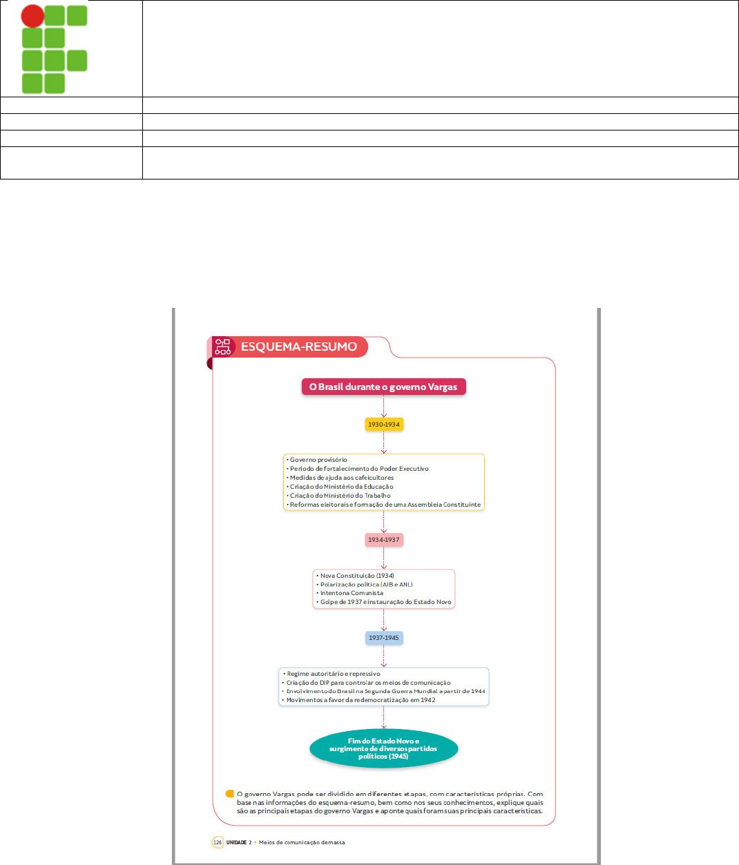 <p>INSTITUO FEDERAL DE EDUCAÇÃO, CIÊNCIA E TECNOLOGIA DE MATO GROSSO.</p><p>CAMPUS SÃO VICENTE</p><p>Professora Silvia Jacinta Ritter Pimenta</p><p>Disciplina História História</p><p>Turma 3° ano B</p><p>Estudante: Marciel</p><p>José da Silva</p><p>Atividade 1 - 4º Bimestre.</p><p>INDIVIDUAL</p><p>O esquema resumo abaixo, também est�� disponível na página 126 de seu livro didático. Observe-</p><p>o atentamente, estude o assunto e a seguir faça aquilo que se pede ao final.</p><p>1- O governo Vargas pode ser dividido em diferentes etapas, com características próprias. Com base</p><p>nas informações do esquema-resumo, bem como nos seus estudos sobre este tema, explique quais</p><p>são as principais etapas do governo Vargas e aponte quais foram suas principais características.</p><p>R: •Governo Provisório</p><p>•Governo constitucional</p><p>•Estado novo</p><p>Na fase provisória, Vargas tomou as primeiras medidas centralizadoras, enfraquecendo o Legislativo</p><p>e fortalecendo o Executivo. No âmbito regional, apoiou seu poder nos interventores que nomeava.</p><p>Também ampliou o aparato da burocracia, criando instituições como o Ministério do Trabalho.</p><p>Estado novo foi caracterizado pela centralização do poder nacionalismo, auticomunismo e por seu</p><p>autoritarismo.</p><p>O governo constitucional já Foi marcada pela radicalização da política Brasileira a partir da atuação</p><p>de diversos grupos políticos, bem como pela centralização do poder aplicada aos poucos, o que</p><p>levou à construção do Estado Novo.</p>