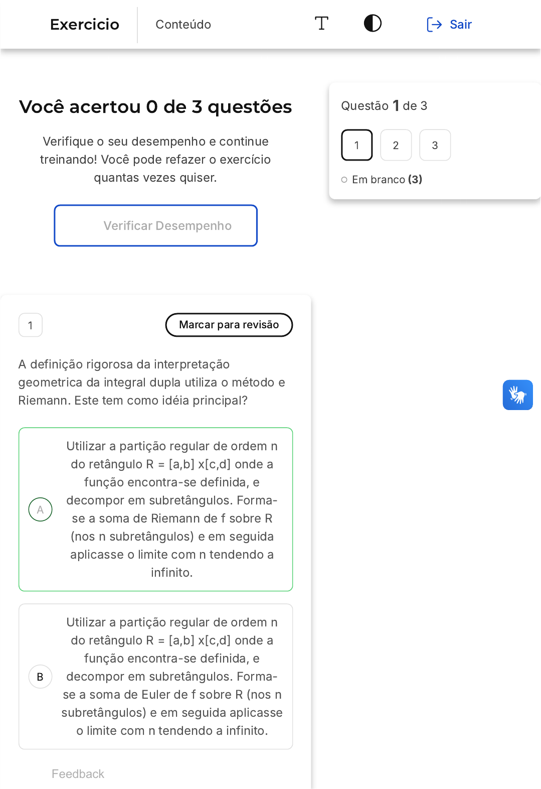 <p>Você acertou 0 de 3 questões</p><p>Verifique o seu desempenho e continue</p><p>treinando! Você pode refazer o exercício</p><p>quantas vezes quiser.</p><p>Verificar Desempenho</p><p>A</p><p>B</p><p>1 Marcar para revisão</p><p>A definição rigorosa da interpretação</p><p>geometrica da integral dupla utiliza o método e</p><p>Riemann. Este tem como idéia principal?</p><p>Utilizar a partição regular de ordem n</p><p>do retângulo R = [a,b] x[c,d] onde a</p><p>função encontra-se definida, e</p><p>decompor em subretângulos. Forma-</p><p>se a soma de Riemann de f sobre R</p><p>(nos n subretângulos) e em seguida</p><p>aplicasse o limite com n tendendo a</p><p>infinito.</p><p>Utilizar a partição regular de ordem n</p><p>do retângulo R = [a,b] x[c,d] onde a</p><p>função encontra-se definida, e</p><p>decompor em subretângulos. Forma-</p><p>se a soma de Euler de f sobre R (nos n</p><p>subretângulos) e em seguida aplicasse</p><p>o limite com n tendendo a infinito.</p><p>Questão 1 de 3</p><p>Em branco �3�</p><p>1 2 3</p><p>Feedback</p><p>Exercicio Conteúdo Sair</p><p>C</p><p>D</p><p>E</p><p>Utilizar a partição nao regular de</p><p>ordem n do retângulo R = [a,b] x[c,d]</p><p>onde a função encontra-se definida, e</p><p>decompor em subretângulos. Forma-</p><p>se a soma de Riemann de f sobre R</p><p>(nos n subretângulos) e em seguida</p><p>aplicasse o limite com n tendendo a</p><p>infinito.</p><p>Utilizar a partição nao regular de</p><p>ordem n do retângulo R = [a,b] x[c,d]</p><p>onde a função encontra-se definida, e</p><p>decompor em subretângulos. Forma-</p><p>se a soma de Euler de f sobre R (nos n</p><p>subretângulos) e em seguida aplicasse</p><p>o limite com n tendendo a infinito.</p><p>Nenhuma das respostas.</p><p>Questão não respondida</p><p>Opa! A alternativa correta é a letra</p><p>A. Confira o gabarito comentado!</p><p>Gabarito Comentado</p><p>Utilizar a partição regular de ordem n do</p><p>retângulo R = [a,b] x[c,d] onde a função</p><p>encontra-se definida, e decompor em</p><p>subretângulos. Forma-se a soma de</p><p>Riemann de f sobre R (nos n</p><p>subretângulos) e em seguida aplicasse o</p><p>limite com n tendendo a infinito.</p><p>2 Marcar para revisão</p><p>A</p><p>B</p><p>C</p><p>D</p><p>E</p><p>Calcule o volume do sólido cuja base inferior é</p><p>a região retangular no plano xy, com x variando</p><p>de 0 a 3 e y variando de 0 a 2 e cujo topo está</p><p>na superfície f(x,y) = 4 - y^2.</p><p>10</p><p>12</p><p>14</p><p>16</p><p>20</p><p>Questão não respondida</p><p>Opa! A alternativa correta é a letra</p><p>D. Confira o gabarito comentado!</p><p>Gabarito Comentado</p><p>16</p><p>3 Marcar para revisão</p><p>Usando à técnica de integração dupla, calcular</p><p>o volume do sólido gerado pela equação f(x,y)</p><p>= e dxdy, para os intervalos</p><p>R� �0,1]x[0,3].</p><p>(x+2y)</p><p>A</p><p>B</p><p>C</p><p>D</p><p>E</p><p>1/2(e − 1) (e6 − 1)</p><p>−1/2(e − 1) (e6 − 1)</p><p>(e − 1) (e6 − 1)</p><p>1/2(e − 1)</p><p>1/2 (e6 − 1)</p><p>Questão não respondida</p><p>Opa! A alternativa correta é a letra</p><p>A. Confira o gabarito comentado!</p><p>Gabarito Comentado</p><p>1/2(e − 1) (e6 − 1)</p><p>Você acertou 0 de 7 questões</p><p>Verifique o seu desempenho e continue treinando! Você</p><p>pode refazer o exercício quantas vezes quiser.</p><p>Verificar Desempenho</p><p>A</p><p>B</p><p>C</p><p>D</p><p>E</p><p>1 Marcar para revisão</p><p>Seja f(x,y) = 1 / (x + y ). Determine a integral dupla da</p><p>função f(x,y) definida no intervalo</p><p>0 ≤ x ≤ y e 1 ≤ y ≤ e.</p><p>2 2</p><p>pi/4</p><p>pi</p><p>2 pi</p><p>pi / 5</p><p>pi / 8</p><p>Questão não respondida</p><p>Opa! A alternativa correta é a letra A.</p><p>Confira o gabarito comentado!</p><p>Questão 1 de 7</p><p>Em branco �7�</p><p>1 2 3 4 5</p><p>6 7</p><p>Feedback</p><p>Exercicio Conteúdo Sair</p><p>A</p><p>B</p><p>C</p><p>D</p><p>E</p><p>Gabarito Comentado</p><p>pi/4</p><p>2 Marcar para revisão</p><p>Seja uma superfície parametrizada por j(u,v) = (vcos u,</p><p>vsen u, 1 - v ) com 0 ≤ u ≤ 2 π𝜋 e v ³ 0. Determine o</p><p>vetor normal a S em j �0,1�.</p><p>2</p><p>O vetor normal será ��2,0,�1�</p><p>O vetor normal será �0,0,�1�</p><p>O vetor normal será �0,0,0�</p><p>O vetor normal será �2,0,1�</p><p>O vetor normal será ��2,3,�1�</p><p>Questão não respondida</p><p>Opa! A alternativa correta é a letra A.</p><p>Confira o gabarito comentado!</p><p>Gabarito Comentado</p><p>O vetor normal será ��2,0,�1�</p><p>A</p><p>B</p><p>C</p><p>D</p><p>E</p><p>3 Marcar para revisão</p><p>Seja o sólido limitado pelas superfícies x + y = 1, z + y</p><p>= 2 e z = 0. Determite a massa do sólido supondo que a</p><p>densidade é dada por s(x,y,z) = z.</p><p>2 2</p><p>Será �17 π) / 8 u.m</p><p>2π u.m</p><p>7 π u.m</p><p>2π/3 u.m</p><p>π u.m</p><p>Questão não respondida</p><p>Opa! A alternativa correta é a letra A.</p><p>Confira o gabarito comentado!</p><p>Gabarito Comentado</p><p>Será �17 π) / 8 u.m</p><p>4 Marcar para revisão</p><p>Determine o valor da integral dupla da função f(x,y) =</p><p>, ou seja, e onde u = x , no intevalo 0 <= x ��1 e 0��</p><p>y <= x</p><p>ex</p><p>2</p><p>u 2</p><p>A</p><p>B</p><p>C</p><p>D</p><p>E</p><p>(e−1)</p><p>2</p><p>e - 1</p><p>e</p><p>1/2</p><p>Nenhuma das respostas anteriores</p><p>Questão não respondida</p><p>Opa! A alternativa correta é a letra A.</p><p>Confira o gabarito comentado!</p><p>Gabarito Comentado</p><p>passando os limites de integracao de y</p><p>temos</p><p>chame u = x e du = 2x dx</p><p>aplicando os limites de</p><p>integracao encontra-se</p><p>A resposta correta é a alternativa A, pois a integral</p><p>dupla da função f(x,y) = , ou seja, e onde u = x</p><p>, no intevalo 0 <= x ��1 e 0�� y <= x é igual a</p><p>∫ 1</p><p>0 ∫ x</p><p>0 eudydx onde u = x2</p><p>∫ 1</p><p>0 yex</p><p>2</p><p>