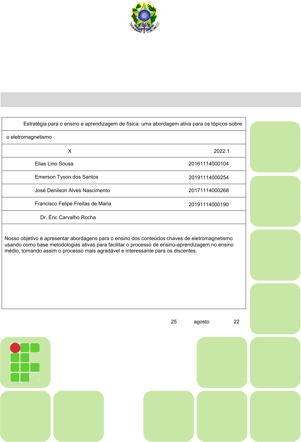 <p>Título:</p><p>Projeto Integrador: [ ] I [ ] II [ ] III [ ] IV Sem. letivo:</p><p>Estudante: Matrícula:</p><p>Estudante: Matrícula:</p><p>Estudante: Matrícula:</p><p>Estudante: Matrícula:</p><p>Orientador:</p><p>Breve descrição do projeto</p><p>Acaraú, __ de ________ de 20___</p><p>Assinatura do Docente Responsável</p><p>SIAPE:</p><p>MINISTÉRIO DA EDUCAÇÃO</p><p>INSTITUTO FEDERAL DE EDUCAÇÃO, CIÊNCIA E TECNOLOGIA DO CEARÁ</p><p>CAMPUS DE ACARAÚ</p><p>CURSO DE LICENCIATURA EM FÍSICA</p><p>Av.: Des. Armando de Sales Lousada S/N – Bairro: Campos de Aviação–Acaraú/CE - CEP: 62580-000</p><p>FORMULÁRIO DE MATRÍCULA EM PROJETO INTEGRADOR</p><p>X</p><p>Estratégia para o ensino e aprendizagem de física: uma abordagem ativa para os tópicos sobre</p><p>o eletromagnetismo</p><p>Francisco Felipe Freitas de Maria</p><p>Emerson Tyson dos Santos</p><p>Elias Lino Sousa</p><p>José Denilson Alves Nascimento</p><p>20191114000190</p><p>20191114000254</p><p>20171114000268</p><p>20161114000104</p><p>Nosso objetivo é apresentar abordagens para o ensino dos conteúdos chaves de eletromagnetismo</p><p>usando como base metodologias ativas para facilitar o processo de ensino-aprendizagem no ensino</p><p>médio, tornando assim o processo mais agradável e interessante para os discentes.</p><p>25 agosto 22</p><p>2022.1</p><p>Dr. Éric Carvalho Rocha</p>