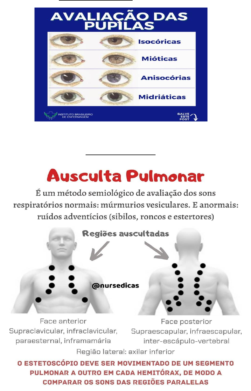 <p>AVALIAÇÃO PUPILAR</p><p>AVALIAÇÃO PULMONAR</p><p>SONS NORMAIS - MURMÚRIOS VESICULARES</p><p>SONS ANORMAIS - RUÍDOS ADVENTÍCIOS</p><p>AVALIAÇÃO CARDÍACA</p>