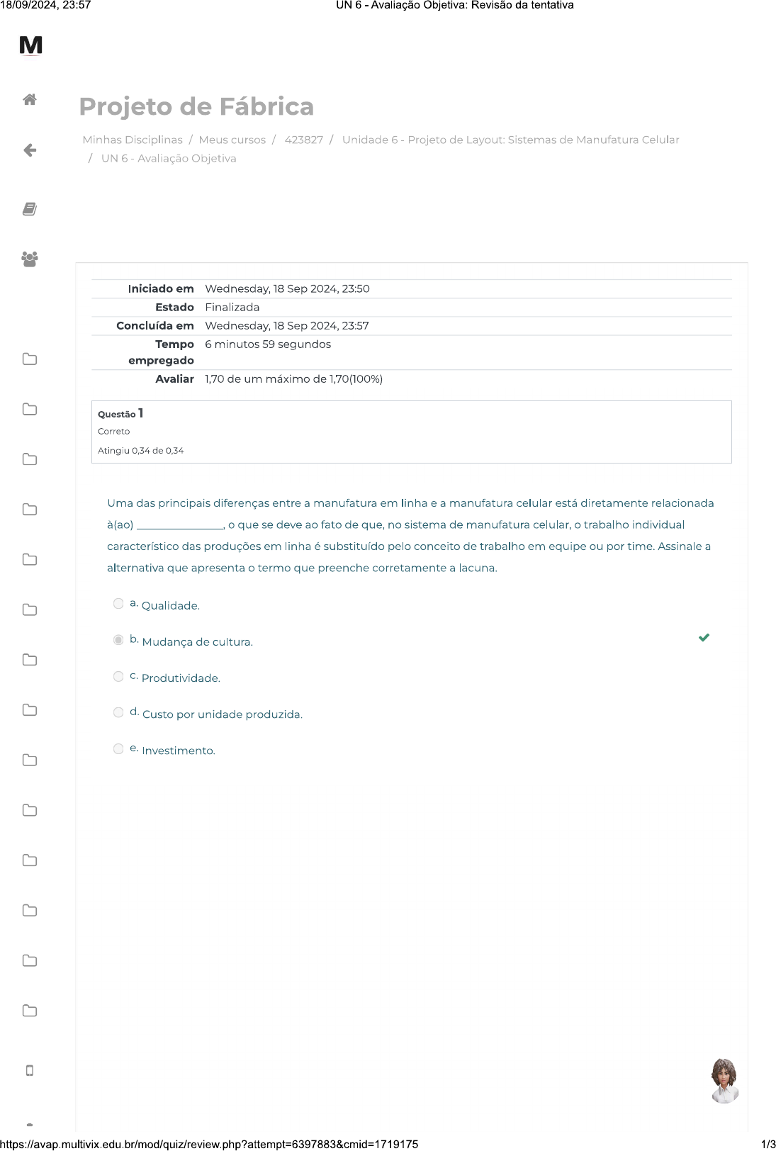 <p>23:57 UN 6 - Avaliação Objetiva: Revisão da tentativa M Projeto de Fábrica Minhas Disciplinas / Meus cursos / 423827 / Unidade 6 - Projeto de Layout: Sistemas de Manufatura Celular / UN 6 - Avaliação Objetiva Iniciado em Wednesday, 18 Sep 2024, 23:50 Estado Finalizada Concluída em Wednesday, 18 Sep 2024, 23:57 Tempo 6 minutos 59 segundos empregado Avaliar 1,70 de um máximo de 1,70(100%) Questão 1 Correto Atingiu 0,34 de 0,34 Uma das principais diferenças entre a manufatura em linha e a manufatura celular está diretamente relacionada à(ao) o que se deve ao fato de que, no sistema de manufatura celular, o trabalho individual característico das produções em linha é substituído pelo conceito de trabalho em equipe ou por time. Assinale a alternativa que apresenta o termo que preenche corretamente a lacuna. a. Qualidade. b. Mudança de cultura. C. Produtividade. d. Custo por unidade produzida. e. Investimento. 1/3</p><p>18/09/2024, 23:57 UN 6 - Avaliação Objetiva: Revisão da tentativa Questão 2 M Correto Atingiu 0,34 de 0,34 Um dos recursos fundamentais para a análise de agrupamentos é a formulação de um(a) em que, a partir dos critérios de similaridade considerados, de modo dados relacionados às peças e às máquinas são agrupados, definindo as células de manufatura. Assinale a alternativa que apresenta termo que preenche corretamente a lacuna. a. Algoritmo. b. Equação. C. Portfólio. d. Matriz de incidência. e. PCP. Questão 3 Correto Atingiu 0,34 de 0,34 sistema de manufatura celular apresenta algumas desvantagens ou pontos de atenção a serem considerados. Por exemplo: o sistema pode, aos olhos dos colaboradores, sugerir ou dar a impressão de um aumento de atribuições ou de volume de trabalho. A que se relaciona esse contexto? a. Restrições financeiras. b. Jobshop layout limitation. C. Restrições tecnológicas. d. Resistência dos colaboradores. e. Limitações físicas. 2/3</p><p>18/09/2024, 23:57 UN 6 - Avaliação Objetiva: Revisão da tentativa Questão 4 M Correto Atingiu 0,34 de 0,34 No sistema de manufatura celular, algumas desvantagens ou pontos de atenção devem ser considerados, como, por exemplo: pode eventualmente haver restrições relacionadas à limitação física para a implantação da manufatura celular, em função do tamanho e do porte dos equipamentos envolvidos. Esse contexto remete a qual das opções a seguir? a. Limitações físicas. b. Restrições tecnológicas. C. Jobshop layout limitation. d. Resistência dos colaboradores. e. Restrições financeiras. Questão 5 Correto Atingiu 0,34 de 0,34 posicionamento do layout em "U", a necessidade de treinamento e de capacitação, assim como monitoramento contínuo, são aspectos fundamentais no layout celular, para que se possa adaptar as células de manufatura Assinale a alternativa que apresenta termo que preenche corretamente a lacuna. a. Ao aumento de faturamento. b. Aos aumentos de volume. C. novas tecnologias. d. Ao crescimento da empresa. e. variações de demanda. Conteúdo Online Seguir para... Exercícios de Fixação https://avap.multivix.edu.br/mod/quiz/review.php?attempt=6397883&cmid=1719175 3/3</p>