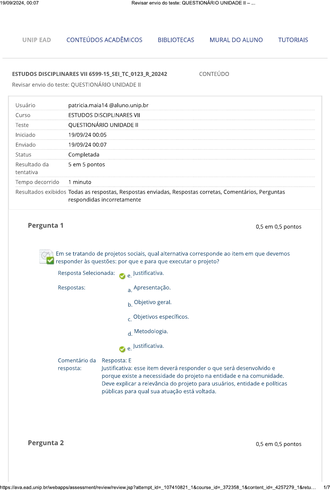 <p>19/09/2024, 00:07 Revisar envio do teste: QUESTIONÁRIO UNIDADE - UNIP EAD CONTEÚDOS ACADÊMICOS BIBLIOTECAS MURAL DO ALUNO TUTORIAIS ESTUDOS DISCIPLINARES VII 6599-15_SEI_TC_0123_R_20242 CONTEÚDO Revisar envio do teste: QUESTIONÁRIO UNIDADE Usuário patricia.maia14@aluno.unip.br Curso ESTUDOS DISCIPLINARES VII Teste QUESTIONÁRIO UNIDADE II Iniciado 19/09/24 00:05 Enviado 19/09/24 00:07 Status Completada Resultado da 5 em 5 pontos tentativa Tempo decorrido 1 minuto Resultados exibidos Todas as respostas, Respostas enviadas, Respostas corretas, Comentários, Perguntas respondidas incorretamente Pergunta 1 0,5 em 0,5 pontos Em se tratando de projetos sociais, qual alternativa corresponde ao item em que devemos responder às questões: por que e para que executar o projeto? Resposta Selecionada: e. Justificativa. Respostas: a. Apresentação. b. Objetivo geral. Objetivos específicos. C. d. Metodologia. e. Justificativa. Comentário da Resposta: E resposta: Justificativa: esse item deverá responder o que será desenvolvido e porque existe a necessidade do projeto na entidade e na comunidade. Deve explicar a relevância do projeto para usuários, entidade e políticas públicas para qual sua atuação está voltada Pergunta 2 0,5 em 0,5 pontos 1/7</p><p>19/09/2024, 00:07 Revisar envio do teste: QUESTIONÁRIO UNIDADE - Complete a lacuna com uma das alternativas. Os são medidas numéricas para conhecer em que medida os objetivos do seu projeto estão ou não sendo alcançados, dentro de um prazo delimitado e em uma localidade específica. Resposta Selecionada: b. Indicadores. Respostas: a. Orçamentos. b. Indicadores. Editais. C. Planos. d. Métodos. e. Comentário Resposta: B da resposta: Justificativa: indicadores sociais são parâmetros para a aferição de objetivos e resultados esperados de um projeto. Eles podem ser quantitativos ou qualitativos e devem ser verificáveis objetivamente. Eles são uma espécie de sinalizador e buscam expressar algum aspecto da realidade sob uma forma que possamos observar ou mensurar. Baseiam- se na identificação de uma variável, ou seja, algum aspecto que varia de estado ou situação, que consideramos capaz de expressar um fenômeno que nos interessa. Pergunta 3 0,5 em 0,5 pontos Das alternativas, qual não corresponde ao chamado ciclo de vida do projeto? Resposta Selecionada: d. Captação. Respostas: Iniciação. a. b. Planejamento. C. Execução. d. Captação. e. Encerramento. Comentário da Resposta: D resposta: Justificativa: a captação de recursos, em síntese, é a mobilização de recursos financeiros ou materiais para a manutenção de uma instituição ou de projetos específicos. Pergunta 4 0,5 em 0,5 pontos</p><p>19/09/2024, 00:07 Revisar envio do teste: QUESTIONÁRIO UNIDADE Das alternativas, qual não corresponde a uma das características de um projeto? Resposta e. É realizado por pessoas e conta com recursos ilimitados. Selecionada: Respostas: É temporário, possuindo um início e um fim definidos. a. b. É planejado, executado e controlado. C. Entrega produtos, serviços ou resultados exclusivos. d. É desenvolvido em etapas e continua por incremento com uma elaboração progressiva. É realizado por pessoas e conta com recursos ilimitados. e. Comentário Resposta: E da resposta: Justificativa: um projeto social é também um documento utilizado para a formalização de uma proposta destinada à obtenção de financiamento público ou privado, ou seja, para a captação dos recursos necessários à implementação de uma solução. Os projetos sociais são importantes ferramentas de ação, amplamente utilizados pelo Estado e pela sociedade civil. Os projetos sociais nascem do desejo de mudar uma realidade, são realizados por pessoas e contam com recursos limitados. Pergunta 5 0,5 em 0,5 pontos Complete a lacuna com uma das alternativas: As são os compromissos expressos em termos de um objeto a ser realizado, em certa quantidade e em certo período de tempo. São sempre resultados previstos e desejáveis, jamais imprevistos e/ou indesejáveis. Resposta Selecionada: Metas. a. Respostas: a. Metas. b. Avaliações. Pistas. C. d. Estratégias. e. Metodologias. Comentário da resposta: Resposta: A Justificativa: metas: Detalhamento dos objetivos específicos. Devem ser mensuráveis/quantificáveis por um indicador. Podem ser desdobradas em fases e atividades. 3/7</p><p>19/09/2024, 00:07 Revisar envio do teste: QUESTIONÁRIO UNIDADE - Pergunta 6 0,5 em 0,5 pontos Complete a lacuna com a palavra que está na alternativa correta. significa acompanhar os custos e conferir sistematicamente todas as atividades do projeto, além de permitir a avaliação. Resposta Selecionada: d. Respostas: a. Planejamento. b. Orçamento. C. Sistematizar. d. e. Treinamento. Comentário Resposta: D da resposta: Justificativa: como uma ligação direta entre o planejamento e o controle, as funções de monitoramento e avaliação fornecem informações para a equipe do projeto poder tomar decisões. monitoramento deve ser elaborado para fornecer informações a todos os níveis gerenciais e deve ser consistente com a lógica do sistema de planejamento, organização e direção do projeto. Pergunta 7 0,5 em 0,5 pontos Embora seja possível identificar dissenso na doutrina acerca das características das entidades do terceiro setor, são comumente apontadas como diferenciais das entidades que o compõem: Resposta C. Selecionada: Sua natureza privada, a ausência de finalidade lucrativa, a autoadministração, a institucionalização e o fato de poderem contar com atividades voluntárias. Respostas: a. Sua capacidade de suprir todas as necessidades que são responsabilidades do Estado, por meio de parcerias, financiamento, convênio e subsídios firmados com o próprio b. Sua capacidade de suprir algumas necessidades que são responsabilidade do Estado, somente com parcerias, financiamentos, convênios e subsídios firmados com institutos e empresas 