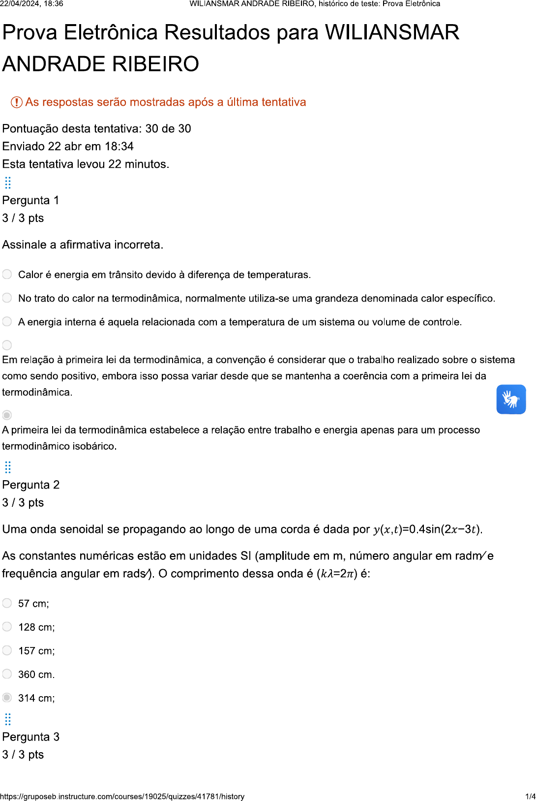 <p>22/04/2024, 18:36 WILIANSMAR ANDRADE RIBEIRO, histórico de teste: Prova Eletrônica Prova Eletrônica Resultados para WILIANSMAR ANDRADE RIBEIRO ! As respostas serão mostradas após a última tentativa Pontuação desta tentativa: 30 de 30 Enviado 22 abr em 18:34 Esta tentativa levou 22 minutos. Pergunta 1 3 / 3 pts Assinale a afirmativa Calor é energia em trânsito devido à diferença de temperaturas. No trato do calor na termodinâmica, normalmente utiliza-se uma grandeza denominada calor específico. A energia interna é aquela relacionada com a temperatura de um sistema ou volume de controle. Em relação à primeira lei da termodinâmica, a convenção é considerar que o trabalho realizado sobre o sistema como sendo positivo, embora isso possa variar desde que se mantenha a coerência com a primeira lei da termodinâmica. A primeira lei da termodinâmica estabelece a relação entre trabalho e energia apenas para um processo termodinâmico isobárico. Pergunta 2 3 / 3 pts Uma onda senoidal se propagando ao longo de uma corda é dada por y(x,t)=0.4sin(2x-3t). As constantes numéricas estão em unidades SI (amplitude em m, número angular em radm/e frequência angular em rads/). comprimento dessa onda é é: 57 cm; 128 cm; 157 cm; 360 cm. 314 cm; Pergunta 3 3 / 3 pts https://gruposeb.instructure.com/courses/19025/quizzes/41781/history 1/4</p><p>22/04/2024, 18:36 WILIANSMAR ANDRADE RIBEIRO, histórico de teste: Prova Eletrônica Assinale a afirmativa falsa. postulado de Kelvin-Planck estabelece que é possível construir um dispositivo que funcione em ciclo cujo único efeito seja o de produção de trabalho (levantamento de um peso) onde a troca de calor ocorra apenas com um único reservatório de calor, ou seja, com apenas a fonte quente. postulado de Clausius estabelece ser impossível construir um dispositivo que funcione em ciclo cujo único efeito seja o de transferir calor de um corpo mais frio para um corpo mais quente sem que trabalho seja fornecido. A primeira lei da termodinâmica afirma que, durante qualquer ciclo (estado inicial = estado final) pelo qual um sistema passa, a variação da energia interna é nula, mas não define como pode correr o fluxo de trabalho ou calor. A segunda lei da termodinâmica estabelece ser impossível construir um refrigerador ou aquecedor (bomba de calor) que funcione sem que um trabalho seja fornecido. A segunda lei da termodinâmica reconhece que processos podem ocorrer em uma determinada direção, mas não na direção oposta. Pergunta 4 3 / 3 pts Sabe-se que a velocidade do som no ar é dada por A velocidade do som a 4 é quantos por cento (%) maior do que a 0°C? 13%; 6.1%; 7.1%; 11%; 4.3%. Pergunta 5 3 / 3 pts Em relação à Teoria Cinética dos Gases, qual afirmativa é falsa? Essa teoria permite obter uma equação de estado para o gás perfeito. Ela relaciona a pressão na parede de um recipiente fechado ao momento linear das moléculas de gás e aos intervalos de tempo entre as colisões com a Segundo ela, no gás perfeito a interação entre os átomos ou moléculas é devida apenas a colisões perfeitamente elásticas. https://gruposeb.instructure.com/courses/19025/quizzes/41781/history 2/4</p><p>22/04/2024, 18:36 WILIANSMAR ANDRADE RIBEIRO, histórico de teste: Prova Eletrônica A equação dos gás perfeito se aplica a qualquer gás em qualquer condição de pressão e temperatura. Essa teoria assume que a pressão nas paredes interiores de um recipiente com gás se deve às colisões moleculares elásticas com as paredes. Pergunta 6 3 / 3 pts Um pêndulo com 100 cm de comprimento oscila com pequeno ângulo. Seu período é de (g=9.8m/s2): 1.28 S. 20.1 s; 0.64 s; 0.32 s; 2.01 s; Pergunta 7 3/3 pts Sendo a lei de Snell dada por e sabendo-se que na=1.3 e nb=1.2, o ângulo crítico para um raio vindo do meio a ser totalmente refletido é 50.3°; 67.4°; 22.6°; 71.1°. 56.4°; Pergunta 8 3 /3 pts Assinale a afirmação verdadeira. A primeira lei da termodinâmica estabelece a relação entre trabalho e energia apenas para um processo termodinâmico isocórico. Pela primeira lei da termodinâmica, a variação da energia interna de um sistema ocorre devido só ao calor adicionado ou retirado dele. A energia interna expressa o trabalho realizado sobre/por um sistema ou volume de controle. https://gruposeb.instructure.com/courses/19025/quizzes/41781/history 3/4</p><p>22/04/2024, 18:36 WILIANSMAR ANDRADE RIBEIRO, histórico de teste: Prova Eletrônica Pela primeira lei da termodinâmica, a variação da energia interna de um sistema ocorre devido só ao trabalho realizado sobre ele. As principais variáveis envolvidas na primeira lei são o trabalho, W, o calor, Q, e a energia interna do gás, U. Pergunta 9 3 / 3 pts Assinale a afirmativa falsa. O efeito Doppler é experimentado sempre que há um movimento relativo entre a fonte da onda e o observador. Quanto maior a temperatura, maior a velocidade do som no ar. efeito Doppler pode ser aplicado para a medição de velocidades. A maior velocidade possível para o som ocorre no vácuo. Normalmente, na média, a velocidade do som nos sólidos é maior que a dos líquidos, que por sua vez é maior do que a nos sólidos. Pergunta 10 3 / 3 pts O princípio da hidrostática fornece que a pressão p na profundidade h em um dado líquido é calculada através de p=po+pgh, onde é a pressão na superfície do líquido. Sabendo que, em um tanque com um líquido qualquer, p=2.43po para h=12 m, sendo p0=105Pa, a densidade do líquido em questão é 1.02gcm3/; 1.28gcm3/; 1.34gcm3/; 1.22gcm3/; Pontuação do teste: 30 de 30 https://gruposeb.instructure.com/courses/19025/quizzes/41781/history 4/4</p>