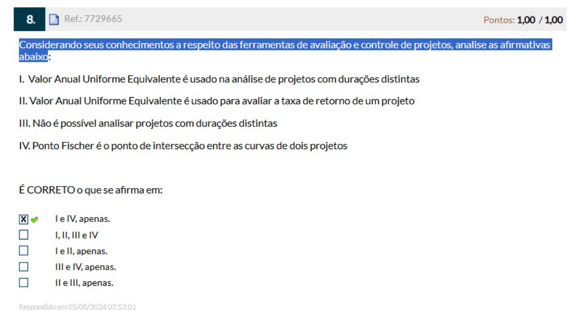<p>8. Ref.: 7729665 Pontos: Considerando seus conhecimentos a respeito das ferramentas de avaliação e controle de projetos, analise as afirmativas abaixo: I. Valor Anual Uniforme Equivalente é usado na análise de projetos com durações distintas II. Valor Anual Uniforme Equivalente é usado para avaliar a taxa de retorno de um projeto III. Não é possível analisar projetos com durações distintas IV. Ponto Fischer é o ponto de intersecção entre as curvas de dois projetos É CORRETO o que se afirma em: X e IV, apenas. I, II, III e IV e II, apenas. III e apenas. II e III, apenas. Respondido em 05/08/2024 07:53:01</p>