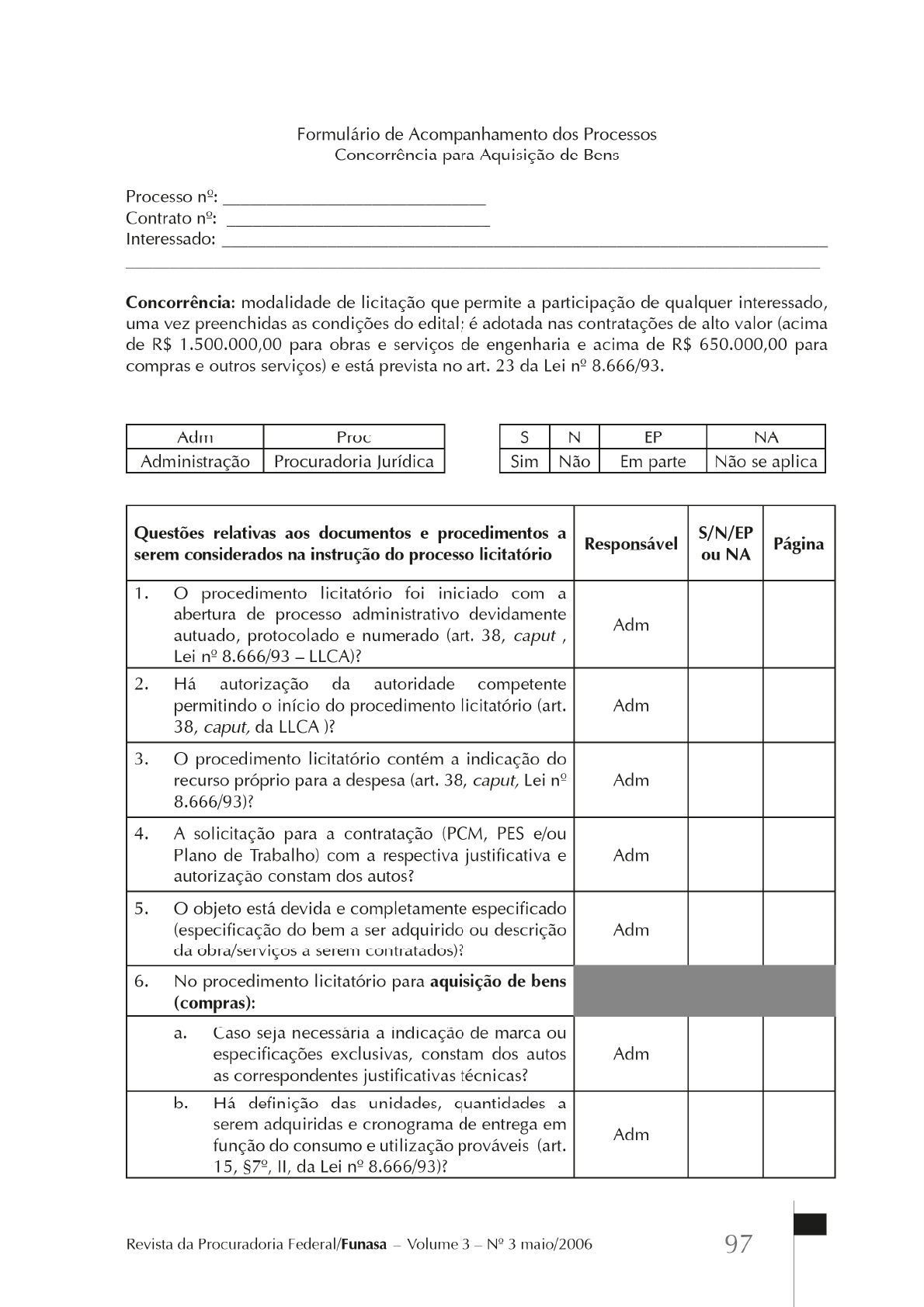 <p>Formulário de Acompanhamento dos Processos Concorrência para Aquisição de Bens Processo Contrato Interessado: Concorrência: modalidade de licitação que permite a participação de qualquer interessado, uma vez preenchidas as condições do edital; é adotada nas contratações de alto valor (acima de R$ 1.500.000,00 para obras e serviços de engenharia e acima de R$ 650.000,00 para compras e outros serviços) e está prevista no art. 23 da Lei 8.666/93. Adm S N EP NA Administração Procuradoria Jurídica Sim Não Em parte Não se aplica Questões relativas aos documentos e procedimentos a S/N/EP Responsável serem considerados na instrução do processo licitatório ou NA Página 1. O procedimento licitatório foi iniciado com a abertura de processo administrativo devidamente Adm autuado, protocolado e numerado (art. 38, caput Lei n° 8.666/93 LLCA)? 2. Há autorização da autoridade competente permitindo o início do procedimento licitatório (art. Adm 38, caput, da LLCA )? 3. O procedimento licitatório contém a indicação do recurso próprio para a despesa (art. 38, caput, Lei Adm 8.666/93)? 4. A solicitação para a contratação (PCM, PES e/ou Plano de Trabalho) com a respectiva justificativa e Adm autorização constam dos autos? 5. O objeto está devida e completamente especificado (especificação do bem a ser adquirido ou descrição Adm da obra/serviços a serem contratados)? 6. No procedimento licitatório para aquisição de bens (compras): a. Caso seja necessária a indicação de marca ou especificações exclusivas, constam dos autos Adm as correspondentes justificativas técnicas? b. Há definição das unidades, quantidades a serem adquiridas e cronograma de entrega em Adm função do consumo e utilização prováveis (art. 15, II, da Lei n° 8.666/93)? Revista da Procuradoria Federal/Funasa Volume 3 - N° 3 maio/2006 97</p><p>Questões relativas aos documentos e procedimentos a S/N/EP Responsável Página serem considerados na instrução do processo licitatório ou NA C. A compra atende ao princípio da padronização, que imponha compatibilidade Adm de especificações técnicas e de desempenho (art. 15, I, LLCA)? d. As especificações fazem menção às condições de guarda/armazenamento que não permitam a Adm deterioração do material, bem como à garantia dos produtos (art. 15, III, da LLCA)? 7. Constam dos autos a justificativa/comprovação que os preços unitários estimados estão compatíveis Adm com os praticados no mercado e no âmbito da administração pública? 8. A modalidade de licitação está compatível com os limites estabelecidos pelo art. 23 da Lei 8.666/93 (acima de R$ 1.500.000,00 para obras e serviços de Adm engenharia e acima de R$ 650.000,00 para compras e outros serviços)? 9. Existe estimativa do impacto da despesa no exercício em que deva entrar em Adm vigor e nos dois exercícios seguintes (art. 16, I, da Lei Complementar 101/2000)? 10. Existe declaração do ordenador de despesa de que gasto necessário à realização do procedimento licitatório e à conseqüente contratação tem adequação orçamentária e financeira com a lei Adm orçamentária anual e compatibilidade com plano plurianual e com a lei de diretrizes orçamentárias (art. 16, II, da Lei Complementar 101/2000)? 11. Os autos foram instruídos com ato de designação da comissão de licitação (art. 38, III, da Lei Adm 8.666/93)? 12. Há decisão da autoridade administrativa justificando porquê de cada um dos requisitos exigidos para a Adm habilitação/qualificação dos licitantes? 13. Os autos foram instruídos com Edital e respectivos Adm anexos (art. 38, I, da LLCA)? 14. O edital foi devidamente publicado como determina Adm art. 21 da Lei 8.666/93? 15. O preâmbulo do Edital contém (art. 40, Lei n° 8.666/93): a. O número de ordem em série anual? Adm 98 Fundação Nacional de Saúde</p><p>Questões relativas aos documentos e procedimentos a S/N/EP Responsável Página serem considerados na instrução do processo licitatório ou NA b. O nome do órgão interessado (promotor da Adm licitação)? C. A modalidade de licitação? Adm d. O regime de execução do objeto da licitação? Adm e. O tipo da licitação? Adm f. A menção de que a licitação será regida pela Lei 8.666/93 e demais normas aplicáveis à Adm espécie? g. O local, data e horário para: Adm i. exame e aquisição do edital e seus Adm anexos? ii. recebimento da documentação e Adm proposta? iii.se for caso, início da abertura dos Adm envelopes? iv. eventuais vistorias? Adm h. O local, horário e meios de comunicação à distância (telefone, fax, e-mail, etc.) Adm onde poderão ser obtidas informações e esclarecimentos relativos à licitação? 16. O edital indica sucinta e claramente objeto da Adm licitação (art. 40, I, Lei 8.666/93)? 17. O projeto básico, projeto executivo ou especificações detalhadas fazem parte do edital (art. 40, I, da Adm Lei 8.666/93)? 18. O edital faz menção à documentação necessária para (art. 40, VI, da Lei n° 8.666/93): a. a habilitação jurídica (art. 27, I, c/c art. 28, Adm ambos da Lei 8.666/93)? b. a qualificação técnica (art. 27, II, c/c art. 30, Adm ambos da LLCA)? C. a qualificação econômico-financeira (art. 27, Adm III, c/c art. 31, todos da LLCA)? d. a comprovação da regularidade fiscal (art. 27, Adm IV, c/c art. 29, todos da LLCA)? Revista da Procuradoria Federal/Funasa Volume 3 3 maio/2006 99</p><p>Questões relativas aos documentos e procedimentos a S/N/EP Responsável Página serem considerados na instrução do processo licitatório ou NA 19. O edital exige cumprimento do disposto no art. 7°, XXXIII da Constituição Federal (proibição de Adm trabalho infantil) como determina O art. 27,V, da LLCA? 20. O edital prevê a possibilidade de qualquer cidadão impugná-lo por irregularidade apresentada no prazo Adm de cinco dias úteis (art. 41, Lei 8.666/93)? 21. O edital indica a forma de apresentação da
