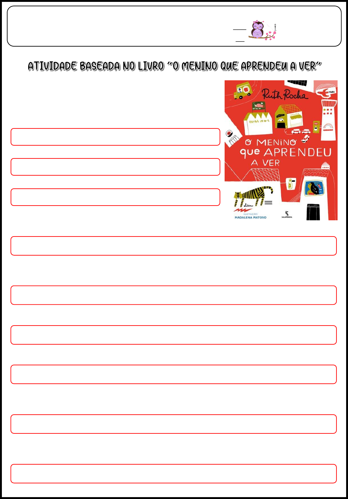 <p>Escola____________________________________________________________________</p><p>Professor(a): _________________________ Data: ____________</p><p>Aluno(a): _____________________________________________</p><p>1) Observe a capa do livro “O menino que aprendeu a ver” e</p><p>copie algumas informações técnicas.</p><p>a) Autora:</p><p>b) Ilustradora:</p><p>c) Editora que publicou esta edição:</p><p>2) Após a leitura do livro, responda.</p><p>a) Quem é o personagem principal da história?</p><p>b) Antes de “aprender a ver”, ao olhar para as placas nas ruas e para a frente do ônibus, o que</p><p>Joãozinho via?</p><p>c) Que outro título você daria ao texto?</p><p>d) Quem ajudou Joãozinho a ver as palavras que ele estava aprendendo a ler?</p><p>e) Escreva o nome de um(a) professor(a) que mais marcou a sua trajetória escolar com seus</p><p>ensinamentos?</p><p>f) “Algumas figuras João entendia: flores, cafés, meninas... Mas havia outros sinais que Joãozinho</p><p>não sabia.” Sobre quais sinais o texto está se referindo?</p><p>Viviane Aragão</p><p>@sugestoes.pedagogicas</p><p>g) Qual meio de transporte Joãozinho utilizava para ir à escola?</p><p>h) Ao chegar em casa, João falou com seu pai que cada vez que ele ia para a escola as letras que</p><p>ele estava aprendendo eram pintadas nas placas, nos livros, nos pacotes. Qual foi a explicação</p><p>que o pai deu para o menino?</p><p>3) Qual a alternativa melhor justifica a escolha do título “O menino que aprendeu a ver” para a</p><p>história?</p><p>(A) Joãozinho tinha dificuldade de enxergar e ao ir para o colégio seu problema foi resolvido.</p><p>(B) Joãozinho foi aos poucos vendo nas palavras as letras que estava aprendendo na escola e com</p><p>isso, passou a descobrir as palavras que antes ele considerava desenhos sem sentido.</p><p>(C) Joãozinho foi matriculado em um colégio para aprender a ver melhor os desenhos.</p><p>(D) Após andar de ônibus Joãozinho aprendeu a ver as palavras.</p><p>4) Em qual momento João percebeu que já sabia ler?</p><p>(A) Ao reconhecer nas placas a letra A que a professora havia ensinado.</p><p>(B) Ao olhar para a placa e ver vários desenhos sem sentido.</p><p>(C) Ao ver a figura de um café em cima dos prédios.</p><p>(D) Ao olhar para a placa da rua onde morava, reunir as letras e formar o nome Rua do Sol.</p><p>5) Por que é importante estudar?</p><p>6) Agora que Joãozinho aprendeu a ler, ajude-o a organizar as letras e a descobrir 5 características</p><p>de um bom estudante.</p><p>O D A Z I N A G R O</p><p>_________________</p><p>O V I T A P I C I T R A P</p><p>____________________</p><p>O S O I D U T S E</p><p>_________________</p><p>L E V Á S N O P S E R</p><p>__________________</p><p>O U D Í S S A</p><p>______________</p><p>___</p><p>Viviane Aragão</p><p>@sugestoes.pedagogicas</p><p>Escola______________________________________________</p><p>Professor(a): _______________________ Data: ____________</p><p>Aluno(a): ___________________________________________</p><p>ATIVIDADE BASEADA NO LIVRO “O MENINO QUE APRENDEU A VER”</p><p>1) Observe a imagem e complete as frases</p><p>para construir um texto, de acordo com o livro</p><p>“O menino que aprendeu a ver”.</p><p>Escola______________________________________________</p><p>Professor(a): _______________________ Data: ____________</p><p>Aluno(a): ___________________________________________</p><p>11 DE AGOSTO – DIA DO ESTUDANTE</p><p>ENTREVISTA</p><p>a) Nome: _______________________________________________</p><p>b) Idade: ____________________</p><p>c) Série que está cursando: _____________________</p><p>d) Nome da escola em que estuda: ___________________________</p><p>_______________________________________________________</p><p>e) Horário em que estuda: __________________________________</p><p>f) Disciplina que mais gosta: ________________________________</p><p>g) Disciplina que mais tem dificuldade: ________________________</p><p>h) Quantos dias da semana você tem dedicado aos estudos? ______</p><p>i) Em qual lugar da sua casa você costuma estudar? _____________</p><p>_______________________________________________________</p><p>j) Professor(a) que marcou sua vida: ______________________</p><p>k) Um fato positivo que aconteceu na escola que te marcou:</p><p>_______________________________________________________</p><p>Escreva uma mensagem sobre a importância de estudar para a vida</p><p>das pessoas!</p><p>Certa manhã, ________________________________________</p><p>______________________________________________________</p><p>______________________________________________________</p><p>______________________________________________________</p><p>______________________________________________________</p><p>De repente, _________________________________________</p><p>______________________________________________________</p><p>______________________________________________________</p><p>______________________________________________________</p><p>______________________________________________________</p><p>Finalmente, _________________________________________</p><p>______________________________________________________</p><p>______________________________________________________</p><p>______________________________________________________</p><p>______________________________________________________</p><p>@</p><p>s</p><p>u</p><p>g</p><p>e</p><p>s</p><p>to</p><p>e</p><p>s</p><p>.p</p><p>e</p><p>d</p><p>a</p><p>g</p><p>o</p><p>g</p><p>ic</p><p>a</p><p>s</p><p>@sugestoes.pedagogicas</p>