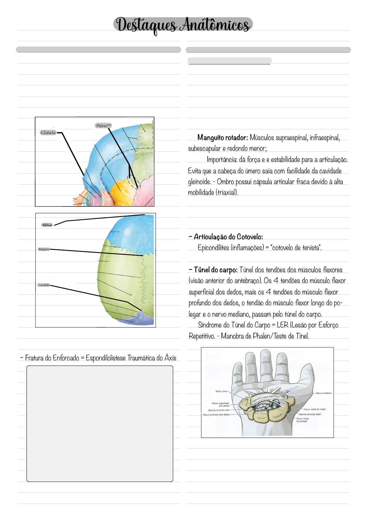 <p>Destaques Anatômicos</p><p>Osteologia</p><p>~ Glabela;</p><p>~ Ptério;</p><p>~ Lambda;</p><p>~ Bregma;</p><p>~ Vértice (ponto mais alto - em posição anatômica.</p><p>~ Fratura do Enforcado = Espondilolistese Traumática do Áxis</p><p>A fratura dos elementos posteriores (lâmina, facetas, pedículos ou “pars”) do</p><p>Axis geralmente relacionada com mecanismo de hiperextensão provocadas</p><p>por acidentes automobilísticos, mergulho e quedas e têm sido chamadas de</p><p>“fratura do enforcado” desde 1965 quando Schneider descreveu este tipo</p><p>de lesão nos enforcamentos judiciais. Embora o mecanismo de lesão</p><p>relacionado aos enforcamentos seja distração e hiperextensão, a forma mais</p><p>relacionada aos acidentes automobilísticos é tipicamente o resultado de</p><p>hiperextensão, compressão e flexão de rebote. A incidência de trauma</p><p>craniano é alta quando relacionada a este mecanismo. O termo</p><p>Espondilolistese Traumática do Axis (ETA) tem sido sugerido como mais</p><p>apropriado exatamente pela razão do mecanismo de lesão mais comumente</p><p>encontrado nas desacelerações (quedas e acidentes automobilísticos) ser</p><p>diverso da fratura clássica do enforcamento. De forma geral, correspondem</p><p>de 7 a 20% das fraturas cervicais, e 20 a 23% das fraturas do Axis.</p><p>Miologia</p><p>Manguito rotador: Músculos supraespinal, infraespinal,</p><p>subescapular e redondo menor;</p><p>Importância: dá força e e estabilidade para a articulação.</p><p>Evita que a cabeça do úmero saia com facilidade da cavidade</p><p>gleinoide. - Ombro possui cápsula articular fraca devido à alta</p><p>mobilidade (triaxial).</p><p>MÚSCULOS SUPERIORES</p><p>~ Complexo Articular do Ombro:</p><p>Bursite: inflamação da bolsa sinovial que esta no espaço</p><p>subacromial.</p><p>Lesão Traumática do Manguito Rotador: associado à</p><p>luxação gleno-umeral.</p><p>Lesão do Cabo Longo do Bíceps = ruptura do tendão da</p><p>cabeça longa do m. bíceps braquial. - deformidade (Sinal de</p><p>Popeye).</p><p>~ Articulação do Cotovelo:</p><p>Epicondilites (inflamações) = "cotovelo de tenista".</p><p>~ Túnel do carpo: Túnel dos tendões dos músculos flexores</p><p>(visão anterior do antebraço). Os 4 tendões do músculo flexor</p><p>superficial dos dedos, mais os 4 tendões do músculo flexor</p><p>profundo dos dedos, o tendão do músculo flexor longo do po-</p><p>legar e o nervo mediano, passam pelo túnel do carpo.</p><p>Síndrome do Túnel do Carpo = LER (Lesão por Esforço</p><p>Repetitivo. - Manobra de Phalen/Teste de Tinel.</p><p>~ Túneis dos Extensores: São seis túneis formados por bai-</p><p>nhas sinoviais que servem para diminuir o atrito entre os ten-</p><p>dões e a compressão do retináculo dos extensores.</p><p>Vertice</p><p>MÚSCULOS INFERIORES</p><p>~ Retináculo dos músculos flexores = ligamento carpal</p><p>transverso (teto do túnel do carpo): Formado por tecido con-</p><p>juntivo denso, estabiliza e mantém no lugar os tendões dos</p><p>músculos flexores.</p><p>~ Retináculo dos músculos extensores:</p><p>~ Fáscia lata e Trato iliotibial</p><p>~ Trígono femoral = triângulo de Scarpa = espaço delimitado</p><p>pelo ligamento inguinal, músculo adutor longo e o músculo sar-</p><p>tório.</p><p>~ Canal dos adutores = canal de Hunter: passagem estreita</p><p>no terço médio da coxa que conduz os ramos descendentes ge-</p><p>nicular e musculares da artéria femoral, e suas veias correspon-</p><p>dentes, o nervo safeno e o nervo para o vasto medial. O canal</p><p>dos adutores termina passando através do hiato adutor e en-</p><p>trando na fossa poplítea. O canal é delimitado por:</p><p>Anterolateralmente: músculo vasto medial</p><p>Posteromedialmente: músculos adutor magno e adutor longo</p><p>Anteromedialmente: fáscia subsartorial e músculo sartório</p><p>O canal dos adutores tem vários significados clínicos, um dos</p><p>quais é fornecer acesso para ser realizada anestesia nos proce-</p><p>dimentos cirúrgicos da perna e do pé.</p><p>túneis dos extensores</p><p>retináculo dos extensores</p><p>pectíneo</p><p>NV E</p><p>iliosoas</p><p>~ Pata de Ganso: Os tendões dos músculos sartório, grácil e</p><p>semitendíneo inserem-se em conjunto e constituem o chamado</p><p>“pes anserinus” ou pata de ganso.</p><p>~ Fossa poplítea: depressão rasa localizada na parte posterior</p><p>da articulação do joelho. Os ossos da fossa poplítea são o fê-</p><p>mur e a tíbia.</p><p>~ Retináculo dos músculos extensores = ligamento crural</p><p>cruzado: possui forma de “Y”, encontra-se mais distal e esten-</p><p>de-se entre o calcâneo, o maléolo medial e a aponeurose (apo-</p><p>nevrose) plantar.</p><p>~ Retináculo dos músculos fibulares: O retináculo fibular</p><p>(peroneal) superior se estende entre o maléolo lateral e o calcâ-</p><p>neo. O retináculo fibular (peroneal) inferior se estende entre o</p><p>retináculo inferior dos extensores dos músculos anteriores da</p><p>perna e o calcâneo.</p><p>~ Retináculo dos músculos flexores: situa-se na porção in-</p><p>terna e posterior do tornozelo e tem por função conter e guiar</p><p>os tendões flexores mediais e o principal feixe vásculo-nervoso</p><p>do pé (artéria, veias e nervos).</p>