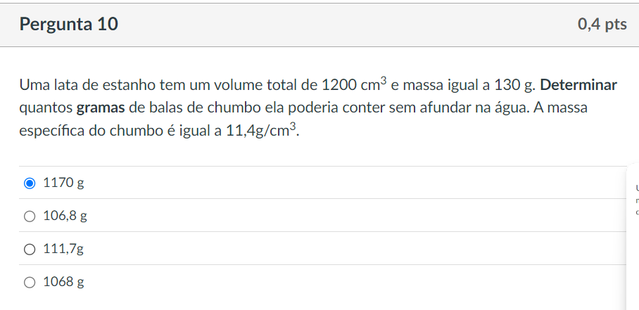 <p>Pergunta 10 0,4 pts Uma lata de estanho tem um volume total de 1200 e massa igual a 130 g. Determinar quantos gramas de balas de chumbo ela poderia conter sem afundar na água. A massa específica do chumbo é igual a 1170 g 106,8 g 111,7g 1068 g</p>