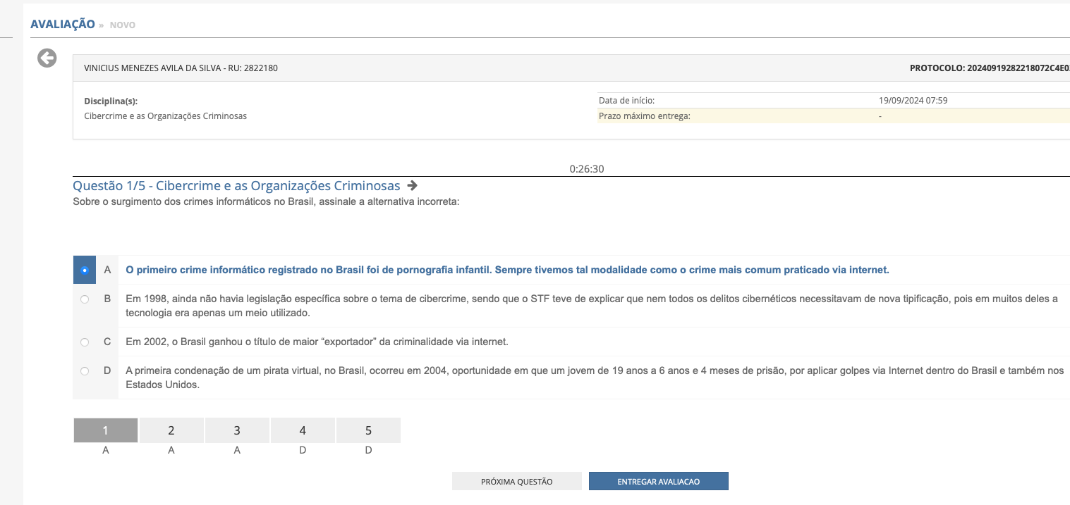<p>AVALIAÇÃO NOVO VINICIUS MENEZES AVILA DA SILVA RU: 2822180 PROTOCOLO: 20240919282218072C4E0 Disciplina(s): Data de início: 19/09/2024 07:59 Cibercrime e as Organizações Criminosas Prazo máximo entrega: 0:26:30 Questão 1/5 Cibercrime e as Organizações Criminosas Sobre surgimento dos crimes informáticos no Brasil, assinale a alternativa incorreta: A o primeiro crime informático registrado no Brasil foi de pornografia infantil. Sempre tivemos tal modalidade como crime mais comum praticado via internet. B Em 1998, ainda não havia legislação específica sobre tema de cibercrime, sendo que STF teve de explicar que nem todos os delitos cibernéticos necessitavam de nova tipificação, pois em muitos deles a tecnologia era apenas um meio utilizado. C Em 2002, Brasil ganhou título de maior "exportador" da criminalidade via internet. D A primeira condenação de um pirata virtual, no Brasil, ocorreu em 2004, oportunidade em que um jovem de 19 anos a 6 anos e 4 meses de prisão, por aplicar golpes via Internet dentro do Brasil e também nos Estados 1 2 3 4 5 A A A D D PRÓXIMA QUESTÃO ENTREGAR</p>