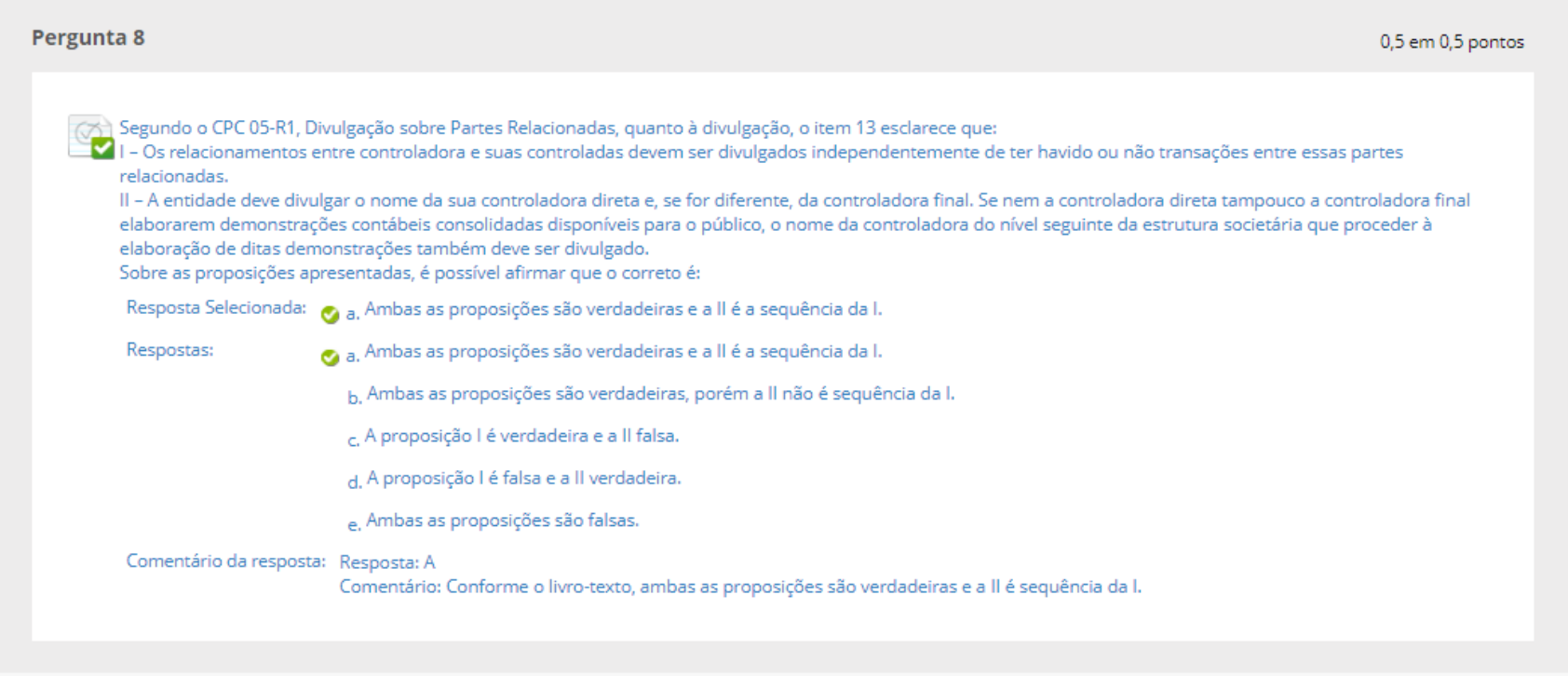 <p>Pergunta 8 0,5 em 0,5 pontos Segundo o CPC 05-R1, Divulgação sobre Partes Relacionadas, quanto à divulgação, o item 13 esclarece que: - Os relacionamentos entre controladora e suas controladas devem ser divulgados independentemente de ter havido ou não transações entre essas partes relacionadas. II - - A entidade deve divulgar o nome da sua controladora direta e, se for diferente, da controladora final. Se nem a controladora direta tampouco a controladora final elaborarem demonstrações contábeis consolidadas disponíveis para o público, o nome da controladora do nível seguinte da estrutura societária que proceder à elaboração de ditas demonstrações também deve ser divulgado. Sobre as proposições apresentadas, é possível afirmar que o correto é: Resposta Selecionada: a. Ambas as proposições são verdadeiras e a é a sequência da Respostas: a. Ambas as proposições são verdadeiras e a é a sequência da b. Ambas as proposições são verdadeiras, porém a não é sequência da I. c. A proposição é verdadeira e a falsa. d. A proposição I é falsa e a verdadeira. e. Ambas as proposições são Comentário da resposta: Resposta: A Comentário: Conforme o livro-texto, ambas as proposições são verdadeiras e a é sequência da</p>