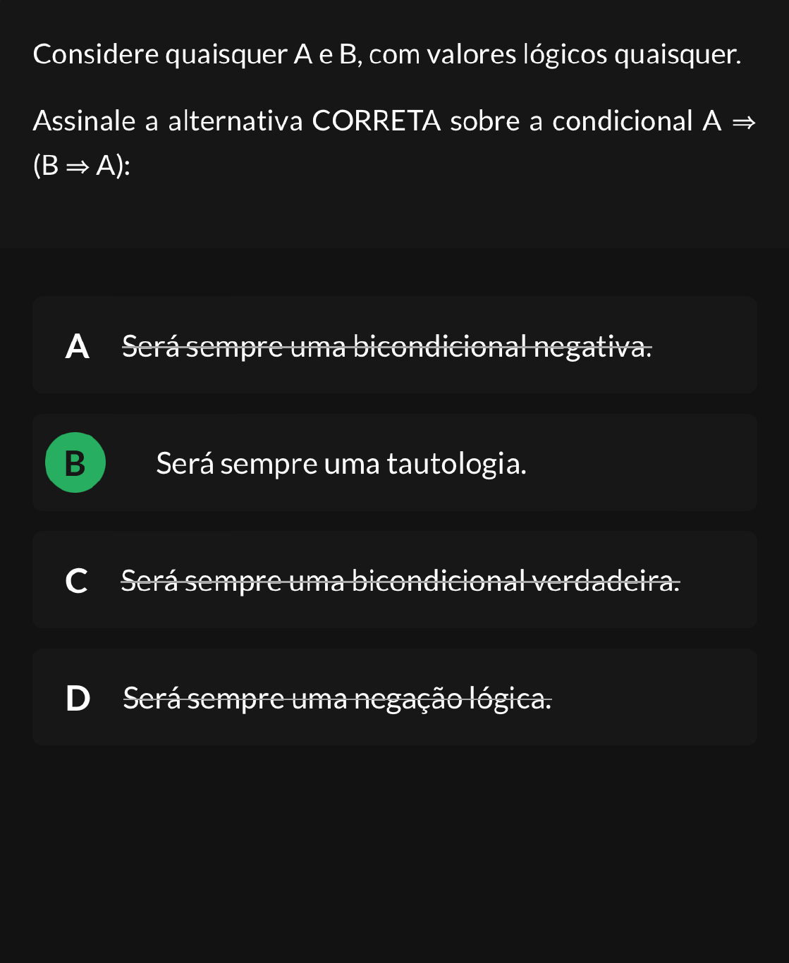 <p>Considere quaisquer A e B, com valores lógicos quaisquer. Assinale a alternativa CORRETA sobre a condicional A (B A): A Será sempre uma bicondicional negativa. Será sempre uma tautologia. Serásempre uma bicondicional verdadeira. D Será sempre uma negação lógica.</p>