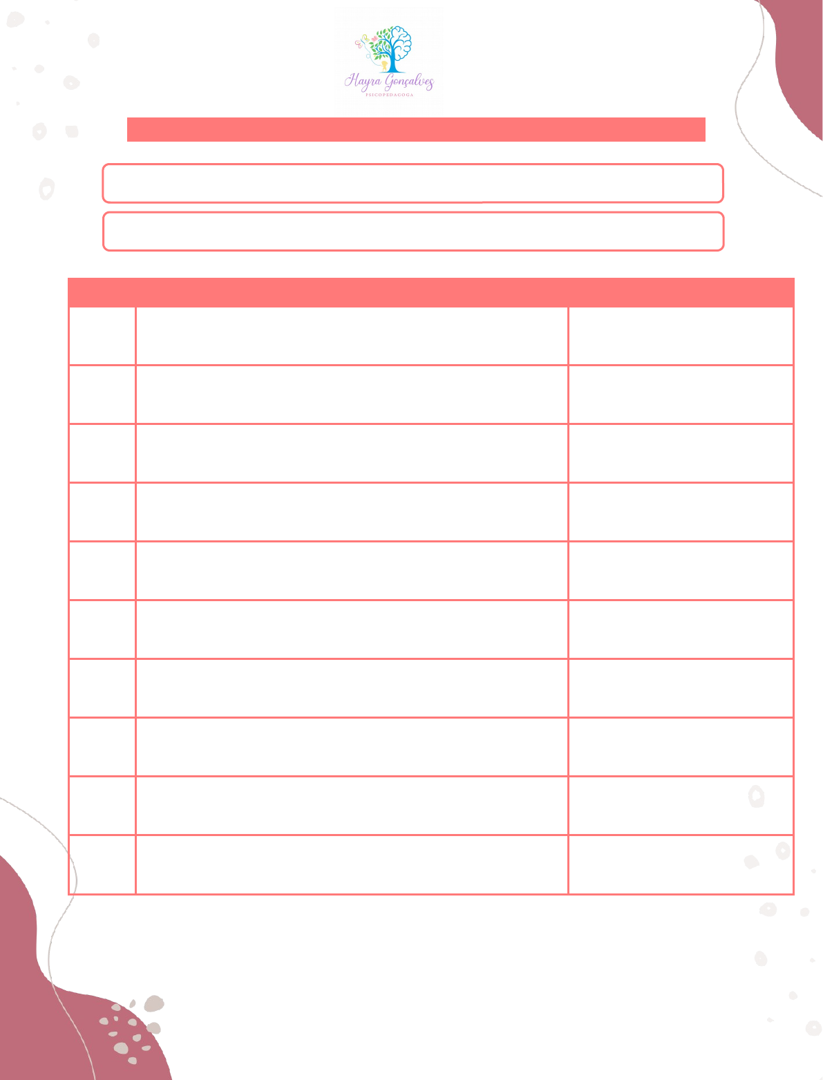 <p>ROTEIRO AVALIATIVO</p><p>PACIENTE: Isabela</p><p>QUEIXA: TDAH</p><p>SESSÃO</p><p>HABILIDADE A SER AVALIADA NA SESSÃO</p><p>TESTE / JOGO / RECURSO</p><p>01</p><p>Anamnese, EOCA, Sondagem da escrita, Leitura</p><p>Conversa de vinculo</p><p>02</p><p>Testes Projetivas</p><p>Conversa informal</p><p>03</p><p>Avaliação Psicomotora</p><p>Jogo das emoções</p><p>04</p><p>Testes acadêmicos</p><p>Jogo torre maluca</p><p>05</p><p>Testes acadêmicos</p><p>Quebra cabeça</p><p>06</p><p>07</p><p>Funções Executivas</p><p>08</p><p>Reunião escolar</p><p>09</p><p>Linguagem receptiva... Escita de palavras simples, ortografia,consc. Fonologica,leitura</p><p>Princípio alfabético...</p><p>Consiciência fonêmica ee silábica..</p><p>Escrita do noome........</p><p>Raciocínio Lógico matemático: lentidão? Formas, nomeação numéricas, relações números e quantidades, antecessor e sucessor, sequência numérica, quadro operações, ditado</p><p>10</p><p>Entrevista inicial e anamnese, SnapIv,confias, IAR,....</p><p>Audiobilização</p><p>Tac (teste de atenção por cancelamento)</p><p>Teste qualitavivos(campo academico)</p><p>Multiplicação, subtração, (reversibilidade)divisão...</p><p>Rua Principal,231, Cariacica, ES, CEP: 29153-078</p><p>Email: hayragoncalves@gmail.com | 27 998631608</p><p>2</p><p>image2.png</p><p>image1.png</p><p>Rua</p><p>Principal</p><p>,</p><p>231</p><p>,</p><p>Cariacica,</p><p>ES</p><p>, CEP:</p><p>29153</p><p>-</p><p>078</p><p>Email:</p><p>hayragoncalves@gmail.</p><p>com |</p><p>27 998631608</p><p>ROTEIRO AVALIATIVO</p><p>SESSÃO</p><p>HABILIDADE A SER AVALIADA NA SESSÃO</p><p>TESTE / JOGO / RECURSO</p><p>01</p><p>Anamnese, EOCA, Sondagem da escrita, Leitura</p><p>C</p><p>onversa</p><p>de vi</p><p>nculo</p><p>02</p><p>Testes Projetivas</p><p>Conversa informal</p><p>03</p><p>Avaliação Psicomotora</p><p>Jogo das emoções</p><p>04</p><p>Tes</p><p>tes acadêmicos</p><p>Jo</p><p>go torre maluca</p><p>05</p><p>Testes acadêmicos</p><p>Q</p><p>uebra</p><p>cabeça</p><p>06</p><p>07</p><p>Fun</p><p>çõ</p><p>es</p><p>Executivas</p><p>08</p><p>Reunião escolar</p><p>09</p><p>Linguagem receptiva... Escita de palavras simples, ortografia,consc. Fonologica,leitura</p><p>Princ</p><p>í</p><p>pio alfab</p><p>é</p><p>tico...</p><p>Consici</p><p>ê</p><p>ncia fon</p><p>ê</p><p>mica ee sil</p><p>á</p><p>bica..</p><p>Escrita do noome........</p><p>Racioc</p><p>í</p><p>nio L</p><p>ó</p><p>gico</p><p>matem</p><p>á</p><p>tico: lentid</p><p>ã</p><p>o?</p><p>Formas, nomea</p><p>çã</p><p>o num</p><p>é</p><p>ricas, rela</p><p>çõ</p><p>es</p><p>n</p><p>ú</p><p>meros e quantidades, antecessor e sucessor,</p><p>sequ</p><p>ê</p><p>ncia num</p><p>é</p><p>rica, quadro opera</p><p>çõ</p><p>es, ditado</p><p>10</p><p>Entrevista inicial e anamnese</p><p>,</p><p>SnapIv,confias, IAR,....</p><p>Audiobiliza</p><p>çã</p><p>o</p><p>Tac (teste de aten</p><p>çã</p><p>o por</p><p>cancelamento)</p><p>Teste qualitavivos(campo academico</p><p>)</p><p>Multiplica</p><p>çã</p><p>o, subtra</p><p>çã</p><p>o,</p><p>(reversibilidade)divis</p><p>ã</p><p>o</p><p>...</p><p>Rua Principal,231, Cariacica, ES, CEP: 29153-078</p><p>Email: hayragoncalves@gmail.com | 27 998631608</p><p>ROTEIRO AVALIATIVO</p><p>SESSÃO HABILIDADE A SER AVALIADA NA SESSÃO TESTE / JOGO / RECURSO</p><p>01</p><p>Anamnese, EOCA, Sondagem da escrita, Leitura</p><p>Conversa de vinculo</p><p>02</p><p>Testes Projetivas</p><p>Conversa informal</p><p>03</p><p>Avaliação Psicomotora</p><p>Jogo das emoções</p><p>04</p><p>Testes acadêmicos</p><p>Jogo torre maluca</p><p>05 Testes acadêmicos Quebra cabeça</p><p>06</p><p>07</p><p>Funções Executivas</p><p>08</p><p>Reunião escolar</p><p>09</p><p>Linguagem receptiva... Escita de palavras simples, ortografia,consc. Fonologica,leitura</p><p>Princípio alfabético...</p><p>Consiciência fonêmica ee silábica..</p><p>Escrita do noome........</p><p>Raciocínio Lógico matemático: lentidão?</p><p>Formas, nomeação numéricas, relações</p><p>números e quantidades, antecessor e sucessor,</p><p>sequência numérica, quadro operações, ditado</p><p>10</p><p>Entrevista inicial e anamnese, SnapIv,confias, IAR,....</p><p>Audiobilização</p><p>Tac (teste de atenção por cancelamento)</p><p>Teste qualitavivos(campo academico)</p><p>Multiplicação, subtração,</p><p>(reversibilidade)divisão...</p>