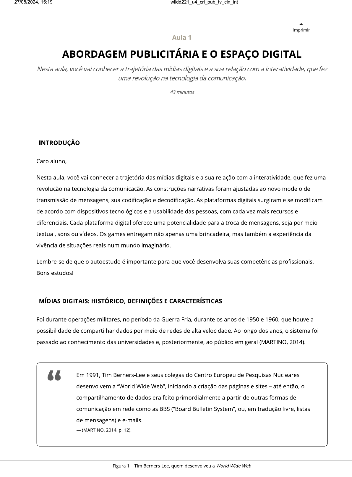 <p>27/08/2024, 15:19 Imprimir Aula 1 ABORDAGEM PUBLICITÁRIA E o ESPAÇO DIGITAL Nesta aula, você vai conhecer a trajetória das mídias digitais e a sua relação com a interatividade, que fez uma revolução na tecnologia da comunicação. 43 minutos INTRODUÇÃO Caro aluno, Nesta aula, você vai conhecer a trajetória das mídias digitais e a sua relação com a interatividade, que fez uma revolução na tecnologia da comunicação. As construções narrativas foram ajustadas ao novo modelo de transmissão de mensagens, sua codificação e decodificação. As plataformas digitais surgiram e se modificam de acordo com dispositivos tecnológicos e a usabilidade das pessoas, com cada vez mais recursos e diferenciais. Cada plataforma digital oferece uma potencialidade para a troca de mensagens, seja por meio textual, sons ou vídeos. Os games entregam não apenas uma brincadeira, mas também a experiência da vivência de situações reais num mundo imaginário. Lembre-se de que o autoestudo é importante para que você desenvolva suas competências profissionais. Bons estudos! MÍDIAS DIGITAIS: HISTÓRICO, DEFINIÇÕES E CARACTERÍSTICAS Foi durante operações militares, no período da Guerra Fria, durante os anos de 1950 e 1960, que houve a possibilidade de compartilhar dados por meio de redes de alta velocidade. Ao longo dos anos, o sistema foi passado ao conhecimento das universidades e, posteriormente, ao público em geral (MARTINO, 2014). Em 1991, Tim Berners-Lee e seus colegas do Centro Europeu de Pesquisas Nucleares desenvolvem a "World Wide Web", iniciando a criação das páginas e sites até então, o compartilhamento de dados era feito primordialmente a partir de outras formas de comunicação em rede como as BBS ("Board Bulletin System", ou, em tradução livre, listas de mensagens) e e-mails. (MARTINO, 2014, p. 12). Figura 1 Tim Berners-Lee, quem desenvolveu a World Wide Web</p><p>Fonte: Wikimedia Commons. Em oposição à Web 1.0, que operava em relação às páginas relativamente fixas, como blogs e navegadores, a chamada Web 2.0 ocorreu com a expansão da internet a partir dos anos 2000. Essa nova fase se caracterizou pela produção e consumo de conteúdos pelos próprios usuários. Com o surgimento do Google, o uso da internet logo se ampliou para além das pesquisas acadêmicas. No Brasil, ela começa a ter maior usabilidade por volta de 1994, aliado à comercialização de computadores, principalmente comerciais. No ano seguinte, houve uma explosão das redes sociais, que se expandiram por meio de outros dispositivos como os smartphones e tablets. (MARTINO, 2014). Algumas características das novas mídias são importantes. Segundo Lev Manovich (2001 apud Martino 2014): Representação numérica: são parte de um código digital, uma sequência de e 1s. Quando uma foto é digitalizada, vemos na tela a imagem formada por pixels, que é um cálculo feito pelo computador. Modularidade: são compostas por partes separadas entre Os componentes podem ser reorganizados em códigos maiores, formado o que é visto, lido ou ouvido. Um portal de notícias é formado por diversas partes, cada uma delas possui tempo de exibição diferente, por exemplo: notícias (permanecem durante horas na página principal) e anúncios (mudam a cada atualização da página). Automação: permite antecipar decisões de ações futuras, a partir de análise de atuações recentes, ou seja, trabalhando à frente do indivíduo. Variabilidade: são as constantes mudanças. Nada está fixo e acabado. Novas versões de produto, software, músicas ou filmes podem ser transformadas e divulgadas a qualquer momento.</p><p>27/08/2024, 15:19 Transcodificação: de um lado, estão as imagens, letras e sons; de outro, a lógica matemática do computador. A linguagem da cultura humana é traduzida pela linguagem da máquina. A partir do processamento de informações, desde o final dos anos 1960, caracterizando a chamada Sociedade da Informação, houve uma revolução tecnológica que atingiu diversas classes sociais. Em 1999, o autor Manuell Castells denomina essa nova forma de relacionamento de "sociedade de rede" (PEIXOTO; OLIVEIRA, 2021). Sobre o conceito de mídias digitais, o sociólogo Richard Miskolci compreende que: [...] Mídias digitais são uma forma de se referir aos meios de comunicação contemporâneos baseados no uso de equipamentos eletrônicos conectados em rede, portanto referem-se ao mesmo tempo à conexão e ao seu suporte material. Há formas muito diversas de se conectar em rede e elas se entrecruzam diversamente segundo a junção entre tipo de acesso e equipamento usado [...] - (MISKOLCI, 2011 apud PEIXOTO; OLIVEIRA, 2021, p. 81). VIDEOAULA: MÍDIAS DIGITAIS: HISTÓRICO, DEFINIÇÕES E CARACTERÍSTICAS Após a apresentação da história e suas características, é importante conhecer os termos que são utilizados no contexto da comunicação midiática digital, tais como: Barreira digital (diferenças de acesso), Ciberespaço (espaço em redes digitais), Convergência (interação entre produtos, serviços e meios) e Interatividade (interferência nos sistemas de comunicação digital). Videoaula: Mídias digitais: histórico, definições e características Para visualizar o objeto, acesse seu material digital. CONTEÚDOS E TRANSFORMAÇÕES NAS NARRATIVAS As novas mídias, denominadas digitais, advém da dos meios de comunicação e dos computadores. Não concebemos a vivência digital com um elemento sem o outro, ou seja, "trata-se de uma pluralidade de aparelhos, ferramentas, dispositivos e acessórias, fixos ou móveis, acoplados ou não diretamente aos seres humanos." (MARTINO, 2014, p. 211). São originadas, também, da união de mídias que surgiram antes, como a televisão, o rádio, a imprensa, a fotografia e o cinema. Manovich (2001) apud Fechine (2011), nos anos de 1990, expõe que os computadores se tornam processadores de mídia programando para a linguagem das nova