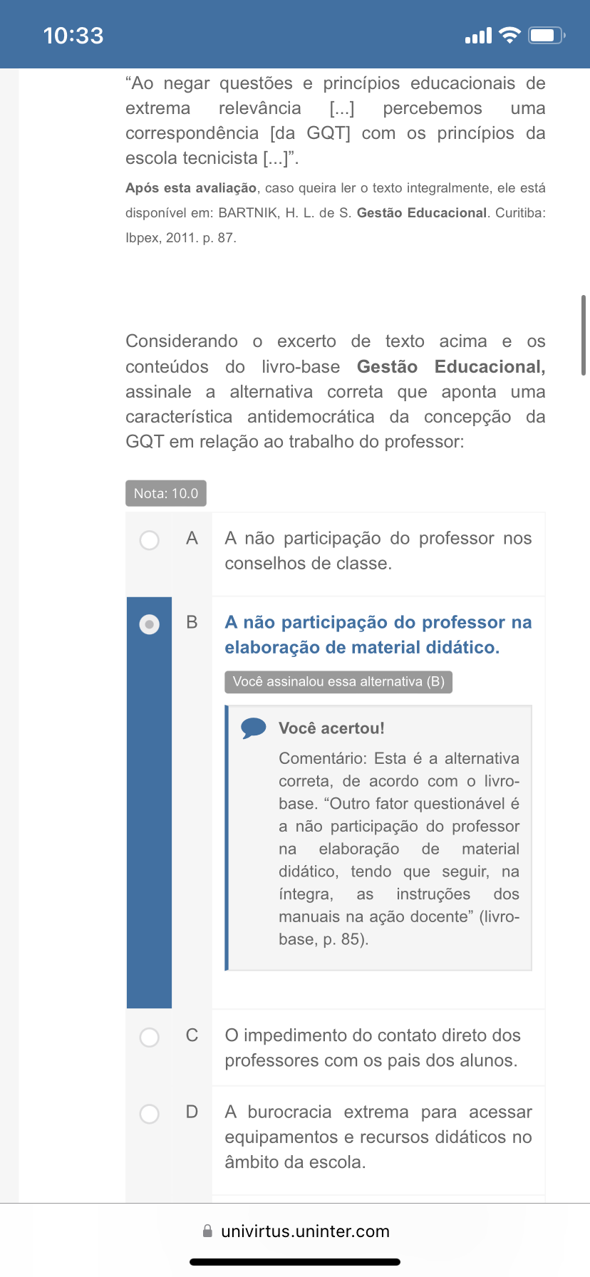 <p>10:33 "Ao negar questões e princípios educacionais de extrema relevância [...] percebemos uma correspondência [da GQT] com os princípios da escola tecnicista [...]". Após esta avaliação, caso queira ler o texto integralmente, ele está disponível em: BARTNIK, H. L. de S. Gestão Curitiba: Ibpex, 2011. p. 87. Considerando o excerto de texto acima e os conteúdos do livro-base Gestão Educacional, assinale a alternativa correta que aponta uma característica antidemocrática da concepção da GQT em relação ao trabalho do professor: Nota: 10.0 A A não participação do professor nos conselhos de classe. B A não participação do professor na elaboração de material didático. Você assinalou essa alternativa (B) Você acertou! Comentário: Esta é a alternativa correta, de acordo com o livro- "Outro fator questionável é a não participação do professor na elaboração de material didático, tendo que seguir, na íntegra, as instruções dos manuais na ação docente" (livro- base, p. 85). C O impedimento do contato direto dos professores com os pais dos alunos. D A burocracia extrema para acessar equipamentos e recursos didáticos no âmbito da escola. univirtus.uninter.com</p>
