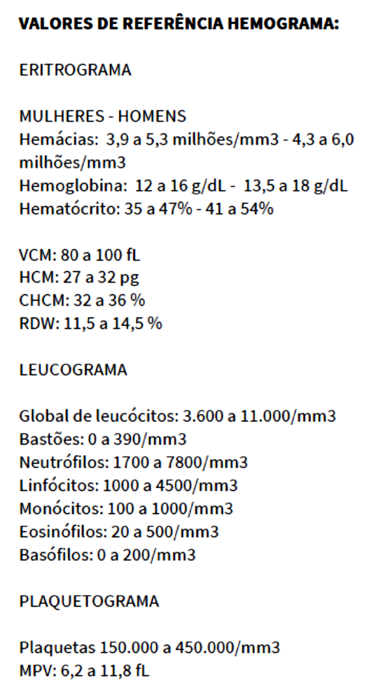 <p>Brenda Barbosa</p><p>Bloco OH</p><p>GT</p><p>❖ Tratado de Hematologia (Zago)</p><p>❖ Resumos MJ</p><p>❖ Resumos TF</p><p>❖ Cecil</p><p>❖ Emergências clínicas USP</p><p>Brenda Barbosa</p><p>Bloco OH</p><p>GT1</p><p>ANEMIA DE DOENÇA CRÔNICA (ADC)</p><p>CONCEITO</p><p>▪ Secundária a estados inflamatórios, infecciosos ou não, e câncer, de etiologia</p><p>multifatorial: relacionado aos altos níveis de citocinas inflamatórias, interleucina 1 (IL-1),</p><p>interleucina 6 (IL-6), fator de necrose tumoral (FNT) e interferons alfa, beta e gama.</p><p>▪ habitualmente leve ou moderada (em doença de base fora de controle), e normocítica</p><p>ou microcítica</p><p>EPIDEMIOLOGIA</p><p>▪ 2ª causa mais comum de anemia (depois da anemia ferropriva).</p><p>▪ tipo mais comum encontrado em pacientes hospitalizados.</p><p>▪ frequência de 27-58% nos pacientes com artrite reumatoide, sendo maior ainda nos</p><p>pacientes em que a doença inflamatória se encontra em atividade clínica.</p><p>ETIOLOGIA</p><p>▪ Nem todas as doenças crônicas cursam com esse tipo de anemia.</p><p>▪ Doenças crônicas que cursam com essa anemia são aquelas que, em geral, aumentam</p><p>as citocinas.</p><p>INFECÇÕES CRÔNICAS</p><p>▪ Tuberculose</p><p>▪ Bronquiectasia</p><p>▪ Pneumonia</p><p>▪ Endocardite</p><p>▪ Miocardite</p><p>▪ Osteomielie</p><p>▪ Meningite</p><p>▪ doença inflamatória pélvica</p><p>▪ infecção pelo HIV</p><p>DOENÇAS INFLAMATÓRIAS CRÔNICAS:</p><p>▪ Artrite reumatoide: É uma das doenças difusas do tecido conjuntivo, tendo caráter</p><p>crônico, inflamatório e progressivo. Caracterizada fundamentalmente pelo</p><p>acometimento do sistema osteoarticular. Contudo, pode assumir aspecto sistêmico,</p><p>comprometendo sistemas extra-articulares (pulmões, coração, olhos, hematopoese).</p><p>▪ Diabetes Mellitus: gera um processo inflamatório crônico vascular.</p><p>▪ Lúpus eritematoso sistêmico (LES)</p><p>▪ Doença de Crohn</p><p>▪ Sarcoidose</p><p>▪ DPOC</p><p>▪ DRC</p><p>▪ ICC</p><p>DOENÇAS NEOPLÁSICAS</p><p>▪ Linfoma de Hodgkin</p><p>▪ Linfoma não Hodgkin</p><p>▪ Mieloma múltiplo</p><p>▪ Carcinoma</p><p>FISIOPATOLOGIA</p><p>MECANISMOS</p><p>▪ A liberação de citocinas inflamatórias, com a participação de monócitos e macrófagos</p><p>são fundamentais para ADC.</p><p>1. sobrevida das hemácias→ hiperatividade do sistema mononuclear fagocitário, com</p><p>remoção dos eritrócitos entre 80-90 dias (normal é 110-120)</p><p>2. resposta medular à eritropoetina→ Eritropoiese não aumenta de acordo com o grau</p><p>de anemia (pode aumentar, mas não proporcionalmente à anemia)</p><p>Brenda Barbosa</p><p>Bloco OH</p><p>• Renal→ tem diminuição da produção renal de eritropoetina</p><p>• Qualquer outra ADC→ o problema é na MO (resposta à eritropoetina)</p><p>3. Ação direta das citocinas na MO→ da proliferação e diferenciação das células na</p><p>hematopoese</p><p>4. Aumento da hepcidina</p><p>• Fe se mantém sob forma de depósito devido à secreção aumentada de hepcidina</p><p>• Inibição da ferroportina (retém Fe nos macrófagos)→ absorção e liberação de Fe</p><p>5. Lactoferrina aumentada→ compete com a transferrina pelo Fe (tem muita afinidade pelo</p><p>Fe e isso dificulta sua liberação para os tecidos): CTL</p><p>➔ Não se faz transfusão pensando apenas em valor de Hb → PROVA</p><p>Anemia leve: Hb > 10</p><p>Anemia moderada: Hb 7 – 10</p><p>Anemia grave: Hb < 7</p><p>DIAGNÓSTICO</p><p>▪ feito por exames laboratoriais + exclusão, pois as entidades que causam essa anemia</p><p>poderão estar associadas a outras complicações relacionadas à doença básica e ao seu</p><p>tratamento.</p><p>▪ doenças reumáticas: ampla utilização de AINES → leva à deficiência de ferro, pela sua</p><p>potencialidade de induzir sangramento digestivo, encontrada em 25 a 70% dos</p><p>pacientes com artrite reumatoide</p><p>▪ nas doenças associadas à ADC podem ocorrer:</p><p>• deficiências nutricionais</p><p>• hemólise</p><p>• insuficiência renal</p><p>• medula óssea alterada por fibrose ou infiltração.</p><p>EXAMES LABORATORIAIS</p><p>Hemograma</p><p>▪ A intensidade da anemia é leve</p><p>▪ na maioria das vezes revela uma anemia normocítica-normocrômica (2/3 dos casos),</p><p>embora também possa ser microcítica-hipocrômica ou normocítica-hipocrômica.</p><p>• Hemoglobina: entre 8-10g/dL (anemia leve-moderada)</p><p>• Hematócrito: > 25% na maioria das vezes.</p><p>• VCM, embora, raramente menor que 72. (Valor de referência: 80-100)</p><p>• RDW normal</p><p>Contagem de Reticulócitos: normal ou diminuido (medula hipoproliferativa devido à baixa</p><p>disponibilidade de ferro para a eritropoese)</p><p>Prova inflamatória</p><p>▪ PCR</p><p>▪ VHS</p><p>Cinética do ferro</p><p>▪ Fe sérico: < 50mg/dL ou normal→ caracteristicamente encontramos ferro normal ou</p><p>aumentado no reticulo-endotélio e número diminuído de sideroblastos</p><p>▪ Ferritina sérica: muito variáveis, de normais a intensamente aumentados</p><p>▪ Capacidade total de ligação do ferro à transferrina (CTLF): normal ou baixa (o que NÃO</p><p>pode estar é aumentado)</p><p>▪ IST: normal ou (mas nunca tão baixo quanto na ferropriva)→ No soro, o ferro e a</p><p>capacidade de ligação do ferro encontram-se baixos, levando a um índice de saturação</p><p>baixo, porém em níveis ligeiramente superiores àqueles encontrados na depleção de</p><p>ferro.</p><p>DIAGNÓSTICO DIFERENCIAL</p><p>▪ Anemia ferropriva</p><p>▪ Talassemia</p><p>Brenda Barbosa</p><p>Bloco OH</p><p>QUADRO CLÍNICO</p><p>▪ Como na maioria das vezes a anemia não é grave, o quadro clínico é caracterizado</p><p>pelos sinais e sintomas da doença de base. Entretanto, mesmo a anemia leve acentua</p><p>os efeitos debilitantes da doença subjacente sobre o estado g