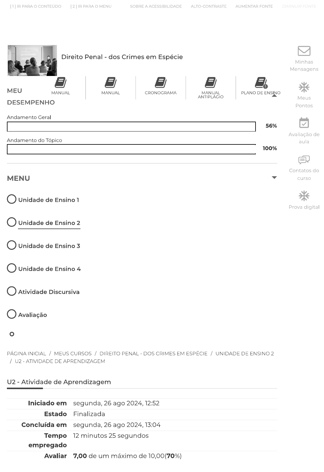 <p>[1] IR PARA CONTEÚDO [2] IR PARA O MENU SOBRE A ACESSIBILIDADE ALTO-CONTRASTE AUMENTAR FONTE DIMINUIR FONTE Direito Penal - dos Crimes em Espécie Minhas Mensagens MEU MANUAL MANUAL CRONOGRAMA MANUAL PLANO DE ENSINO ANTIPLAGIO Meus DESEMPENHO Pontos Andamento Geral 56% Avaliação de Andamento do Tópico aula 100% Contatos do MENU curso Unidade de Ensino 1 Prova digital Unidade de Ensino 2 Unidade de Ensino 3 Unidade de Ensino 4 Atividade Discursiva Avaliação PÁGINA INICIAL / MEUS CURSOS / DIREITO PENAL DOS CRIMES EM ESPÉCIE / UNIDADE DE ENSINO 2 / U2 ATIVIDADE DE APRENDIZAGEM U2 - Atividade de Aprendizagem Iniciado em segunda, 26 ago 2024, 12:52 Estado Finalizada Concluída em segunda, 26 ago 2024, 13:04 Tempo 12 minutos 25 segundos empregado Avaliar 7,00 de um máximo de 10,00(70%)</p><p>[1] IR PARA CONTEÚDO [2] IR PARA MENU SOBRE A ACESSIBILIDADE ALTO-CONTRASTE AUMENTAR FONTE DIMINUIR FONTE Incorreto Atingiu 0,00 de 1,00 crime de receptação, disciplinado pelo artigo 180 do Código Penal, em sua modalidade simples prevista pelo caput criminaliza a conduta dolosa do sujeito que adquire, recebe, transporta, conduz ou oculta, em proveito próprio ou alheio, coisa que sabe ser produto de crime, ou influi para que terceiro, de boa-fé, a adquira, receba ou oculte, impondo pena de reclusão, de um a quatro anos, e multa. Considerando apenas a pena em abstrato prevista para a modalidade simples do delito, assinale a alternativa correta: Escolha uma: a. Está sujeito ao rito sumário, mas não é possível a aplicação da suspensão condicional do processo nos termos da lei 9.099/1995. b. Está sujeito ao rito sumário e é possível a aplicação da suspensão condicional do processo nos termos da lei 9.099/1995. C. Está sujeito ao rito sumaríssimo, mas não é possível a aplicação da suspensão condicional do processo nos termos da lei 9.099/1995. d. Está sujeito ao rito ordinário e é possível a aplicação da suspensão condicional do processo nos termos da lei 9.099/1995. e. Está sujeito ao rito sumaríssimo e é possível a aplicação da suspensão condicional do processo nos termos da lei 9.099/1995.</p><p>[1] IR PARA O CONTEÚDO [2] IR PARA MENU SOBRE A ACESSIBILIDADE ALTO-CONTRASTE AUMENTAR FONTE DIMINUIR FONTE Correto Atingiu 1,00 de 1,00 Configura-se crime de apropriação indébita, nos termos do art. 168 do Código Penal, na conduta dolosa do sujeito ativo que,encontrando-se na posse regular de coisa alheia móvel, dela se apropria, passando a dispor da coisa como se dono fosse. Assinale a alternativa que corretamente apresente hipótese de causa de aumento de pena no crime de apropriação indébita: Escolha uma: a. mediante concurso de duas ou mais pessoas. b. destruição ou rompimento de obstáculo à subtração da coisa; C. abuso de confiança, ou mediante fraude, escalada ou destreza; d. em razão de ofício, emprego ou profissão e. emprego de chave falsa</p><p>[1] IR PARA CONTEÚDO [2] IR PARA MENU SOBRE A ACESSIBILIDADE ALTO-CONTRASTE AUMENTAR FONTE DIMINUIR FONTE Correto Atingiu 1,00 de 1,00 Além das hipóteses previstas pelo caput do artigo 171 do Código Penal, dispositivo ainda nos apresenta uma série de condutas fraudulentas e que são tratadas como assemelhadas ao estelionato, sujeitando autor aos mesmos tratamentos e sanções previstas para delito principal. Considerando teor dos estudos e dos conhecimentos construídos, analise a descrição abaixo e na sequência, indique a alternativa que corretamente apresenta a tipificação da conduta: "conduta dolosa daquele vende, permuta, dá em pagamento, em locação ou em garantia coisa alheia como se fosse sua". Escolha uma: a. Defraudação de penhor; b. Disposição de coisa alheia como própria; C. Fraude na entrega de coisa; d. Fraude para recebimento de indenização ou valor de seguro; e. Alienação ou oneração fraudulenta de coisa própria;</p><p>[1] IR PARA CONTEÚDO [2] IR PARA O MENU SOBRE A ACESSIBILIDADE ALTO-CONTRASTE AUMENTAR FONTE DIMINUIR Correto Atingiu 1,00 de 1,00 Furto é a subtração, para si ou para terceira pessoa, de coisa alheia móvel. Assim, pratica furto indivíduo que, de qualquer maneira, subtrai, objetivando tomar para si ou para terceira pessoa, coisa móvel pertencente a outra pessoa. Considerando conceito apresentado e os conhecimentos construídos no decorrer dos estudos, analise as assertivas abaixo e após assinale a alternativa correta: I. No crime de furto, elemento objetivo do tipo penal pressupõe a inversão da posse da coisa alheia móvel que é retirada da esfera de domínio de seu legítimo possuidor. II. A energia elétrica não pode ser considerada como coisa móvel para fins da caracterização do delito de furto por ser intangível. III. Se criminoso é primário, e é de pequeno valor a coisa furtada, juiz pode substituir a pena de reclusão pela de detenção, diminuí-la de um a dois terços, ou aplicar somente a pena de multa. Escolha uma: a. Apenas as assertivas e II estão corretas b. Apenas as assertivas e III estão corretas C. Apenas as assertivas II e III estão corretas d. Todas as assertivas estão corretas e. Apenas a assertiva está correta.</p><p>[1] IR PARA CONTEÚDO [2] IR PARA MENU SOBRE A ACESSIBILIDADE ALTO-CONTRASTE AUMENTAR FONTE DIMINUIR FONTE Correto Atingiu 1,00 de 1,00 A artigo 155 do Código Penal disciplina a conduta de furto que se configura na conduta do dolosa do sujeito ativo que subtrai para si ou para outrem coisa alheia móvel. Conforme os estudos realizados e os conhecimentos construídos, assinale a alternativa que apresenta hipótese de furto circunstanciado: Escolha uma: a. se crime é praticado durante repouso noturno b. se crime é cometido com abuso de confiança, ou mediante fraude, escalada ou destreza; C. se crime é cometido com emprego de chave falsa; d. se crime é cometido com destruição ou rompimento de obstáculo à subtração da coisa; e. se crime é cometido mediante concurso de duas ou