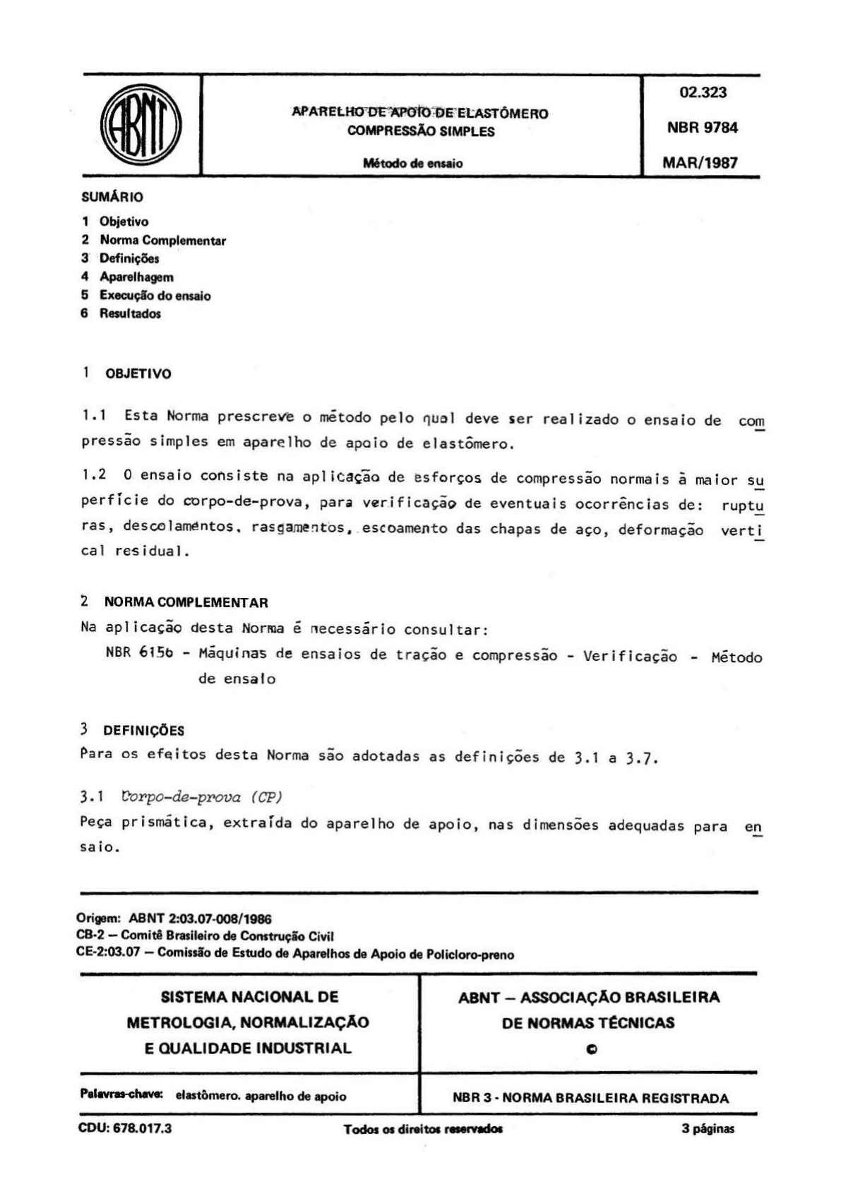 <p>SUMÁRIO</p><p>1 Objetivo</p><p>2 Norma Complementar</p><p>3: Definições</p><p>4 Aparelhagem</p><p>5 Execução do ensaio</p><p>6 Resultados</p><p>OBJETIVO</p><p>'AP'A'R'ElHO"DFiQO'tO'l)&-~E.tASTÓMERO</p><p>COMPRESSÃO SIMPLES</p><p>M6todo de ensaio</p><p>02.323</p><p>NBR 9784</p><p>MAR/1987</p><p>1. 1 Esta Norma prescre~e o método pelo ~uo l deve ser realizado o ensa io de com</p><p>pressão simples em apare lho de apoio de elastômero.</p><p>1. 2 O. ensaio consiste na aplicação de esforços de compressão normais a maior su</p><p>perfície do corpo-de-prova, par• ver.i ficação de eventuais ocorrências de: rupt~</p><p>ras, descolaméntos, ras~am!ntbs , . escoamento das chapa s de aço, deformação verti</p><p>ca 1 re~;'i dua 1 .</p><p>L NORMA COMPLEMENTAR</p><p>Na aplicação desta Norma e necessário consultar:</p><p>NBR 615b - Máquinas de ensaios de t ração e compressão - Ver ifi cação - Método</p><p>de ensa io</p><p>3 DEFINIÇÕES</p><p>Para os ef~itos desta Norma sao adotadas as def iniçÕes de 3 . 1 a 3 . 7.</p><p>3 . 1 'D'or po- de- prova (CP)</p><p>Peça prismátlca, extraída do apare lho de apoio, na s dimensões adequadas para en</p><p>sa io.</p><p>Origem: ABNT 2:03.07·008/1986</p><p>C8·2 - Comitf Brasileiro de Construçio Civil</p><p>CE-2:03.07 - Comissão de Estudo de Aparelhos de Apoio de Policloro-prvno</p><p>SISTEMA NACIONAL DE</p><p>METROLOGIA, NORMALIZAÇAO</p><p>E QUALIDADE INDUSTRIAL</p><p>Pai~ elastômero. apantlho de apoio</p><p>ABNT- ASSOCIAÇAO BRASILEIRA</p><p>DE NORMAS TeCNICAS</p><p>o</p><p>NBR 3 ·NORMA BRASILEIRA REGISTRADA</p><p>COU: 678.017.3 Todos 01 direitol r.-tftdol 3 pãginas</p><p>Ar</p><p>qu</p><p>iv</p><p>o</p><p>de</p><p>im</p><p>pr</p><p>es</p><p>sã</p><p>o</p><p>ge</p><p>ra</p><p>do</p><p>e</p><p>m</p><p>1</p><p>8/</p><p>08</p><p>/2</p><p>01</p><p>4</p><p>08</p><p>:2</p><p>7:</p><p>39</p><p>d</p><p>e</p><p>us</p><p>o</p><p>ex</p><p>cl</p><p>us</p><p>iv</p><p>o</p><p>de</p><p>R</p><p>O</p><p>BE</p><p>R</p><p>TO</p><p>G</p><p>O</p><p>M</p><p>ES</p><p>A</p><p>TH</p><p>AY</p><p>D</p><p>E</p><p>[0</p><p>72</p><p>.5</p><p>04</p><p>.3</p><p>74</p><p>-1</p><p>0]</p><p>Arquivo de impressão gerado em 18/08/2014 08:27:39 de uso exclusivo de ROBERTO GOMES ATHAYDE [072.504.374-10]</p><p>NBR 9784/1987</p><p>~.2</p><p>frea</p><p>Área de contato do corpo-de-prova {A)</p><p>normal ao esforço de compressão.</p><p>Força norma~ (FN)</p><p>sforço. de compressão normal a area de contato do corpo-de-prova.</p><p>Pressão norma~ (PN)</p><p>or·ça normal (FN) dividida pela area de contato do corpo-de-prova (A).</p><p>Desco ~amento</p><p>uptura das ligações entre as partes constituintes do corpo-de-prova.</p><p>Rasgamento</p><p>uptura do etastômero.</p><p>Deformação vertica~ residual (DR)</p><p>aixamento do corpo-de-prova relativo a altura original, medido 30 minutos apos</p><p>término do ensa io.</p><p>la APARELHAGEM r execução deste ensaio e necessária a seguinte aparelhagem:</p><p>a) máquina de ensaio suficientemente rígida para aplicar os esforços previstos</p><p>e provida de manômetro ou outro dispositivo que permita controle da força</p><p>normal, com sensibiLidade de 1%, periodicamente verificada conforme NBR</p><p>6156;</p><p>b) paquímetro com sensibilidade de 0,05 mm.</p><p>EXECUÇÃO DO ENSAIO</p><p>• 1 Corpo-de-prova</p><p>ensa io deve ser realizado em um corpo-de-prova nas seguintes condições:</p><p>a) o corpo-de-prova de aparelho de apoio fretado deve estar com as chapas de</p><p>aço expostas nas superfícies laterais;</p><p>b) os cortes, para .obtenção do corpo-de-prova~ devem ser feitos sem geraçao</p><p>de calor excessivo e sem qualquer tipo de refrigeração;</p><p>c) sempre que poss í ve 1, as dimensões em p·lanta do corpo-de-prova devem ser</p><p>de 15 em x 20 em, e sua menor dimensão em planta deve ser maior ou igual</p><p>a duas vezes a espessura;</p><p>d) quando as dimensões em planta do aparelho de elastômero forem menores do</p><p>que 15 em x 20 em, o corpo-de-prova deve ter dimensões o mais próximo PO!</p><p>sível do aparelho orioinal.</p><p>Ar</p><p>qu</p><p>iv</p><p>o</p><p>de</p><p>im</p><p>pr</p><p>es</p><p>sã</p><p>o</p><p>ge</p><p>ra</p><p>do</p><p>e</p><p>m</p><p>1</p><p>8/</p><p>08</p><p>/2</p><p>01</p><p>4</p><p>08</p><p>:2</p><p>7:</p><p>39</p><p>d</p><p>e</p><p>us</p><p>o</p><p>ex</p><p>cl</p><p>us</p><p>iv</p><p>o</p><p>de</p><p>R</p><p>O</p><p>BE</p><p>R</p><p>TO</p><p>G</p><p>O</p><p>M</p><p>ES</p><p>A</p><p>TH</p><p>AY</p><p>D</p><p>E</p><p>[0</p><p>72</p><p>.5</p><p>04</p><p>.3</p><p>74</p><p>-1</p><p>0]</p><p>Arquivo de impressão gerado em 18/08/2014 08:27:39 de uso exclusivo de ROBERTO GOMES ATHAYDE [072.504.374-10]</p><p>NBR 9784/1987 3</p><p>5.2 Ensaio</p><p>5.2.1 Climatização do aorpo-de-prova</p><p>O corpo-de-prova deve ser precondicionado por um período mínimo de doze horas no</p><p>ambiente de ensaio.</p><p>5.2.2 Posicionamento do corpo-de-prova</p><p>O corpo-de- prova deve ser posicionado de modo que a força normal seja aplicada de</p><p>forma centrada.</p><p>5.2 .3 Aplicação da pressão normal (PN)</p><p>.o corpo-de-prova deve ser submetido a uma pressao normal de até 60 MPa. A veloci</p><p>dade de aplicação da pressão deve ser menor ou igual a 5 MPa/min.</p><p>5 .. 2.4 Verificações</p><p>5.2.4.1 Durante a realização do ensaio, devem ser feitas verificações de even</p><p>tuais ocorrências de: rupturas, descolamentos, rasgamentos, escoamento das chapas</p><p>de aço, deformação vertical residual.</p><p>5.2.4.2 Antes, e trinta minutos após o término do ensaio, deve-se determinar as</p><p>dimensões médias do corpo-de-prova, utilizando-se o paquímetro, como se segue:</p><p>a) largura - três determinações, no mínimo;</p><p>b) comprimento- três determinações, no mínimo;</p><p>c) altura - quatro determinações, no mínimo.</p><p>6 RESULTADOS</p><p>Nos resultados devem ser apresentados:</p><p>a) as dimensões dos descolamentos e/