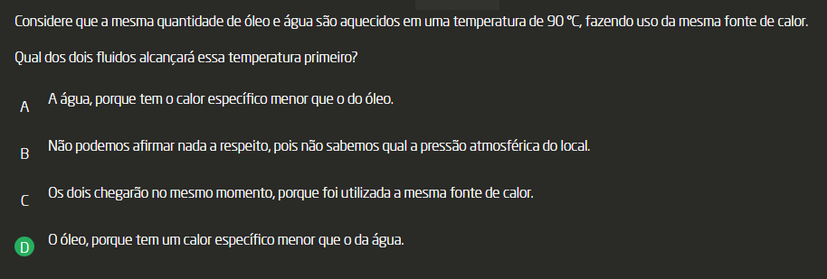 <p>Considere que a mesma quantidade de óleo e água são aquecidos em uma temperatura de 90 °C, fazendo da mesma fonte de calor. Qual dos dois fluidos alcançará essa temperatura primeiro? A A água, porque tem calor específico menor que do óleo. B Não podemos afirmar nada a respeito, pois não sabemos qual a pressão atmosférica do local. C Os dois chegarão no mesmo momento, porque foi utilizada a mesma fonte de calor. D 0 óleo, porque tem um calor específico menor que da água.</p>