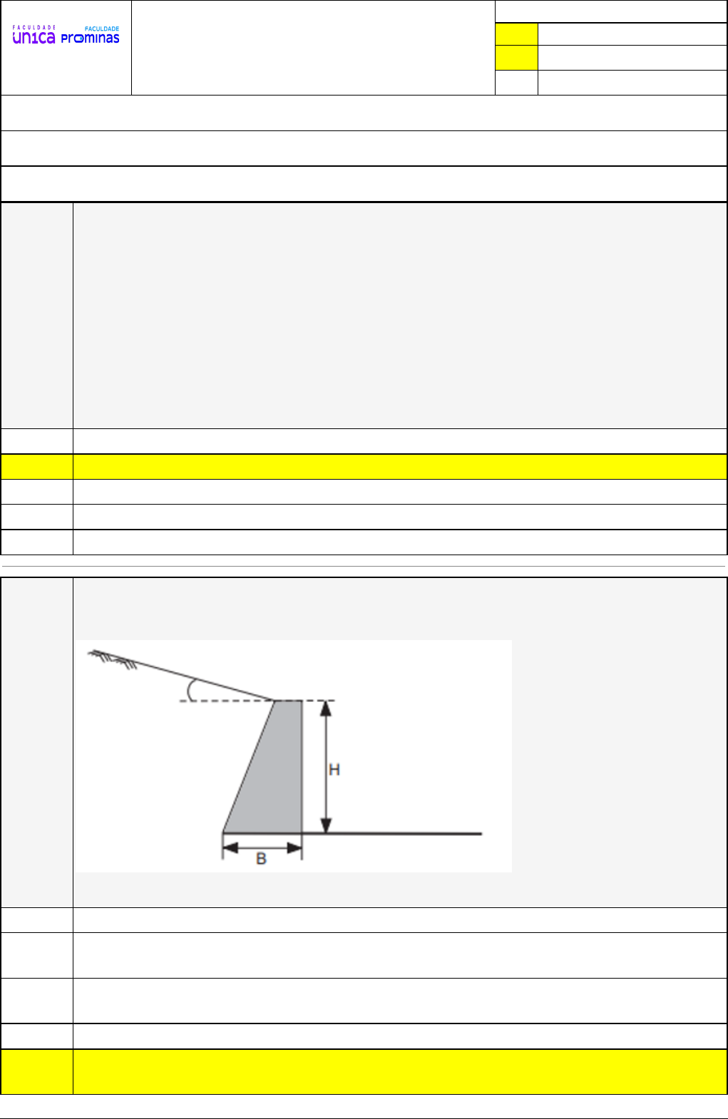 <p>Pincel Atômico - 19/09/2024 12:39:47 1/2</p><p>CRISTIANE RIBEIRO</p><p>VIVANCO</p><p>Avaliação Online (SALA EAD) - Capitulos/Referencias 1,2,3</p><p>Atividade finalizada em 19/08/2024 17:09:25 (2200019 / 1)</p><p>LEGENDA</p><p>Resposta correta na questão</p><p># Resposta correta - Questão Anulada</p><p>X Resposta selecionada pelo Aluno</p><p>Disciplina:</p><p>MECÂNICA DOS SOLOS II [430975] - Avaliação com 5 questões, com o peso total de 15,00 pontos [capítulos - 1,2,3]</p><p>Turma:</p><p>Graduação: Engenharia Civil - Grupo: FEVEREIRO/2022 - ENGCIV/FEV22 [64220]</p><p>Aluno(a):</p><p>91575599 - CRISTIANE RIBEIRO VIVANCO - Respondeu 5 questões corretas, obtendo um total de 15,00 pontos como nota</p><p>[360743_1705</p><p>76]</p><p>Questão</p><p>001</p><p>(ESAF/2013) para avaliar o comportamento do solo são empregados ensaios de</p><p>laboratório de modo a se determinar parâmetros de resistência e deformabilidade.</p><p>Com relação aos ensaios de laboratório, analise as afirmativas:</p><p>I.O ensaio de cisalhamento direto não permite a determinação do módulo de</p><p>cisalhamento.</p><p>II.No ensaio de compressão triaxial adensado não drenado (CU), a pressão neutra</p><p>durante o ensaio é praticamente nula, e as tensões totais aplicadas indicam as tensões</p><p>efetivas.</p><p>III.O ensaio de compressão edométrica avalia a compressibilidade e a resistência dos</p><p>solos.</p><p>É correto o que se afirma em:</p><p>III.</p><p>X I.</p><p>I e II.</p><p>II e III.</p><p>II.</p><p>[360743_1706</p><p>06]</p><p>Questão</p><p>002</p><p>(ENADE/2005) O muro de contenção mostrado na figura deve garantir a estabilidade</p><p>de um talude de solo não coesivo, cuja envoltória de resistência ao cisalhamento é</p><p>definida pelo ângulo de atrito Φ.</p><p>A partir da análise da figura e das informações fornecidas, conclui-se que:</p><p>aumentando-se a largura B, diminui-se o fator de segurança quanto ao deslizamento.</p><p>para que o muro seja estável quanto ao tombamento, é necessário que a direção da</p><p>resultante do empuxo passe pelo centro de gravidade da seção transversal do muro.</p><p>quanto maior for o atrito α, menor será a tensão de compressão máxima na base do</p><p>muro.</p><p>quanto maior for o ângulo de atrito Φ, maior será o empuxo do solo no muro.</p><p>X</p><p>no caso de α = 0, a direção da resultante do empuxo do solo é horizontal e dista H/3</p><p>da base do muro.</p><p>Pincel Atômico - 19/09/2024 12:39:47 2/2</p><p>[360743_1705</p><p>85]</p><p>Questão</p><p>003</p><p>(FEMPERJ/2012) Para o projeto das estruturas de contenção, é necessário determinar</p><p>os empuxos de terra. As teorias mais utilizadas para esse fim são as de Rankine e</p><p>Coulomb, segundo as quais:</p><p>X</p><p>Um solo em estado de repouso precisa sofrer deformações laterais de extensão para</p><p>atingir estado ativo.</p><p>O empuxo ativo é inversamente proporcional à altura do muro de arrimo.</p><p>A verificação da estabilidade ao tombamento é dispensável nos casos de muros de</p><p>arrimo com base estreita, devido ao baixo valor do empuxo.</p><p>A presença de nível d’água no solo arrimado não afeta o valor do empuxo ativo.</p><p>O coeficiente de empuxo passivo não depende do ângulo de atrito do solo.</p><p>[360744_1687</p><p>37]</p><p>Questão</p><p>004</p><p>Quando uma estrutura se desloca de encontro a um terreno, são produzidas tensões</p><p>de cisalhamento no solo, as quais fazem aumentar o empuxo sobre esta estrutura. A</p><p>relação das tensões atuantes nesse sistema é chamada de:</p><p>Empuxo nulo.</p><p>Empuxo vertical.</p><p>X Empuxo passivo.</p><p>Empuxo horizontal.</p><p>Empuxo ativo.</p><p>[360745_1687</p><p>33]</p><p>Questão</p><p>005</p><p>O corpo de prova saturado é submetido primeiramente a uma pressão de</p><p>confinamento em todo o seu entorno e, com isso, toda a pressão neutra se dissipa,</p><p>tornando-se desprezível. Em seguida, a pressão axial é aumentada lentamente, a fim</p><p>de que a água sob pressão possa sair. Durante o ensaio, a pressão neutra é quase</p><p>nula, e as tensões totais inseridas estabelecem as tensões efetivas que estavam</p><p>processando-se. O trecho anterior se refere ao ensaio de:</p><p>cisalhamento direto.</p><p>ensaio triaxial ensaio adensado não drenado.</p><p>ensaio não adensado não drenado ou ensaio não drenado.</p><p>X ensaio triaxial adensado drenado ou ensaio drenado.</p><p>ensaio oedométrico.</p>