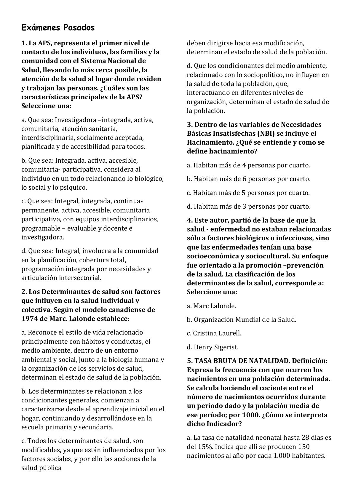 <p>Exámenes Pasados</p><p>1. La APS, representa el primer nivel de</p><p>contacto de los individuos, las familias y la</p><p>comunidad con el Sistema Nacional de</p><p>Salud, llevando lo más cerca posible, la</p><p>atención de la salud al lugar donde residen</p><p>y trabajan las personas. ¿Cuáles son las</p><p>características principales de la APS?</p><p>Seleccione una:</p><p>a. Que sea: Investigadora –integrada, activa,</p><p>comunitaria, atención sanitaria,</p><p>interdisciplinaria, socialmente aceptada,</p><p>planificada y de accesibilidad para todos.</p><p>b. Que sea: Integrada, activa, accesible,</p><p>comunitaria- participativa, considera al</p><p>individuo en un todo relacionando lo biológico,</p><p>lo social y lo psíquico.</p><p>c. Que sea: Integral, integrada, continua-</p><p>permanente, activa, accesible, comunitaria</p><p>participativa, con equipos interdisciplinarios,</p><p>programable – evaluable y docente e</p><p>investigadora.</p><p>d. Que sea: Integral, involucra a la comunidad</p><p>en la planificación, cobertura total,</p><p>programación integrada por necesidades y</p><p>articulación intersectorial.</p><p>2. Los Determinantes de salud son factores</p><p>que influyen en la salud individual y</p><p>colectiva. Según el modelo canadiense de</p><p>1974 de Marc. Lalonde establece:</p><p>a. Reconoce el estilo de vida relacionado</p><p>principalmente con hábitos y conductas, el</p><p>medio ambiente, dentro de un entorno</p><p>ambiental y social, junto a la biología humana y</p><p>la organización de los servicios de salud,</p><p>determinan el estado de salud de la población.</p><p>b. Los determinantes se relacionan a los</p><p>condicionantes generales, comienzan a</p><p>caracterizarse desde el aprendizaje inicial en el</p><p>hogar, continuando y desarrollándose en la</p><p>escuela primaria y secundaria.</p><p>c. Todos los determinantes de salud, son</p><p>modificables, ya que están influenciados por los</p><p>factores sociales, y por ello las acciones de la</p><p>salud pública</p><p>deben dirigirse hacia esa modificación,</p><p>determinan el estado de salud de la población.</p><p>d. Que los condicionantes del medio ambiente,</p><p>relacionado con lo sociopolítico, no influyen en</p><p>la salud de toda la población, que,</p><p>interactuando en diferentes niveles de</p><p>organización, determinan el estado de salud de</p><p>la población.</p><p>3. Dentro de las variables de Necesidades</p><p>Básicas Insatisfechas (NBI) se incluye el</p><p>Hacinamiento. ¿Qué se entiende y como se</p><p>define hacinamiento?</p><p>a. Habitan más de 4 personas por cuarto.</p><p>b. Habitan más de 6 personas por cuarto.</p><p>c. Habitan más de 5 personas por cuarto.</p><p>d. Habitan más de 3 personas por cuarto.</p><p>4. Este autor, partió de la base de que la</p><p>salud - enfermedad no estaban relacionadas</p><p>sólo a factores biológicos o infecciosos, sino</p><p>que las enfermedades tenían una base</p><p>socioeconómica y sociocultural. Su enfoque</p><p>fue orientado a la promoción –prevención</p><p>de la salud. La clasificación de los</p><p>determinantes de la salud, corresponde a:</p><p>Seleccione una:</p><p>a. Marc Lalonde.</p><p>b. Organización Mundial de la Salud.</p><p>c. Cristina Laurell.</p><p>d. Henry Sigerist.</p><p>5. TASA BRUTA DE NATALIDAD. Definición:</p><p>Expresa la frecuencia con que ocurren los</p><p>nacimientos en una población determinada.</p><p>Se calcula haciendo el cociente entre el</p><p>número de nacimientos ocurridos durante</p><p>un período dado y la población media de</p><p>ese período; por 1000. ¿Cómo se interpreta</p><p>dicho Indicador?</p><p>a. La tasa de natalidad neonatal hasta 28 días es</p><p>del 15%. Indica que allí se producen 150</p><p>nacimientos al año por cada 1.000 habitantes.</p><p>b. La Tasa de natalidad bruta poblacional es del</p><p>15%. Indica que allí se producen 15</p><p>nacimientos al año por cada 1.000 habitantes.</p><p>c. La Tasa de natalidad bruta poblacional es del</p><p>15%. Indica que allí se producen 150</p><p>nacimientos al año por cada 1.000 habitantes.</p><p>d. La tasa de natalidad en niños menores de 1</p><p>año es del 15%. Indica que allí se producen 150</p><p>nacimientos al año por cada 1.000 habitantes.</p><p>6. Énfasis en RCP de alta calidad. Continuar</p><p>con ciclos de 30 compresiones y 2</p><p>respiraciones hasta que se cumpla 1 de las</p><p>cuatro condiciones. Indique ¿Cuáles son</p><p>esas cuatro condiciones fundamentales?</p><p>Seleccione una:</p><p>a. La llegada tardía del SEM, no hay acceso al</p><p>DEA, la víctima presenta atragantamiento,</p><p>colapso por agotamiento.</p><p>b. Su seguridad corre peligro, llegada de un</p><p>DEA, la víctima muestre signos de vida y llegue</p><p>el SEM y asuma el control es correcta</p><p>c. Su seguridad no corre peligro, llegada tardía</p><p>de un DEA, la víctima no muestre signos de</p><p>vida.</p><p>d. La víctima no muestre signos de vida, su</p><p>seguridad no corra peligro y llegue el SEM y no</p><p>asuma el control.</p><p>7. Determinantes de Salud: Factores que</p><p>influyen en la salud individual, que</p><p>interactuando en diferentes niveles de</p><p>organización, determinan el estado de salud</p><p>de la población ¿Cuál de los siguientes</p><p>enunciados corresponde a los</p><p>determinantes de la salud según el Informe</p><p>Lalonde, Modelo Campo de la Salud?</p><p>a. Agente, persona- huésped, medio ambiente y</p><p>contexto sanitario.</p><p>b. Biología Persona- comunidad, modo de vida,</p><p>ambiente y sistema sanitario.</p><p>c. Biología humana, estilos de vida, medio</p><p>ambiente y sistema de asistencia sanitaria.</p><p>d. Biología humana, condiciones de vida,</p><p>ambiente y sistema de atención de la salud.</p><p>8. Dentro del proceso salud -enfermedad -</p><p>atención, se desarrolla el modelo</p><p>biopsicosocial. ¿Cuáles son las</p><p>características de dicho modelo?</p><p>a. Preferente