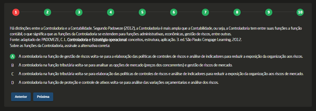 <p>1 2 3 4 5 6 7 8 9 10 Há distinções entre a Controladoria e a Contabilidade Segundo Padoveze (2012) a Controladoria é mais ampla que a Contabilidade, seja, a Controladoria tem entre suas funções a função contábil, que significa que as funções da Controladoria se estendem para funções administrativas, econômicas, gestão de riscos, entre outras. adaptado PADOVEZE, C.L. Controladoria e Estratégia operacional: conceitos, estrutura, aplicação. 3 ed São Paulo: Cengage Learning, 2012. Sobre as funções da assinale a alternativa correta: A controladoria na função de gestão de riscos volta-se para a elaboração das políticas de controles de riscos e análise de indicadores para reduzir a exposição da organização aos riscos. B A controladoria na função tributária volta-se para analisar as opções de mercado (preços dos concorrentes) e gestão de riscos de mercado. A controladoria na função tributária volta-se para elaboração das políticas de controles de riscos e análise de indicadores para reduzir a exposição da organização aos riscos de mercado. D A controladoria na função de proteção e controle de ativos volta-se para análise das variações orçamentarias e análise dos riscos Anterior Próxima</p>