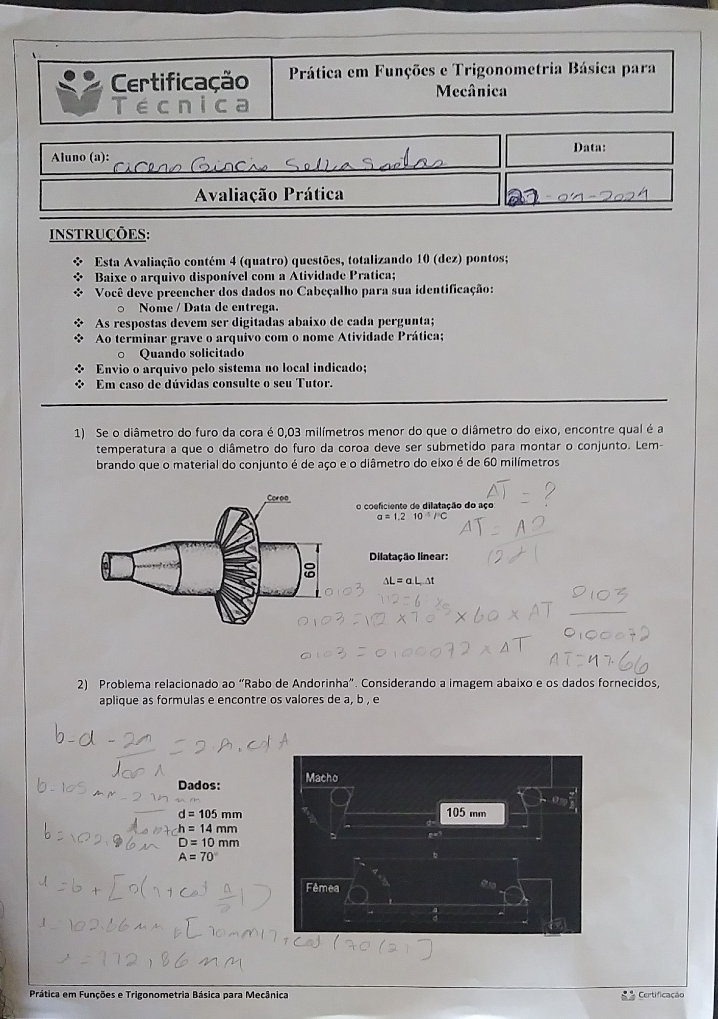 <p>Prática em Funções e Trigonometria Básica para Certificação Mecânica Data: Aluno (a): Sella Avaliação Prática INSTRUÇÕES: Esta Avaliação contém 4 (quatro) questões, totalizando 10 (dez) pontos; Baixe o arquivo disponível com a Atividade Pratica; Você deve preencher dos dados no Cabeçalho para sua identificação: Nome / Data de entrega. As respostas devem ser digitadas abaixo de cada pergunta; Ao terminar grave o arquivo com o nome Atividade Prática; Quando solicitado Envio o arquivo pelo sistema no local indicado; Em caso de dúvidas consulte o seu Tutor. 1) Se o diâmetro do furo da cora é 0,03 milímetros menor do que o diâmetro do eixo, encontre qual é a temperatura a que o diâmetro do furo da coroa deve ser submetido para montar o conjunto. Lem- brando que o material do conjunto é de aço e o diâmetro do eixo é de 60 milímetros coeficiente de dilatação do a = 10 AT Dilatação linear: AL = 0103 60 AT 2) Problema relacionado ao "Rabo de Andorinha". Considerando a imagem abaixo e os dados fornecidos, aplique as formulas e encontre os valores de a, b , e Macho Dados: d = 105 mm 105 mm = D=10mm Fémea [ Prática em Funções e Trigonometria Básica para Mecânica Certificação</p>