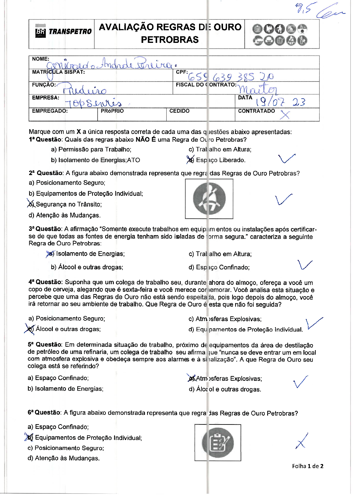<p>BR TRANSPETRO AVALIAÇÃO REGRAS DE OURO PETROBRAS NOME: SISPAT: CPF: 659 FUNÇÃO: FISCAL DO ONTRATO: EMPRESA: DATA 23 EMPREGADO: PRóPRIO CEDIDO CONTRATADO X Marque com um X a única resposta correta de cada uma das q estões abaixo apresentadas: Questão: Quais das regras abaixo NÃO É uma Regra de Ouro Petrobras? a) Permissão para Trabalho; c) alho em Altura; b) Isolamento de Energias;ATC Espaço Questão: A figura abaixo demonstrada representa que regra das Regras de Ouro Petrobras? a) Posicionamento Seguro; b) Equipamentos de Proteção Individual; Segurança no Trânsito; d) Atenção às Mudanças. Questão: A afirmação "Somente execute trabalhos em equipam entos ou instalações após certificar- se de que todas as fontes de energia tenham sido isladas de orma segura." caracteriza a seguinte Regra de Ouro Petrobras: a) Isolamento de Energias; c) Tral alho em Altura; b) Álcool e outras drogas; d) Espaço Confinado; V Questão: Suponha que um colega de trabalho seu, durante ahora do almoço, ofereça a você um copo de cerveja, alegando que é sexta-feira e você merece Você analisa esta situação e percebe que uma das Regras de Ouro não está sendo espeita da, pois logo depois do almoço, você irá retornar ao seu ambiente de trabalho. Que Regra de Ouro é esta que não foi seguida? a) Posicionamento Seguro; c) Atm sferas Explosivas; Álcool e outras drogas; d) pamentos de Proteção Individual. Questão: Em determinada situação de trabalho, próximo de equipamentos da área de destilação de petróleo de uma refinaria, um colega de trabalho seu afirma que "nunca se deve entrar um em local com atmosfera explosiva e obedeça sempre aos alarmes e à si A que Regra de Ouro seu colega está se referindo? a) Espaço Confinado; Atm Explosivas; b) Isolamento de Energias; d) e outras drogas. Questão: A figura abaixo demonstrada representa que regra das Regras de Ouro Petrobras? a) Espaço Confinado; Equipamentos de Proteção Individual; c) Posicionamento Seguro; d) Atenção às Mudanças. Folha 1 de 2</p><p>AVALIAÇÃO REGRAS DE OURO BR TRANSPETRO PETROBRAS Questão: Suponha que em uma determinada situação de trabalho, uma equipe de manutenção esteja realizando uma soldagem em uma tubulação de aço, próximo à área de movimentação de cargas de uma plataforma de petróleo FPSO. Em deter minado momento, você percebe que as cargas que estão sendo movimentadas passam por cima desta equipe, posicionando todos estes trabalhadores embaixo das cargas que estão sendo Diante desta situação, qual a Regra de Ouro que não está sendo respeitada por esta equipe? Posicionamento Seguro; c) Atmosferas Explosivas; b) Álcool e outras drogas; d) Isolamento de Energias. Questão: A afirmação "Somente trabalhe com Permissão para Trabalho válida, liberada no campo e de seu total entendimento." caracteriza a seguinte Regra de Ouro Petrobras: a) Isolamento de Energias; c) Trabalho em Altura; Permissão para Trabalho; d) Equipamentos de Proteção Individual; Questão: A figura abaixo demonstrada representa que regra das Regras de Ouro Petrobras? a) Atmosferas Explosivas; b) Equipamentos de Proteção Individual; c) Posicionamento Seguro; Trabalho em Altura. Questão: Suponha que em uma determinada situação de trabalho, um colega seu esteja te auxiliando a fazer um corte em uma chapa de metal, utilizando uma esmerilhadeira e uma serra manual. Em determinado momento, devido ao suor em S uas mãos, você e seu colega retirem as luvas, para secar as mãos e continuar o serviço. No entant o, como somente falta cortar 1 cm de metal, vocês resolvem continuar o corte sem as luvas. situação, qual regra das Regras de Ouro você acha que não está sendo seguida? Equipamentos de Proteção Individual; c) Posicionamento Seguro; b) Isolamento de Energias; d) Isolamento de Energias. Questão: Em caso de acidentes do trabalho o que os empregados devem fazer? Avisar imediatamente o fiscal e encaminhar o acidentado para verificação médica ( ) Avisar imediatamente o fiscal apenas se tiver havido alguma fratura. Questão: O trânsito de veículos dentro dos terminais deve obedecer a velocidade máxima de 60 km/h ( ) Certo Errado Questão :Ao soar o alarme de emergência, os empregados das contratadas deverão: Aguardar no local de trabalho, o término da emergência. ) Se dirigir aos pontos de encontro e aguardar orientação. ( ) Se dirigir à saída de emergência mais próxima. Folha 2 de 2</p>