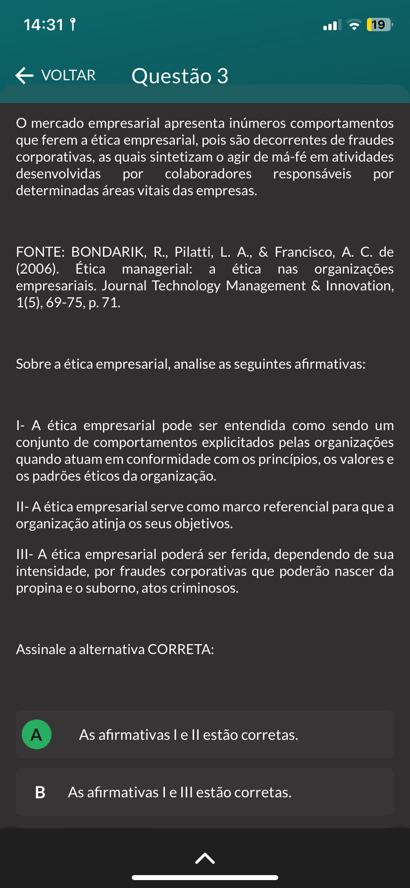 <p>14:31 9 19 VOLTAR Questão 3 O mercado empresarial apresenta inúmeros comportamentos que ferem a ética empresarial, pois são decorrentes de fraudes corporativas, as quais sintetizam agir de má-fé em atividades desenvolvidas por colaboradores responsáveis por determinadas áreas vitais das empresas. FONTE: BONDARIK, R., Pilatti, L. A., & Francisco, A. C. de (2006). Ética managerial: a ética nas organizações empresariais. Journal Technology Management & Innovation, 1(5), 69-75, p. 71. Sobre a ética empresarial, analise as seguintes afirmativas: I- A ética empresarial pode ser entendida como sendo um conjunto de comportamentos explicitados pelas organizações quando atuam em conformidade com os princípios, os valores e os padrões éticos da organização. II- A ética empresarial serve como marco referencial para que a organização atinja os seus objetivos. III- A ética empresarial poderá ser ferida, dependendo de sua intensidade, por fraudes corporativas que poderão nascer da propina e suborno, atos criminosos. Assinale a alternativa CORRETA: A As afirmativas I e II estão corretas. B As afirmativas e III estão corretas.</p>