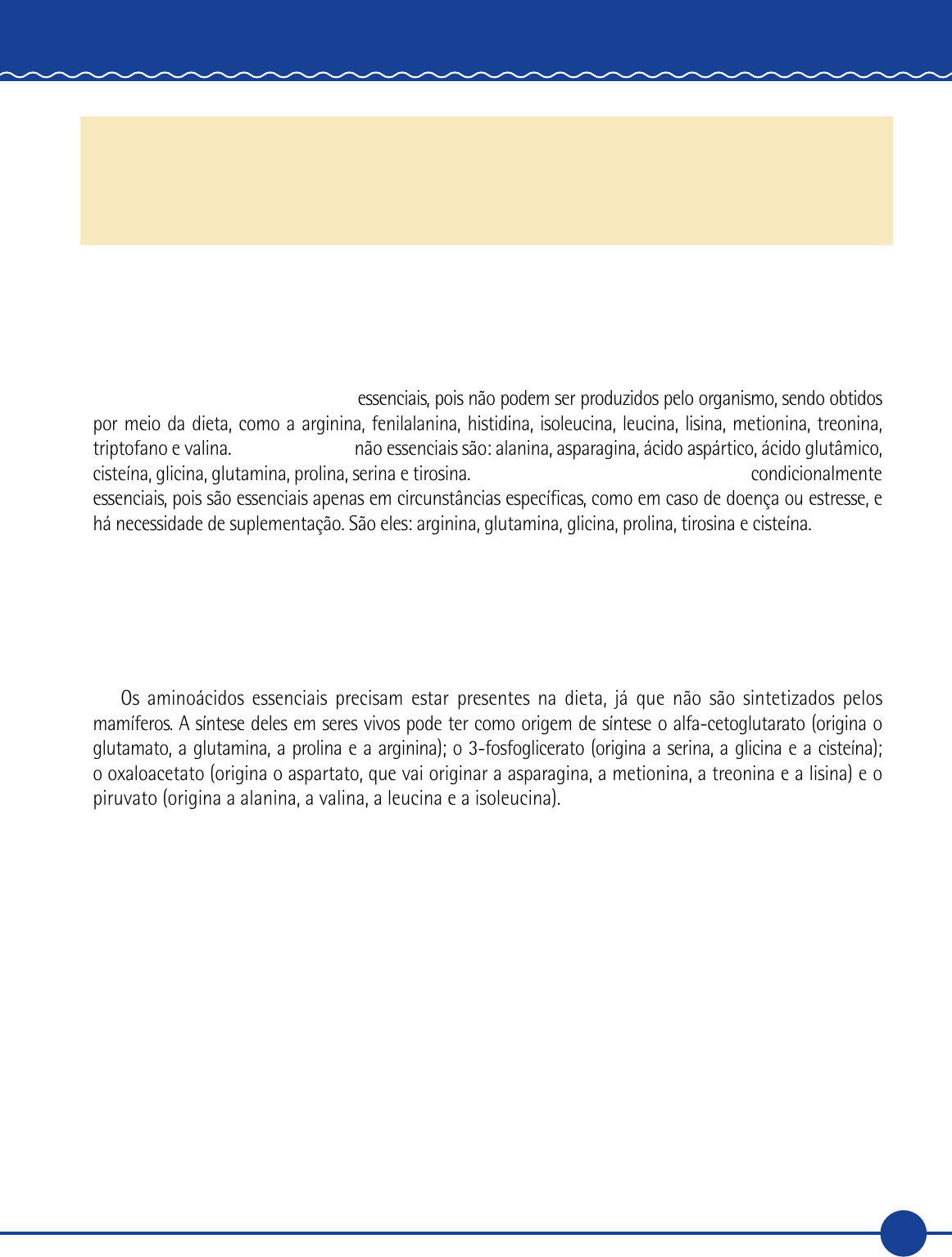 <p>57</p><p>BIOQUÍMICA METABÓLICA</p><p>Unidade II</p><p>5 SÍNTESE PROTEICA</p><p>5.1 Aminoácidos e proteínas</p><p>Na natureza existem cerca de trezentos aminoácidos diferentes, mas somente vinte compõem as proteínas</p><p>dos seres vivos. Desses, dez são ditos essenciais, pois não podem ser produzidos pelo organismo, sendo obtidos</p><p>por meio da dieta, como a arginina, fenilalanina, histidina, isoleucina, leucina, lisina, metionina, treonina,</p><p>triptofano e valina. Os aminoácidos não essenciais são: alanina, asparagina, ácido aspártico, ácido glutâmico,</p><p>cisteína, glicina, glutamina, prolina, serina e tirosina. Temos também os classificados como condicionalmente</p><p>essenciais, pois são essenciais apenas em circunstâncias específicas, como em caso de doença ou estresse, e</p><p>há necessidade de suplementação. São eles: arginina, glutamina, glicina, prolina, tirosina e cisteína.</p><p>Os aminoácidos não essenciais são derivados de intermediários da glicólise, do ciclo do ácido cítrico</p><p>ou da via das pentoses, sendo que o nitrogênio geralmente provém do glutamato.</p><p>5.2 Síntese de aminoácidos</p><p>Os aminoácidos essenciais precisam estar presentes na dieta, já que não são sintetizados pelos</p><p>mamíferos. A síntese deles em seres vivos pode ter como origem de síntese o alfa‑cetoglutarato (origina o</p><p>glutamato, a glutamina, a prolina e a arginina); o 3‑fosfoglicerato (origina a serina, a glicina e a cisteína);</p><p>o oxaloacetato (origina o aspartato, que vai originar a asparagina, a metionina, a treonina e a lisina) e o</p><p>piruvato (origina a alanina, a valina, a leucina e a isoleucina).</p><p>5.3 Síntese de proteína (tradução)</p><p>Após ser produzido o RNAm (RNA mensageiro) em células eucarióticas, sai do núcleo e chega ao</p><p>citoplasma e vai ser acoplado a ele os RNAr (RNA ribossômico) para que comece a síntese de alguma</p><p>proteína que o corpo necessite.</p><p>Para que a biossíntese ocorra, deve‑se passar por algumas etapas, como a ativação do aminoácido,</p><p>iniciação, elongação, terminação e modificações pós‑traducionais.</p><p>5.3.1 Ativação de aminoácidos</p><p>A ativação é feita pelo ATP que se liga ao RNA transportador (RNAt), resultando AMP‑RNAt.</p><p>Uma vez ativado, o RNAt se liga ao respectivo aminoácido (referente ao anticódon presente nele) que está</p><p>disperso no citoplasma da célula, se tornando aaRNAt e se encaminhando para os ribossomos. Resumindo:</p><p>marce</p><p>Realce</p><p>marce</p><p>Realce</p><p>marce</p><p>Realce</p><p>marce</p><p>Realce</p><p>58</p><p>Unidade II</p><p>aa</p><p>RNAt + ATP AMP‑RNAt + PPi aaRNAt + AMP</p><p>5.3.2 Iniciação</p><p>O RNA mensageiro (mRNA) receberá as subunidades 30S e 50S do RNAr (em E. coli) no extremo 5`</p><p>(onde tem o CAP). Proteínas chamadas de fatores de iniciação se ligam aos RNAr e RNAm, tornando‑os</p><p>estáveis para que se inicie a tradução.</p><p>Os aaRNAt entram no ribossomo (subunidades 30S + 50S juntas) e tentam parear seu anticódon</p><p>com o códon presente no RNAm (processo chamado de decodificação do RNAm). Nesse caso, o primeiro</p><p>códon é o de iniciação, que é AUG, e o anticódon presente no RNAt será UAC, que representa o aminoácido</p><p>metionina, isto é, fmetRNAt (que na iniciação apresenta um radical formil ligado a ela). Essa ligação se</p><p>dá no primeiro sítio ou trinca, chamado de P com gasto de 1 GTP.</p><p>Resumindo o complexo de iniciação:</p><p>RNAm + 30SRNAr + 50SRNAr + fmetRNAt + fatores de iniciação + GTP</p><p>5.3.3 Elongação</p><p>Um segundo aaRNAt se liga ao RNAm (no segundo sítio ou trinca, chamado de A) trazendo o</p><p>aminoácido específico de acordo com o códon seguinte. Ocorre a ligação peptídica entre o aminoácido</p><p>recém‑chegado e a formil metionina, reação catalisada pela enzima presente no interior dos ribossomos,</p><p>responsável por essa ligação peptídica, chamada peptidil transferase.</p><p>Figura 38 – Esquema da entrada do 2 aminoácido no sítio A.</p><p>Há complementariedade entre a trinca de anticódon e códon</p><p>59</p><p>BIOQUÍMICA METABÓLICA</p><p>O códon é um conjunto de 3 nucleotídeos que corresponde a 1 aminoácido. Existem 64 códons, sendo</p><p>que 3 não codificam nenhum aminoácido, os chamados códons de terminação. O códon é degenerado,</p><p>isto é, mais de 1 códon para 1 aminoácido.</p><p>G</p><p>C</p><p>U</p><p>G</p><p>C</p><p>U</p><p>A</p><p>C</p><p>G</p><p>G</p><p>A</p><p>G</p><p>C</p><p>U</p><p>U</p><p>C</p><p>G</p><p>G</p><p>A</p><p>G</p><p>C</p><p>U</p><p>A</p><p>G</p><p>ARN</p><p>Ácido ribonucleico</p><p>A</p><p>C</p><p>G</p><p>G</p><p>A</p><p>G</p><p>C</p><p>U</p><p>U</p><p>C</p><p>G</p><p>G</p><p>A</p><p>G</p><p>C</p><p>U</p><p>A</p><p>G</p><p>Códon 1</p><p>Códon 2</p><p>Códon 3</p><p>Códon 4</p><p>Códon 5</p><p>Códon 6</p><p>Códon 7</p><p>Figura 39 – Representação da quantidade de códons em uma fita de RNA</p><p>60</p><p>Unidade II</p><p>Segunda base</p><p>U C A G</p><p>Pr</p><p>im</p><p>ei</p><p>ra</p><p>b</p><p>as</p><p>e</p><p>U</p><p>UUU</p><p>Phe</p><p>UCU</p><p>Ser</p><p>UAU</p><p>Tyr</p><p>UGU</p><p>Cys</p><p>U</p><p>Te</p><p>rc</p><p>ei</p><p>ra</p><p>b</p><p>as</p><p>e</p><p>UUC UCC UAC UGC C</p><p>UUA</p><p>Leu</p><p>UCA UAA terminal UGA Terminal A</p><p>UUG UCG UAG terminal UGG Trp G</p><p>C</p><p>CUU</p><p>Leu</p><p>CCU</p><p>Pro</p><p>CAU</p><p>His</p><p>CGU</p><p>Arg</p><p>U</p><p>CUC CCC CAC CGC C</p><p>CUA CCA CAA</p><p>GluN</p><p>CGA A</p><p>CUG CCG CAG CGG G</p><p>A</p><p>AUU</p><p>Ileu</p><p>ACU</p><p>Thr</p><p>AAU</p><p>AspN</p><p>AGU</p><p>Ser</p><p>U</p><p>AUC ACC AAC AGC C</p><p>AUA ACA AAA</p><p>Lys</p><p>AGA</p><p>Arg</p><p>A</p><p>AUG Met ou</p><p>inicial ACG AAG AGG G</p><p>G</p><p>GUU</p><p>Val</p><p>GCU</p><p>Ala</p><p>GAU</p><p>Asp</p><p>GGU</p><p>Gly</p><p>U</p><p>GUC GCC GAC GGC C</p><p>GU