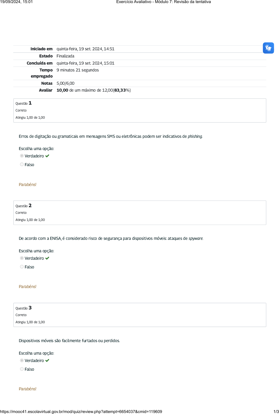 <p>Iniciado em quinta-feira, 19 set. 2024, 14:51</p><p>Estado Finalizada</p><p>Concluída em quinta-feira, 19 set. 2024, 15:01</p><p>Tempo</p><p>empregado</p><p>9 minutos 21 segundos</p><p>Notas 5,00/6,00</p><p>Avaliar 10,00 de um máximo de 12,00(83,33%)</p><p>Questão 1</p><p>Correto</p><p>Atingiu 1,00 de 1,00</p><p>Questão 2</p><p>Correto</p><p>Atingiu 1,00 de 1,00</p><p>Questão 3</p><p>Correto</p><p>Atingiu 1,00 de 1,00</p><p>Erros de digitação ou gramaticais em mensagens SMS ou eletrônicas podem ser indicativos de phishing.</p><p>Escolha uma opção:</p><p>Verdadeiro </p><p>Falso</p><p>Parabéns!</p><p>De acordo com a ENISA, é considerado risco de segurança para dispositivos móveis: ataques de spyware.</p><p>Escolha uma opção:</p><p>Verdadeiro </p><p>Falso</p><p>Parabéns!</p><p>Dispositivos móveis são facilmente furtados ou perdidos.</p><p>Escolha uma opção:</p><p>Verdadeiro </p><p>Falso</p><p>Parabéns!</p><p>19/09/2024, 15:01 Exercício Avaliativo - Módulo 7: Revisão da tentativa</p><p>https://mooc41.escolavirtual.gov.br/mod/quiz/review.php?attempt=6654037&cmid=119609 1/3</p><p>Questão 4</p><p>Correto</p><p>Atingiu 1,00 de 1,00</p><p>Questão 5</p><p>Correto</p><p>Atingiu 1,00 de 1,00</p><p>Questão 6</p><p>Incorreto</p><p>Atingiu 0,00 de 1,00</p><p>Só há risco no uso de redes wi-� públicas se eu �zer compras online.</p><p>Escolha uma opção:</p><p>Verdadeiro</p><p>Falso </p><p>Parabéns!</p><p>Sobre o vazamento ou extravio de dados devido à perda ou roubo do dispositivo, não é correto a�rmar que:</p><p>Escolha uma opção:</p><p>a. Criptografar o smartphone ou tablet não é uma</p><p>medida de proteção quando da perda do</p><p>dispositivo.</p><p> A�rmativa está incorreta. Criptografar é sim uma medida de proteção,</p><p>já que os dados estarão protegidos de acesso indevido. Parabéns!</p><p>b. Uma medida para não perder seus dados em caso de roubo do dispositivo é realizar o backup dos mesmos.</p><p>c. Colocar uma senha, padrão de bloqueio ou biometria, para acesso ao dispositivo é uma das formas de proteger seus dados em</p><p>caso de perda ou roubo do smartphone.</p><p>d. Uma das medidas de proteção de dados pessoais para o caso de perda do dispositivo móvel é não armazenar informações de</p><p>cartão de crédito no tablet ou smartphone.</p><p>Sua resposta está correta.</p><p>Sobre ataques de spyware, podemos dizer que são corretas as opções, exceto:</p><p>Escolha uma opção:</p><p>a. Manter o sistema operacional do dispositivo móvel atualizado é uma das maneiras de reduzir o risco de ataques de spyware.</p><p>b. Analisar as permissões solicitadas pelos aplicativos permite uma avaliação sobre o nível de acesso solicitado e o necessário,</p><p>podendo indicar o nível de risco de sua instalação, sendo essa uma das maneiras de se proteger contra spywares.</p><p>c. Fazer “root” ou “jailbreak” no seu aparelho, apenas o tornará mais suscetível, caso seja feito por pessoas não credenciadas pelo</p><p>Ministério das Comunicações.</p><p>d. Uma das medidas de precaução contra spywares é instalar so�ware</p><p>de antivírus no dispositivo móvel.</p><p> A�rmativa está correta. So�wares antivirus</p><p>ajudam a combater spywares.</p><p>Sua resposta está incorreta.</p><p>19/09/2024, 15:01 Exercício Avaliativo - Módulo 7: Revisão da tentativa</p><p>https://mooc41.escolavirtual.gov.br/mod/quiz/review.php?attempt=6654037&cmid=119609 2/3</p><p>19/09/2024, 15:01 Exercício Avaliativo - Módulo 7: Revisão da tentativa</p><p>https://mooc41.escolavirtual.gov.br/mod/quiz/review.php?attempt=6654037&cmid=119609 3/3</p>
