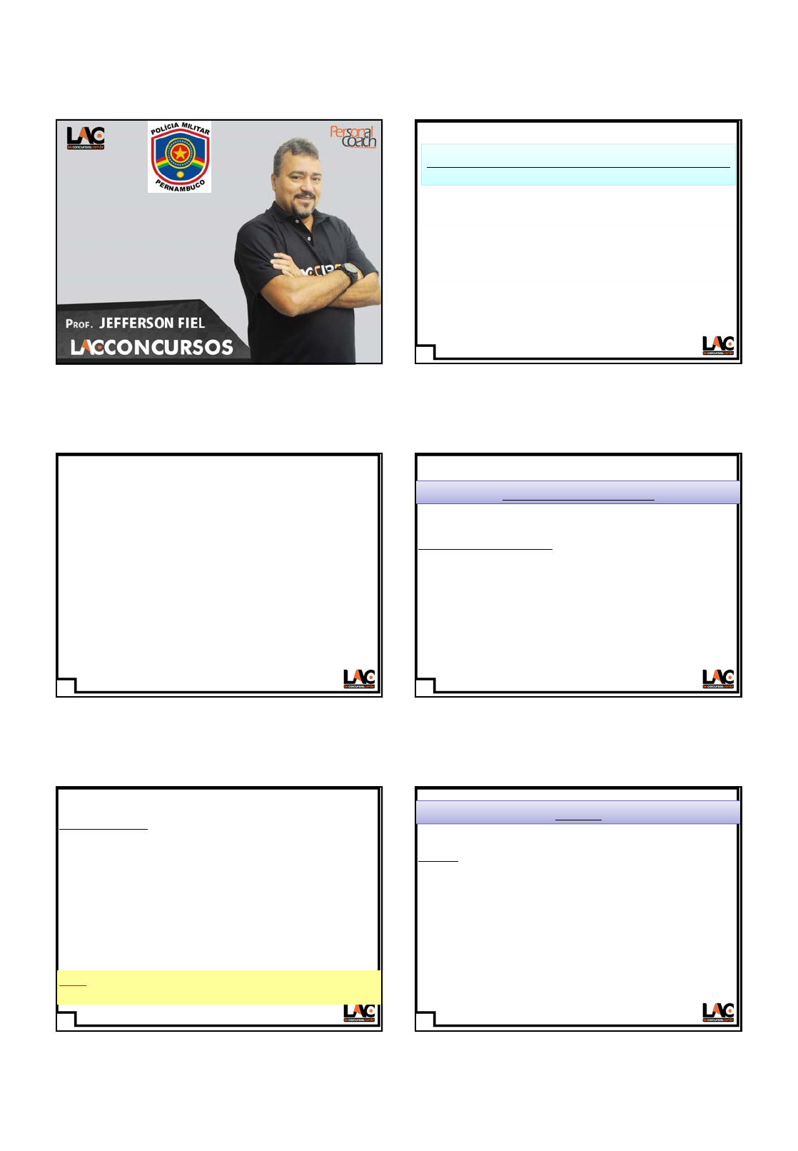 <p>Prof. Luiz Antonio de Carvalho</p><p>Conhecimentos Bancários -</p><p>www.lacconcursos.com.br 1</p><p>1</p><p>1</p><p>PROBABILIDADE</p><p>MATEMÁTICA</p><p>2</p><p>2</p><p>‐ TEORIA DAS PROBABILIDADE;</p><p>‐ PROBABILIDADE DE OCORRER UM EVENTO;</p><p>‐ Resolução de Exercícios Propostos.</p><p>O que estudaremos na aula de hoje?</p><p>3</p><p>3</p><p>TEORIA DAS PROBABILIDADES</p><p>A teoria das probabilidades busca estimar as</p><p>chances de ocorrer um determinado</p><p>acontecimento. É um ramo da matemática que cria,</p><p>elabora e pesquisa modelos para estudar</p><p>experimentos ou fenômenos aleatórios.</p><p>4</p><p>4</p><p>Experimento aleatório: É um experimento que pode</p><p>apresentar resultados diferentes, quando repetido</p><p>nas mesmas condições.</p><p>Experimento aleatório</p><p>Exº Lançamento de um dado; sorteio de loteria, etc.</p><p>5</p><p>5</p><p>ESPAÇO AMOSTRAL</p><p>Lançar um dado</p><p>• S = {1,2,3,4,5,6}</p><p>Obs.: Dizemos que um espaço amostral é equiprovável</p><p>quando seus elementos têm a mesma chance de ocorrer.</p><p>Espaço amostral: É o conjunto de todos os resultados</p><p>possíveis de um experimento aleatório. Indicamos o espaço</p><p>amostral por .</p><p>Exº Jogar uma moeda</p><p>S = {cara, coroa}</p><p>Sortear um número inteiro de um a cem</p><p>S = {1,2,...,100}</p><p>6</p><p>6</p><p>EXEMPLO</p><p>E = {cara} (sortear cara)</p><p>E = {25, 27} (sortear um nº ímpar entre 24 e 28)</p><p>E = {3, 5, 1} (sair um nº impar no dado)</p><p>Evento</p><p>Evento: Chama‐se evento a qualquer subconjunto do</p><p>espaço amostral.</p><p>Prof. Luiz Antonio de Carvalho</p><p>Conhecimentos Bancários -</p><p>www.lacconcursos.com.br 2</p><p>7</p><p>7</p><p>Evento certo: Ocorre quando um evento coincide com o</p><p>espaço amostral.</p><p>Ex.: 1 Lançar um dado e registrar os resultados:</p><p>Espaço amostral: = 1, 2, 3, 4, 5, 6</p><p>Evento A: Ocorrência de um número menor que 7 e</p><p>maior que zero.</p><p>A = 1, 2, 3, 4, 5, 6</p><p>Portanto A = , logo o evento é certo.</p><p>Eventos certo, impossível e mutuamente exclusivos</p><p>ou excludentes</p><p>8</p><p>8</p><p>Evento impossível:</p><p>Ocorre quando um evento é vazio.</p><p>Evento B</p><p>Ocorrência de um número maior que 6.</p><p>B = </p><p>Não existe número maior que 6 no dado,</p><p>portanto o evento é impossível.</p><p>9</p><p>9</p><p>Evento E: Ocorrência de número ímpar</p><p>E = 1, 3, 5</p><p>EXEMPLOS DE OCORRÊNCIA DE EVENTOS</p><p>Evento C: Ocorrência de um número par.</p><p>C = 2, 4, 6</p><p>Evento D: Ocorrência de múltiplo de 3.</p><p>D = 3, 6</p><p>10</p><p>10</p><p>PROBABILIDADE DE OCORRER UM EVENTO</p><p>)(</p><p>)(</p><p>)(</p><p>de elementos de número</p><p>A de elementos de número</p><p>)(</p><p></p><p></p><p></p><p></p><p>n</p><p>An</p><p>APAP</p><p>11</p><p>11</p><p>Exemplos</p><p>Ex.: 1 Consideremos o experimento Aleatório do</p><p>lançamento de um moeda perfeita. Calcule a</p><p>probabilidade de sair cara.</p><p>)(</p><p>)(</p><p>)(</p><p></p><p></p><p>n</p><p>An</p><p>AP</p><p>2</p><p>1</p><p>)( AP</p><p>Espaço amostral: = cara, coroa n() = 2</p><p>Evento A: A = cara n(A) = 1</p><p>Como</p><p>ou seja a probabilidade é de 0,50 = 50%</p><p>temos:</p><p>12</p><p>12</p><p>Ex.: 2 No lançamento de um dado perfeito, qual é a</p><p>probabilidade de sair número maior do que 4?</p><p>3</p><p>1</p><p>)(</p><p>6</p><p>2</p><p>)(</p><p>)(</p><p>)(</p><p>)( </p><p></p><p> APAP</p><p>n</p><p>An</p><p>AP</p><p>Espaço amostral: = 1, 2, 3, 4, 5, 6 n() = 6</p><p>Evento A: A = 5, 6 n(A) = 2</p><p>Prof. Luiz Antonio de Carvalho</p><p>Conhecimentos Bancários -</p><p>www.lacconcursos.com.br 3</p><p>13</p><p>13</p><p>Ex.: 3 No lançamento simultâneo de 3 moedas perfeitas</p><p>distinguíveis, qual é a probabilidade de serem obtidas:</p><p>a) Pelo menos 2 caras?</p><p>b) Exatamente 2 caras?</p><p>C = cara K = coroa</p><p>Espaço amostral</p><p>= CCC, CCK, CKC, CKK, KCC, KCK, KKC, KKK n() = 8</p><p>14</p><p>14</p><p>%50</p><p>2</p><p>1</p><p>8</p><p>4</p><p>)( AP</p><p>5,37375,0</p><p>8</p><p>3</p><p>)( BP</p><p>b) Exatamente 2 caras</p><p>B = CCK, CKC, KCC n(B) = 3</p><p>Evento</p><p>a) Pelo menos 2 caras</p><p>A = CCC, CCK, CKC, KCC n(A) = 4</p><p>15</p><p>15</p><p>Obs.: A probabilidade de ocorrer um evento será sempre</p><p>compreendida entre:</p><p>0 ≤ P(A) ≤ 1</p><p>Probabilidade de não ocorrer um evento</p><p>P(A)</p><p>P (A) = 1 – P(A)</p><p>16</p><p>16</p><p>EXERCÍCIOS</p><p>17</p><p>17</p><p>(Adaptado) Em um turma para formação de policiais com</p><p>80 alunos, 45 são destros, 27 são canhotos, e 8 são</p><p>ambidestros. A probabilidade de um desses alunos,</p><p>escolhido ao acaso, ser apenas destro é de</p><p>A) 66,25%</p><p>B) 56,25%</p><p>C) 22,50%</p><p>D) 33,75%</p><p>E) 46,25%</p><p>EXERCÍCIO 01</p><p>18</p><p>18</p><p>Com dados do último censo, a Assistente Social de um Centro de</p><p>Saúde constatou que das famílias da região, 20% não têm filhos,</p><p>30%, um filho, 35%, dois filhos e as restantes se dividem</p><p>igualmente entre três, quatro e cinco filhos. Suponha que uma</p><p>família dessa região é escolhida, aleatoriamente, nessa região, e o</p><p>número de filhos é averiguado. Qual a probabilidade de a família</p><p>escolhida ter mais do que três filhos?</p><p>A) 0,10</p><p>B) 0,15</p><p>C) 0,85</p><p>D) 0,65</p><p>E) 0,05</p><p>EXERCÍCIO 02</p><p>Prof. Luiz Antonio de Carvalho</p><p>Conhecimentos Bancários -</p><p>www.lacconcursos.com.br 4</p><p>19</p><p>19</p><p>IAUPE – 2017 (adaptado) - Dos 100 alunos de um curso, 15 fazem</p><p>iniciação científica, 25 são monitores e 10 são monitores e</p><p>fazem iniciação científica. Ao escolher um aluno do curso, a</p><p>probabilidade de que ele NÃO seja monitor nem faça</p><p>iniciação científica é de</p><p>A) 60%</p><p>B) 25%</p><p>C) 70%</p><p>D) 5%</p><p>E) 50%</p><p>EXERCÍCIO 03</p><p>20</p><p>20</p><p>IAUPE – 2017 ‐ . Qua