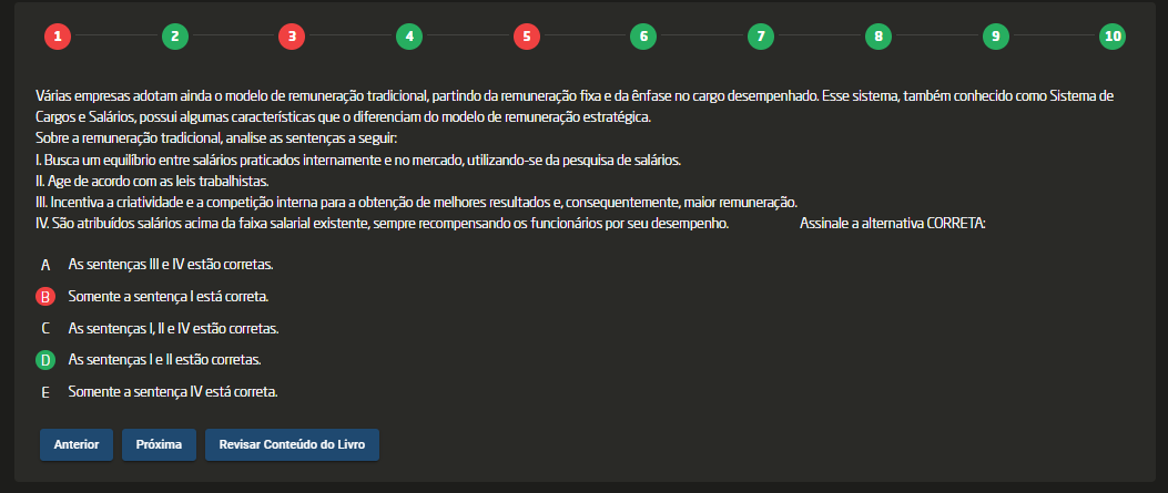 <p>1 2 3 4 5 6 7 8 9 10 Várias empresas adotam ainda modelo de remuneração tradicional, partindo da remuneração fixa e da ênfase no cargo desempenhado. Esse sistema, também conhecido como Sistema de Cargos e Salários, possui algumas características que diferenciam do modelo de remuneração estratégica. Sobre a remuneração tradicional, analise as sentenças a Busca um equilibrio entre salários praticados internamente e no mercado, utilizando-se da pesquisa de IL Age de acordo com as leis III Incentiva a criatividade e a competição interna para a obtenção de melhores resultados e, consequentemente, maior remuneração. São atribuídos salários acima da faixa salarial existente, sempre recompensando os funcionários por seu desempenho. Assinale a alternativa CORRETA: A As sentenças III e IV estão Somente a sentença I está correta As sentenças e IV estão D As sentenças I e II estão corretas E Somente a sentença IV está correta. Anterior Próxima Revisar Conteúdo do Livro</p>