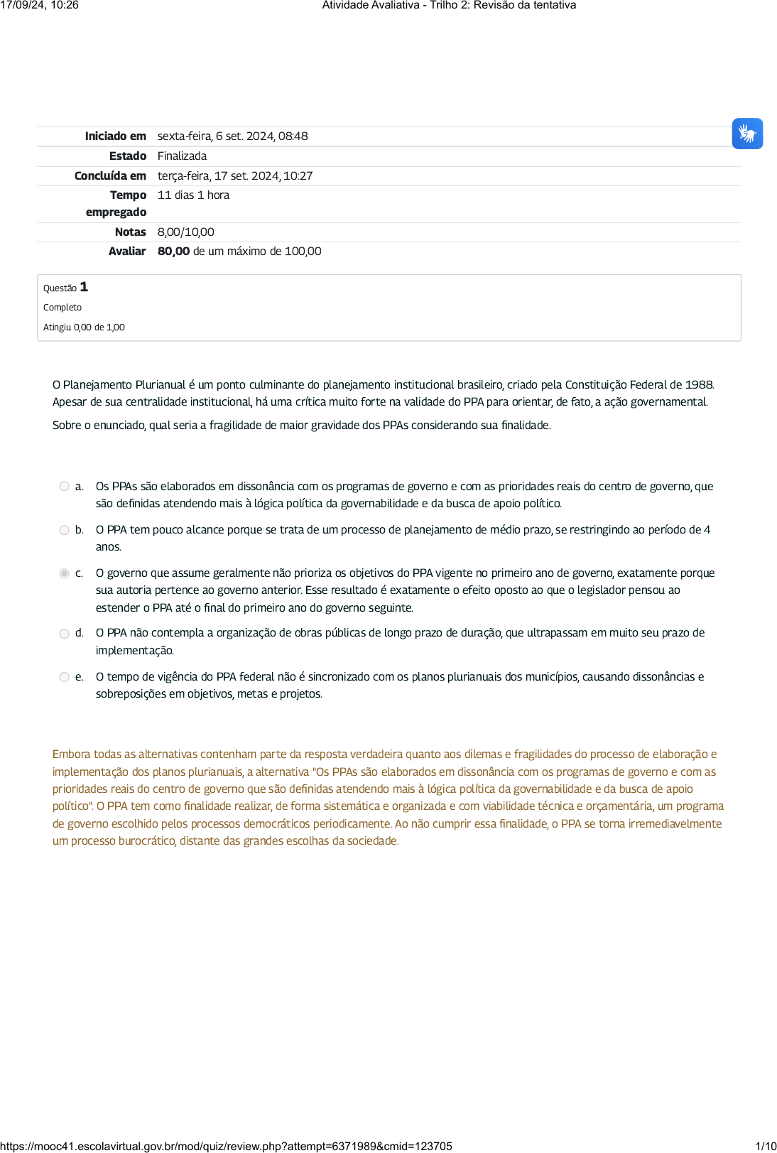 <p>Iniciado em sexta-feira, 6 set. 2024, 08:48</p><p>Estado Finalizada</p><p>Concluída em terça-feira, 17 set. 2024, 10:27</p><p>Tempo</p><p>empregado</p><p>11 dias 1 hora</p><p>Notas 8,00/10,00</p><p>Avaliar 80,00 de um máximo de 100,00</p><p>Questão 1</p><p>Completo</p><p>Atingiu 0,00 de 1,00</p><p>O Planejamento Plurianual é um ponto culminante do planejamento institucional brasileiro, criado pela Constituição Federal de 1988.</p><p>Apesar de sua centralidade institucional, há uma crítica muito forte na validade do PPA para orientar, de fato, a ação governamental.</p><p>Sobre o enunciado, qual seria a fragilidade de maior gravidade dos PPAs considerando sua �nalidade.</p><p>a. Os PPAs são elaborados em dissonância com os programas de governo e com as prioridades reais do centro de governo, que</p><p>são de�nidas atendendo mais à lógica política da governabilidade e da busca de apoio político.</p><p>b. O PPA tem pouco alcance porque se trata de um processo de planejamento de médio prazo, se restringindo ao período de 4</p><p>anos.</p><p>c. O governo que assume geralmente não prioriza os objetivos do PPA vigente no primeiro ano de governo, exatamente porque</p><p>sua autoria pertence ao governo anterior. Esse resultado é exatamente o efeito oposto ao que o legislador pensou ao</p><p>estender o PPA até o �nal do primeiro ano do governo seguinte.</p><p>d. O PPA não contempla a organização de obras públicas de longo prazo de duração, que ultrapassam em muito seu prazo de</p><p>implementação.</p><p>e. O tempo de vigência do PPA federal não é sincronizado com os planos plurianuais dos municípios, causando dissonâncias e</p><p>sobreposições em objetivos, metas e projetos.</p><p>Embora todas as alternativas contenham parte da resposta verdadeira quanto aos dilemas e fragilidades do processo de elaboração e</p><p>implementação dos planos plurianuais, a alternativa "Os PPAs são elaborados em dissonância com os programas de governo e com as</p><p>prioridades reais do centro de governo que são de�nidas atendendo mais à lógica política da governabilidade e da busca de apoio</p><p>político". O PPA tem como �nalidade realizar, de forma sistemática e organizada e com viabilidade técnica e orçamentária, um programa</p><p>de governo escolhido pelos processos democráticos periodicamente. Ao não cumprir essa �nalidade, o PPA se torna irremediavelmente</p><p>um processo burocrático, distante das grandes escolhas da sociedade.</p><p>17/09/24, 10:26 Atividade Avaliativa - Trilho 2: Revisão da tentativa</p><p>https://mooc41.escolavirtual.gov.br/mod/quiz/review.php?attempt=6371989&cmid=123705 1/10</p><p>Questão 2</p><p>Completo</p><p>Atingiu 1,00 de 1,00</p><p>O uso do Modelo Lógico já é uma tradição na gestão de projetos e no planejamento governamental, exigindo dos grupos de</p><p>planejamento uma clareza robusta sobre quais são os problemas a que a política pública pretende enfrentar.</p><p>Sobre as principais vantagens ou benefícios do uso do modelo lógico, qual a alternativa que reúne a opção mais adequada e</p><p>abrangente?</p><p>a. Melhora a comunicação entre os membros da equipe do projeto; ajuda a identi�car e gerenciar o orçamento; facilita o</p><p>monitoramento e controle da agenda; melhora a tomada de decisões e aumenta a precisão do cronograma.</p><p>b. Melhora a comunicação entre clientes e fornecedores; ajuda a identi�car e gerenciar riscos; facilita a redação de relatórios;</p><p>melhora a tomada de decisões e aumenta a probabilidade de sucesso do projeto.</p><p>c. Melhora a comunicação entre os membros da equipe do projeto; ajuda a identi�car e gerenciar riscos; facilita o monitoramento</p><p>e controle do projeto; melhora a relação de hierarquia e comando e aumenta a probabilidade de sucesso do projeto.</p><p>d. Melhora a comunicação entre os membros da equipe do projeto; ajuda a identi�car e gerenciar riscos; facilita o monitoramento</p><p>e controle do projeto; melhora a tomada de decisões e aumenta a probabilidade de sucesso do projeto.</p><p>e. Melhora a comunicação entre os membros da equipe do projeto; ajuda a identi�car e gerenciar riscos; facilita o monitoramento</p><p>e controle do projeto; melhora a tomada de decisão e diminui a probabilidade de sucesso do projeto</p><p>O modelo lógico melhora a comunicação entre os membros da equipe do projeto; ajuda a identi�car e gerenciar riscos; facilita o</p><p>monitoramento e controle do projeto; melhora a tomada de decisões e aumenta a probabilidade de sucesso do projeto. Ele não tem</p><p>relação direta com temas orçamentários, hierárquicos, relatórios, nem com de�nição do cronograma, embora possa indiretamente</p><p>in�uenciar tais questões.</p><p>17/09/24, 10:26 Atividade Avaliativa - Trilho 2: Revisão da tentativa</p><p>https://mooc41.escolavirtual.gov.br/mod/quiz/review.php?attempt=6371989&cmid=123705 2/10</p><p>Questão 3</p><p>Completo</p><p>Atingiu 1,00 de 1,00</p><p>A categoria “Programa”, entre os componentes do planejamento plurianual, é a mais importante porque conecta as diretrizes</p><p>estratégicas com a dimensão tático e operacional.</p><p>Partindo desta percepção, indique a melhor alternativa que de�ne o papel do programa.</p><p>a. Orientações que regulam o caminho a seguir, estabelecendo critérios que determinam e direcionam as ações para superação</p><p>dos desa�os compreendidos em cada Eixo Temático.</p><p>b. Agrupam os desa�os a serem enfrentados no período do PPA, de acordo com suas temáticas centrais.</p><p>c. Conjunto de princípios e atitudes que orientam as decisões de governo. Devem guiar o comportamento de todos os que</p><p>contribuem para a ação estatal.</p><p>d. Declarações objetivas e concisas que indicam as mudanças que precisam ser realizadas para atingir a Visão de Futuro.</p><p>e. Cumpre o papel de materializar os objetivos declarados na D
