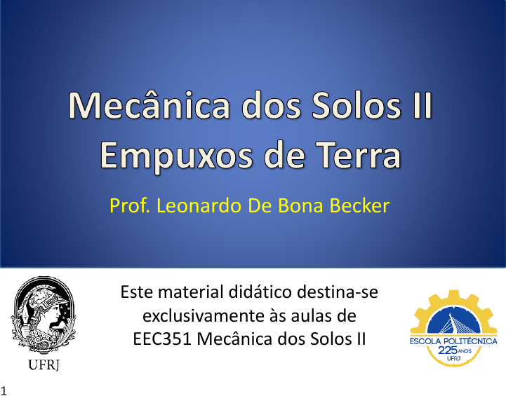 <p>Prof. Leonardo De Bona Becker</p><p>Este material didático destinase</p><p>exclusivamente às aulas de</p><p>EEC351 Mecânica dos Solos II</p><p>1</p><p> Diversas estruturas de engenharia civil tem</p><p>paramentos em contato com o solo</p><p> Paramento = face vertical (ou inclinada) de uma</p><p>estrutura que está em contato com o solo</p><p> Estas obras podem ser denominadas:</p><p> Estruturas de contenção</p><p> Estruturas de arrimo</p><p> Muros de contenção</p><p> Muros de arrimo</p><p> Retaining structures, retaining walls etc</p><p>Prof. Leonardo De Bona Becker</p><p>3</p><p>Prof. Leonardo De Bona Becker</p><p>4</p><p>Prof. Leonardo De Bona Becker</p><p>5</p><p> Exemplos de finalidades das estruturas de contenção:</p><p> Conter taludes instáveis em obras residenciais, comerciais,</p><p>industriais, rodoviárias, ferroviárias, portuárias etc.</p><p> Permitir aproveitamento de espaço em áreas urbanas,</p><p>industriais etc.</p><p> Conter escavações para construir subsolos, túneis, metrôs etc.</p><p> Permitir dragagem de canais e portos</p><p> Conter aterros de encontro de ponte / viaduto</p><p> Conter aterros de retro-áreas de portos</p><p> Permitir estocagem de rejeitos de mineração ou resíduos</p><p>sólidos</p><p> Etc...</p><p>Prof. Leonardo De Bona Becker</p><p>6</p><p> Materiais usuais:</p><p> Alvenaria de pedras</p><p> Concreto ciclópico</p><p> Concreto armado</p><p> Solo compactado com reforços metálicos e faceamento em</p><p>painéis de concreto pré-moldado</p><p> Solo compactado com reforços geossintéticos e faceamento</p><p>em painéis de concreto pré-moldado</p><p> Solo compactado com reforços geossintéticos e faceamento</p><p>auto envelopado</p><p> Paredes de concreto armado (cortinas) com ancoragens</p><p>(tirantes de aço chumbados no terreno)</p><p> Cortinas de estacas-prancha (geralmente de metal) com ou</p><p>sem ancoragens</p><p> Etc</p><p>Prof. Leonardo De Bona Becker</p><p>7</p><p>Prof. Leonardo De Bona Becker</p><p>Solo natural</p><p>Local para construção</p><p>de uma estrada</p><p> Exemplos de estruturas com paramentos que interagem com o solo:</p><p>muro de arrimo em concreto ciclópico</p><p>8</p><p>Perfil inicial</p><p>do terreno</p><p>Prof. Leonardo De Bona Becker</p><p>Solo natural</p><p>Escavação provisória</p><p> Exemplos de estruturas com paramentos que interagem com o solo:</p><p>muro de arrimo em concreto ciclópico</p><p>Local para construção</p><p>de uma estrada</p><p>9</p><p>Perfil inicial</p><p>do terreno</p><p>Prof. Leonardo De Bona Becker</p><p>Solo natural</p><p> Exemplos de estruturas com paramentos que interagem com o solo:</p><p>muro de arrimo em concreto ciclópico</p><p>Local para construção</p><p>de uma estrada</p><p>10</p><p>Prof. Leonardo De Bona Becker</p><p>Reaterro</p><p>compactado</p><p>Solo natural</p><p>Perfil inicial</p><p>do terreno</p><p> Exemplos de estruturas com paramentos que interagem com o solo:</p><p>muro de arrimo em concreto ciclópico</p><p>Local para construção</p><p>de uma estrada</p><p>11</p><p> Exemplos de estruturas com paramentos que interagem com o solo:</p><p>parede enterrada</p><p>Prof. Leonardo De Bona Becker</p><p>Diagrama das tensões do solo que a</p><p>parede deve suportar</p><p>A resultante destas tensões é</p><p>chamada de EMPUXO DE TERRA</p><p>13</p><p>Prof. Leonardo De Bona Becker</p><p> Exemplos de estruturas com paramentos que interagem com o solo:</p><p>muro de arrimo em blocos de pedra</p><p>14</p><p>Prof. Leonardo De Bona Becker</p><p> Exemplos de estruturas com paramentos que interagem com o solo:</p><p>muro em concreto armado (muro de flexão, muro em L)</p><p>15</p><p> Muro de gabiões</p><p>Prof. Leonardo De Bona Becker</p><p>16</p><p> Muro de gabiões</p><p>Prof. Leonardo De Bona Becker</p><p>17</p><p> Muro de gabiões</p><p>Prof. Leonardo De Bona Becker</p><p>18</p><p>Prof. Leonardo De Bona Becker</p><p>Caixas de</p><p>tela metálica</p><p>preenchidas</p><p>com pedras</p><p> Exemplos de estruturas com paramentos que interagem com o solo:</p><p>muro de gabiões</p><p>19</p><p> Exemplos de estruturas com paramentos que interagem com o solo:</p><p>parede (cortina) de estacas-prancha</p><p>Prof. Leonardo De Bona Becker</p><p>Estacas-prancha</p><p>metálicas</p><p>20</p><p>Prof. Leonardo De Bona Becker</p><p> Seção transversal de um modelo de estaca prancha metálica</p><p>Dimensões em mm</p><p>21</p><p>Prof. Leonardo De Bona Becker</p><p>Estrutura de contenção em</p><p>estaca-prancha metálica</p><p>(finalidade: contenção de</p><p>escavação / dragagem)</p><p>Estacas-prancha metálicas</p><p> Exemplos de estruturas com paramentos que interagem com o solo:</p><p>cortina de estaca prancha metálica com ancoragem</p><p>22</p><p>Prof. Leonardo De Bona Becker</p><p>Tirante de aço</p><p>Cortina ancorada</p><p> Exemplos de estruturas com paramentos que interagem com o solo:</p><p>cortina de concreto armado ancorada</p><p>24</p><p>Prof. Leonardo De Bona Becker</p><p> Exemplos de estruturas com paramentos que interagem com o solo:</p><p>cortina ancorada em concreto armado</p><p>25</p><p>Prof. Leonardo De Bona Becker</p><p> Exemplos de estruturas com paramentos que interagem com o solo:</p><p>cortina ancorada em concreto armado</p><p>26</p><p>Prof. Leonardo De Bona Becker</p><p>Parede de</p><p>concreto armado</p><p> Exemplos de estruturas com</p><p>paramentos que interagem</p><p>com o solo: cortina ancorada</p><p>em concreto armado</p><p>Cordoalha de aço</p><p>27</p><p> Exemplos de estruturas com paramentos que interagem com o solo:</p><p>muro de solo reforçado com geossintéticos e face em blocos pré</p><p>moldados</p><p>Prof. Leonardo De Bona Becker</p><p>28</p><p>Prof. Leonardo De Bona Becker</p><p> Exemplos de estruturas com paramentos que interagem com o solo:</p><p>muro de solo reforçado com geossintéticos e face em blocos pré</p><p>moldados</p><p>29</p><p>Prof. Leonardo De Bona Becker</p><p> Exemplos de estruturas com paramentos que inte