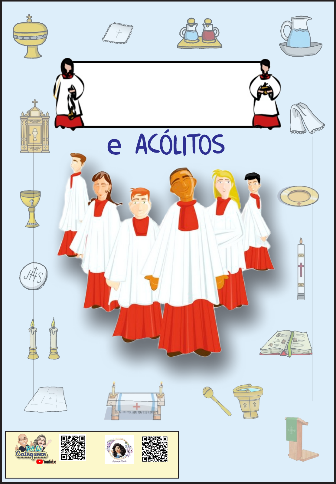 <p>Coroinhas</p><p>Formação para</p><p>Criado pela equipe do</p><p>Canal: ReLi Catequese</p><p>Em parceria com Grupos</p><p>Catequista Silvinha</p><p>Esta é uma obra de cunho evangelizador, e não pode ser</p><p>comercializada, se você a comprou, denuncie!</p><p>Distribuição Gratuita</p><p>Através do Canal: ReLi Catequese</p><p>YouTube</p><p>e dos Grupos da Catequista Silvinha</p><p>What’sApp, Telegram e Facebook</p><p>DIFERENÇA ENTRE COROINHA E ACÓLITO:</p><p>O termo acólito é de origem grega, akólouthos, que significa “servidor, seguidor ou acompanhante”. A diferença</p><p>entre coroinha e o acólito se dá basicamente pela idade. O ministério de coroinhas é mais próprio de crianças e</p><p>adolescentes, meninos e meninas, geralmente na etapa da catequese. Os dois, tanto o coroinha, quanto o acólito,</p><p>desempenham a função de ajudar no serviço do altar, auxiliando os celebrantes na condução das missas. Outra</p><p>diferença é que os acólitos são instituídos pelo bispo, e os coroinhas não. Quando necessário, o acólito pode</p><p>distribuir a comunhão aos fiéis, como ministro extraordinário, durante a missa ou fora dela aos enfermos.</p><p>Pode conduzir a exposição do Santíssimo para adoração, mas não pode dar a bênção. Enfim, o acólito está a</p><p>serviço da liturgia.</p><p>QUAIS AS PRINCIPAIS FUNÇÕES DO COROINHA?</p><p>O coroinha fica responsável por todas as funções da</p><p>liturgia que não exigem investidura do bispo. Ajudam a</p><p>preparar o altar, a manusear os livros e objetos</p><p>litúrgicos utilizados, cuida das velas, do turíbulo e</p><p>naveta, a organizar procissões, entre outras funções,</p><p>e sempre estão prontos para qualquer serviço que seja</p><p>necessário para uma boa celebração.</p><p>O QUE É SER COROINHA OU ACÓLITO?</p><p>Os coroinhas ou acólitos são um grupo de crianças e adolescentes</p><p>que auxiliam o padre ou celebrante nos serviços das Celebrações</p><p>Litúrgicas. Estes jovens e crianças realizam funções que são</p><p>indispensáveis, especialmente nas Santas Missas. O desejo dos</p><p>coroinhas é tratar com respeito todas as pessoas da comunidade,</p><p>servindo ao Altar de Deus e atuando ativamente na vida da Igreja. Suas</p><p>principais características são: responsabilidade, compromisso,</p><p>humildade e disponibilidade para servir.</p><p>ORIGEM DO TERMO:</p><p>O termo coroinha vem da antiga celebração da missa, em que</p><p>as canções eram cantadas em coro. Ocasionalmente, alguns</p><p>dos meninos do coro eram solicitados para auxiliar os</p><p>padres na celebração da missa, onde receberam o nome DE</p><p>coroinhas. Em 1994, o papa João Paulo II autorizou que</p><p>meninas também servissem no Altar.</p><p>01</p><p>VESTES LITÚRGICAS:</p><p>A veste deve ser definida pela tradição local. No Rito Romano o</p><p>costume sempre foi túnica vermelha com sobrepeliz branca.</p><p>Normalmente se costuma usar a túnica vermelha para os</p><p>coroinhas/acólitos e a preta apenas para os seminaristas.</p><p>INFORMAÇÕES IMPORTANTES:</p><p>Para participar do Grupo de Coroinhas, a idade mínima é de 6 anos, e do Grupo de Acólitos, é de 15 anos.</p><p>Podem participar crianças, adolescentes e jovens que já tenham sido batizados.</p><p>Nos Encontros de preparação os candidatos entendem o significado de cada parte da missa e a função litúrgica</p><p>que eles exercem, têm a oportunidade de aprofundar o conhecimento e vivência da espiritualidade litúrgica de</p><p>forma bem simples.</p><p>O PADROEIRO DOS COROINHAS:</p><p>O padroeiro dos coroinhas é São Tarcísio, jovem católico que morreu por</p><p>volta dos anos 200, protegendo uma partícula consagrada no Corpo de</p><p>Cristo. Neste santo nos espelhamos, a fim de cumprirmos nossas tarefas no</p><p>altar com muito amor e carinho.</p><p>Todas as crianças e adolescentes são chamados, na Igreja, a realizar este</p><p>trabalho voluntário tão bonito e necessário!</p><p>Coroinhas e acólitos, todos são muito importantes para o bom êxito e vida da liturgia. É importante lembrar</p><p>que é dentro do grupo de coroinhas e acólitos que nasceram muitas vocações sacerdotais e religiosas. Daí a</p><p>importância de incentivar a participação nesses ministérios.</p><p>O QUE O COROINHA DEVE CONHECER?</p><p>1.A Santa Missa, parte por parte; 2. Os lugares da igreja; 3.</p><p>Os Livros Sagrados; 4. Os utensílios usados na celebração; 5.</p><p>As vestes litúrgicas; 6. Os Tempos Litúrgicos; 7. Principais</p><p>Orações; 8. SACRAMENTOS; ETC...</p><p>02</p><p>Viu só quantas possibilidades você pode ter como</p><p>coroinha? O serviço ao altar pode ser sempre uma</p><p>novidade! A cada celebração, uma oportunidade de</p><p>desempenhar novas funções. Experimente!</p><p>Cerimoniário: É encarregado</p><p>da organização e direção</p><p>dos ofícios litúrgicos. É</p><p>como um mestre de</p><p>cerimônias.</p><p>Librífero: Coroinha ou acólito encarregado</p><p>de conduzir e apresentar os Livros</p><p>Sagrados (Bíblia, Missal, Lecionário,</p><p>Evangeliário) usados durante as cerimônias</p><p>litúrgicas. Os libríferos apresentam os</p><p>livros segurando com as duas mãos.</p><p>Cruciferário: É aquele</p><p>que carrega a cruz</p><p>processional durante</p><p>a entrada e saída do</p><p>presbitério.</p><p>Ceroferário ou Ceriferário: É o coroinha</p><p>que carrega a vela durante as celebrações.</p><p>Quando as velas vão na procissão de</p><p>entrada, os ceriferários caminham atrás</p><p>do turiferário e do naveteiro, que são os</p><p>primeiros na fila de entrada.</p><p>Naveteiro: É aquele que conduz a</p><p>naveta na procissão. A naveta é</p><p>usada para guardar o incenso que</p><p>será colocado no turíbulo.</p><p>Turiferário: Nome dado ao coroinha que</p><p>é escolhido para manusear o turíbulo.</p><p>O turíbulo é aquela peça usada para</p><p>incensar – queimar 