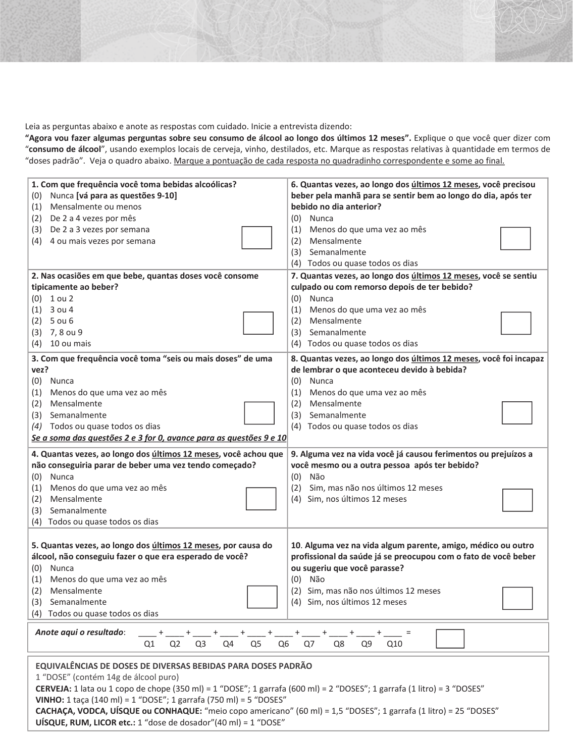 <p>AUDIT</p><p>Teste para Identificação de Problemas Relacionados ao Uso de Álcool</p><p>Leia as perguntas abaixo e anote as respostas com cuidado. Inicie a entrevista dizendo:</p><p>“Agora vou fazer algumas perguntas sobre seu consumo de álcool ao longo dos últimos 12 meses”. Explique o que você quer dizer com</p><p>“consumo de álcool”, usando exemplos locais de cerveja, vinho, destilados, etc. Marque as respostas relativas à quantidade em termos de</p><p>“doses padrão”. Veja o quadro abaixo. Marque a pontuação de cada resposta no quadradinho correspondente e some ao final.</p><p>1. Com que frequência você toma bebidas alcoólicas?</p><p>(0) Nunca [vá para as questões 9-10]</p><p>(1) Mensalmente ou menos</p><p>(2) De 2 a 4 vezes por mês</p><p>(3) De 2 a 3 vezes por semana</p><p>(4) 4 ou mais vezes por semana</p><p>6. Quantas vezes, ao longo dos últimos 12 meses, você precisou</p><p>beber pela manhã para se sentir bem ao longo do dia, após ter</p><p>bebido no dia anterior?</p><p>(0) Nunca</p><p>(1) Menos do que uma vez ao mês</p><p>(2) Mensalmente</p><p>(3) Semanalmente</p><p>(4) Todos ou quase todos os dias</p><p>2. Nas ocasiões em que bebe, quantas doses você consome</p><p>tipicamente ao beber?</p><p>(0) 1 ou 2</p><p>(1) 3 ou 4</p><p>(2) 5 ou 6</p><p>(3) 7, 8 ou 9</p><p>(4) 10 ou mais</p><p>7. Quantas vezes, ao longo dos últimos 12 meses, você se sentiu</p><p>culpado ou com remorso depois de ter bebido?</p><p>(0) Nunca</p><p>(1) Menos do que uma vez ao mês</p><p>(2) Mensalmente</p><p>(3) Semanalmente</p><p>(4) Todos ou quase todos os dias</p><p>3. Com que frequência você toma “seis ou mais doses” de uma</p><p>vez?</p><p>(0) Nunca</p><p>(1) Menos do que uma vez ao mês</p><p>(2) Mensalmente</p><p>(3) Semanalmente</p><p>(4) Todos ou quase todos os dias</p><p>Se a soma das questões 2 e 3 for 0, avance para as questões 9 e 10</p><p>8. Quantas vezes, ao longo dos últimos 12 meses, você foi incapaz</p><p>de lembrar o que aconteceu devido à bebida?</p><p>(0) Nunca</p><p>(1) Menos do que uma vez ao mês</p><p>(2) Mensalmente</p><p>(3) Semanalmente</p><p>(4) Todos ou quase todos os dias</p><p>4. Quantas vezes, ao longo dos últimos 12 meses, você achou que</p><p>não conseguiria parar de beber uma vez tendo começado?</p><p>(0) Nunca</p><p>(1) Menos do que uma vez ao mês</p><p>(2) Mensalmente</p><p>(3) Semanalmente</p><p>(4) Todos ou quase todos os dias</p><p>9. Alguma vez na vida você já causou ferimentos ou prejuízos a</p><p>você mesmo ou a outra pessoa após ter bebido?</p><p>(0) Não</p><p>(2) Sim, mas não nos últimos 12 meses</p><p>(4) Sim, nos últimos 12 meses</p><p>5. Quantas vezes, ao longo dos últimos 12 meses, por causa do</p><p>álcool, não conseguiu fazer o que era esperado de você?</p><p>(0) Nunca</p><p>(1) Menos do que uma vez ao mês</p><p>(2) Mensalmente</p><p>(3) Semanalmente</p><p>(4) Todos ou quase todos os dias</p><p>10. Alguma vez na vida algum parente, amigo, médico ou outro</p><p>profissional da saúde já se preocupou com o fato de você beber</p><p>ou sugeriu que você parasse?</p><p>(0) Não</p><p>(2) Sim, mas não nos últimos 12 meses</p><p>(4) Sim, nos últimos 12 meses</p><p>––+</p><p>Anote aqui o resultado: ____ + ____ + ____ + ____ + ____ + ____ + ____ + ____ + ____ + ____ =</p><p>Q1 Q2 Q3 Q4 Q5 Q6 Q7 Q8 Q9 Q10</p><p>EQUIVALÊNCIAS DE DOSES DE DIVERSAS BEBIDAS PARA DOSES PADRÃO</p><p>1 “DOSE” (contém 14g de álcool puro)</p><p>CERVEJA: 1 lata ou 1 copo de chope (350 ml) = 1 “DOSE”; 1 garrafa (600 ml) = 2 “DOSES”; 1 garrafa (1 litro) = 3 “DOSES”</p><p>VINHO: 1 taça (140 ml) = 1 “DOSE”; 1 garrafa (750 ml) = 5 “DOSES”</p><p>CACHAÇA, VODCA, UÍSQUE ou CONHAQUE: “meio copo americano” (60 ml) = 1,5 “DOSES”; 1 garrafa (1 litro) = 25 “DOSES”</p><p>UÍSQUE, RUM, LICOR etc.: 1 “dose de dosador”(40 ml) = 1 “DOSE”</p><p>- Adaptação e Validação para o Brasil por MÉNDEZ, E. B. et al. Uma versão brasileira do AUDIT-Alcohol Use Disorders Identification Test. Pelotas:</p><p>Universidade Federal de Pelotas, 1999.</p><p>- Versão original desenvolvida por SAUNDERS, J. et al. (1993). Disponível em: <http://www.who.int/substance_abuse/activities/sbi/en/index.html>.</p><p>- Este instrumento faz parte do KIT FORMATURA do curso SUPERA, promovido pela Secretaria Nacional de Políticas sobre Drogas – SENAD, do</p><p>Ministério da Justiça, e executado pela Universidade Federal de São Paulo – UNIFESP.</p><p>Nome _____________________________________________________________ Sexo ( ) F ( ) M Idade______ Registro ________</p><p>Entrevistador______________________________________________________ Data__________</p>