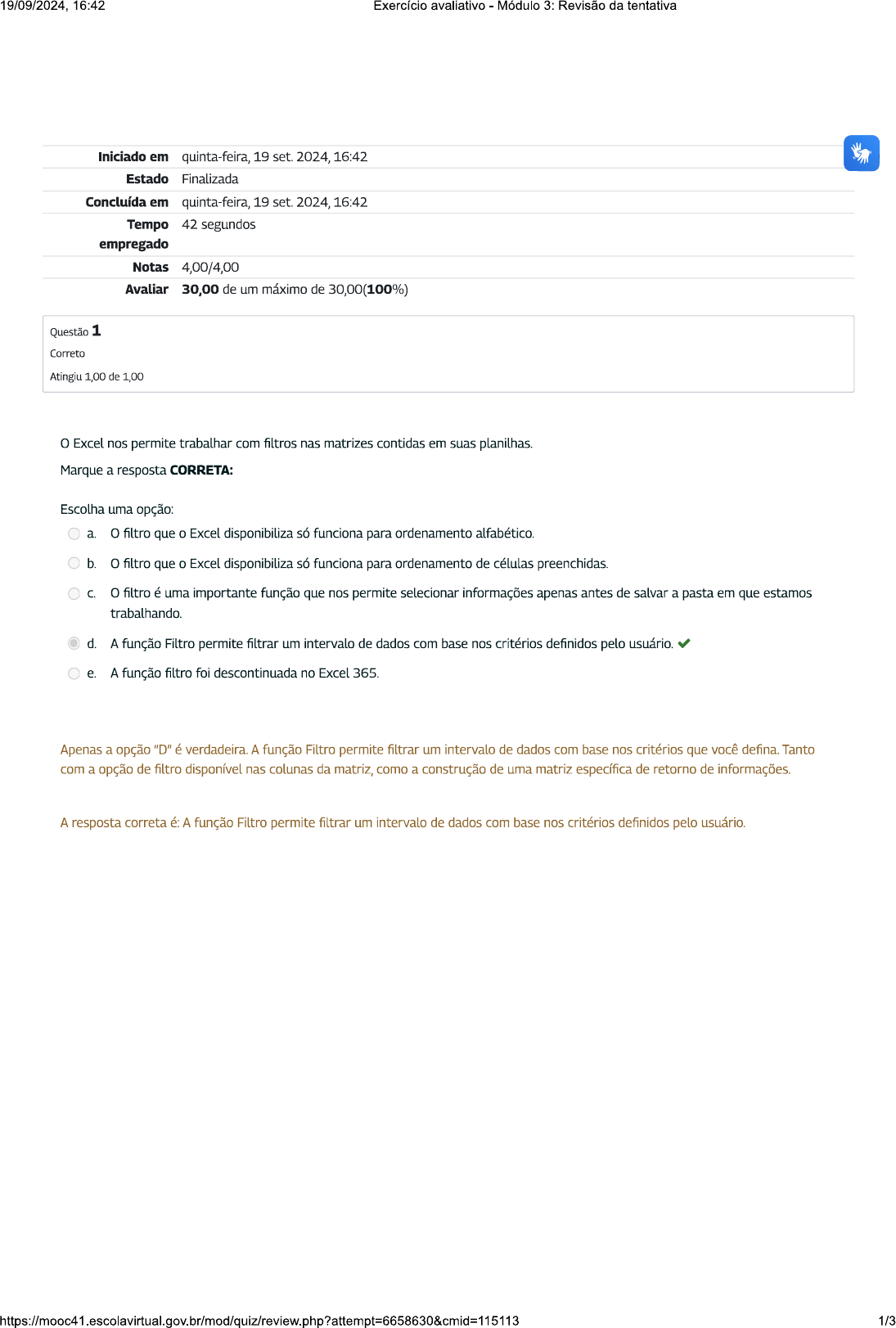 <p>19/09/2024, 16:42 Exercício avaliativo Módulo 3: Revisão da tentativa Iniciado em quinta-feira, 19 set. 2024, 16:42 Estado Finalizada Concluída em quinta-feira, 19 set. 2024, 16:42 Tempo 42 segundos empregado Notas 4,00/4,00 Avaliar 30,00 de um máximo de 30,00(100%) Questão 1 Correto Atingiu 1,00 de 1,00 o Excel nos permite trabalhar com filtros nas matrizes contidas em suas planilhas. Marque a resposta CORRETA: Escolha uma opção: a. filtro que o Excel disponibiliza só funciona para ordenamento alfabético. b. filtro que o Excel disponibiliza só funciona para ordenamento de células preenchidas. C. filtro é uma importante função que nos permite selecionar informações apenas antes de salvar a pasta em que estamos trabalhando. d. A função Filtro permite filtrar um intervalo de dados com base nos critérios definidos pelo usuário. e. A função filtro foi descontinuada no Excel 365. Apenas a opção "D" é verdadeira. A função Filtro permite um intervalo de dados com base nos critérios que você defina. Tanto com a opção de filtro disponível nas colunas da matriz, como a construção de uma matriz específica de retorno de informações. A resposta correta é: A função Filtro permite um intervalo de dados com base nos critérios definidos pelo usuário. 1/3</p><p>19/09/2024, 16:42 Exercício avaliativo Módulo 3: Revisão da tentativa Questão 2 Correto Atingiu 1,00 de 1,00 A Tabela Dinâmica é uma poderosa ferramenta do Excel. Ela utiliza as informações de uma matriz de dados para, de acordo com as escolhas do usuário, apresentar as informações organizadas em linhas e colunas. Quanto a Tabela Dinâmica, marque a resposta CORRETA: Escolha uma opção: a. A Tabela Dinâmica só é usada para trabalhar com dados de matrizes que contenham, no máximo, 10 linhas e 10 colunas. b. A Tabela Dinâmica pode auxiliar o usuário a organizar os dados de uma matriz de acordo com a disposição que o usuário preferir. C. A Tabela Dinâmica não pode auxiliar o usuário a organizar os dados de uma matriz de acordo com a disposição que o usuário preferir, pois ela tem apenas 2 formatos de organização de dados. d. A Tabela Dinâmica não serve para trabalhar com valores financeiros, apenas valores em texto. e. A Tabela Dinâmica, diferentemente do que foi enunciado, não apresenta utilidade e, provavelmente, vai ser descontinuada no Excel. A Tabela Dinâmica é uma poderosa ferramenta disponibilizada no Excel. Por meio de sua estrutura e forma de apresentação dos dados originários de uma matriz, o usuário pode organizar os dados da matriz original em diferentes formatos, com diferentes disponibilizações gráficas entre colunas e linhas, além de permitir a apresentação das informações com diferentes operadores matemáticos, estatísticos e lógicos A resposta correta é: A Tabela Dinâmica pode auxiliar o usuário a organizar os dados de uma matriz de acordo com a disposição que o usuário preferir. Questão 3 Correto Atingiu 1,00 de 1,00 Ao usar as opções de gráficos que o Excel disponibiliza, podemos ganhar muito tempo na construção de informações visuais. Por exemplo, o gráfico de pizza é ótimo para: Marque a resposta que completa CORRETAMENTE o enunciado: Escolha uma opção: a. Apresentar a evolução temporal de uma variável financeira. b. Apresentar a dispersão da cotação de uma ação do mercado financeiro. C. Apresentar uma proporção ou porcentagem do total de alunos de uma sala de aula. d. Nunca ser usado com proporções ou percentagens. e. Ser usado para graficamente a pirâmide etária. Pois já apresenta essa forma. o Excel exige, em sua sintaxe (fórmula), que os textos a serem retornados como respostas às condições estabelecidas no teste lógico estejam entre aspas. Ao não colocar as aspas, o Excel tenta as palavras maior e menor como parte integrante da fórmula a ser executada e não como resposta do teste lógico SE a2>a3. A resposta correta é: Apresentar uma proporção ou porcentagem do total de alunos de uma sala de aula. https://mooc41.escolavirtual.gov.br/mod/quiz/review.php?attempt=6658630&cmid=115113 2/3</p><p>19/09/2024, 16:42 Exercício avaliativo Módulo 3: Revisão da tentativa Questão 4 Correto Atingiu 1,00 de 1,00 Uma operação comum é construirmos gráficos no Excel, transportando-os para o Word (editor de textos). Quais cuidados um usuário do Excel precisa para efetuar essa operação? Marque a resposta que completa CORRETAMENTE o enunciado: Escolha uma opção: a. Não há preocupação, pois o software sempre garantirá a visualização e correta disponibilização das informações no Word, mesmo que fique diferente do gráfico originado no Excel. b. É necessário que o usuário se preocupe com o layout e a qualidade visual das informações após o gráfico ser colado no Word, pois nada adianta utilizarmos um gráfico que não apresente as informações corretas ou que esteja com a visualização imperfeita, já que os gráficos devem servir para melhor apresentar informações e conhecimento. C. usuário precisa se preocupar apenas com o tamanho do gráfico no Word, pois no Excel não é necessário se preocupar com o layout dos dados nem com a qualidade da visualização das informações. d. Nunca se deve usar gráficos no Word, pois ele é um editor de textos. e. usuário precisa se preocupar apenas com a capacidade computacional de seu equipamento, pois essa operação de copiar um gráfico no Excel e levar para o Word exige demasiados recursos do computador. Sua resposta está correta. Apenas a opção "B" está correta. Ao utilizarmos informações gráficas, elas precisam significar algo para quem está produzindo a informação e necessita transmitir esse significado para quem está consultando essa informação gráfica (gráfico). Por exemplo, se colarmos um gráfico pizza em um relatório e nele não constar nenhuma legenda ou valores, o leitor do relatório logo descartará qualq