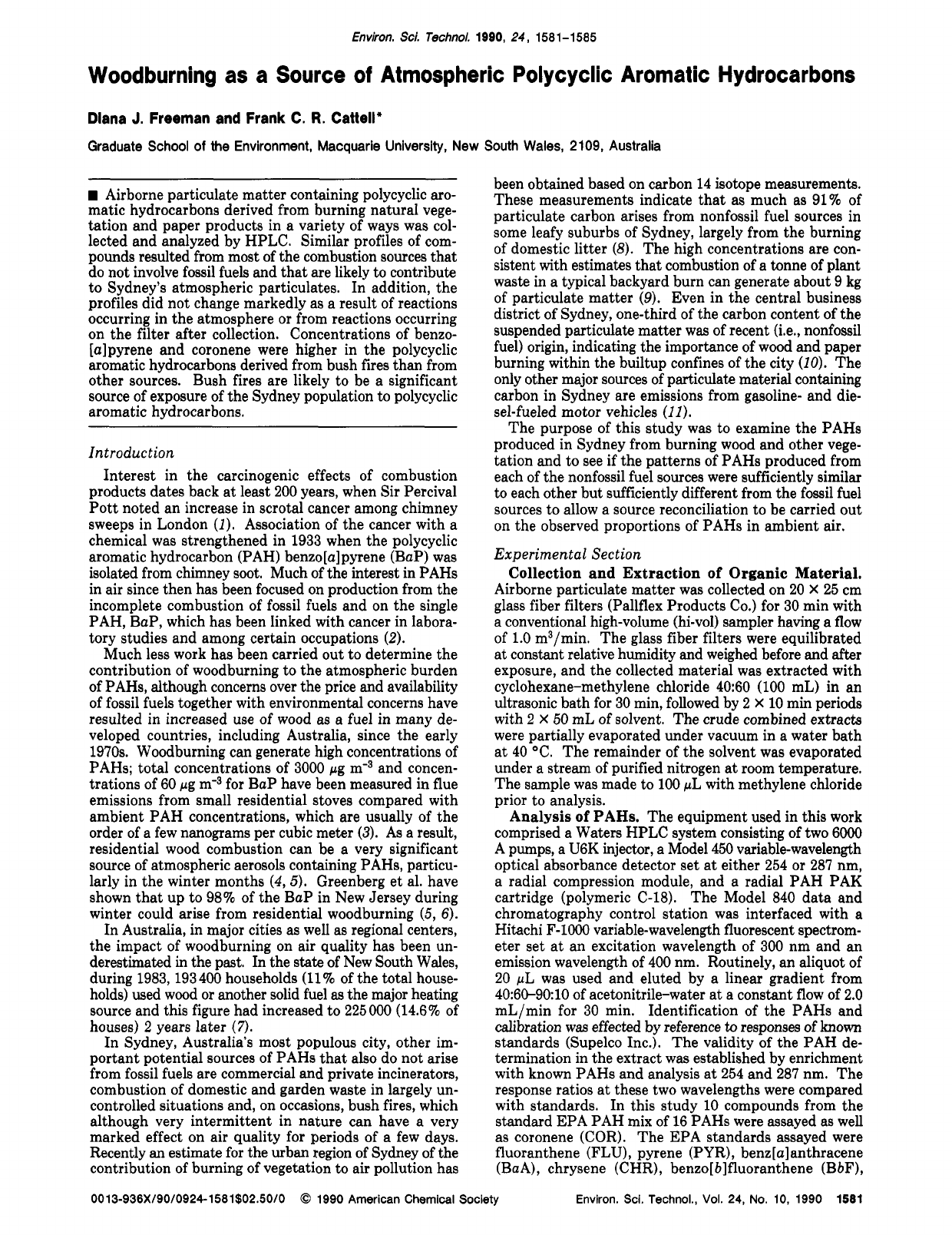 <p>Environ. Sci. Technol. 1990, 24, 1581-1585</p><p>Woodburning as a Source of Atmospheric Polycyclic Aromatic Hydrocarbons</p><p>Diana J. Freeman and Frank C. R. Cattell"</p><p>Graduate School of the Environment, Macquarie University, New South Wales, 2 109, Australia</p><p>Airborne particulate matter containing polycyclic aro-</p><p>matic hydrocarbons derived from burning natural vege-</p><p>tation and paper products in a variety of ways was col-</p><p>lected and analyzed by HPLC. Similar profiles of com-</p><p>pounds resulted from most of the combustion sources that</p><p>do not involve fossil fuels and that are likely to contribute</p><p>to Sydney's atmospheric particulates. In addition, the</p><p>profiles did not change markedly as a result of reactions</p><p>occurring in the atmosphere or from reactions occurring</p><p>on the filter after collection. Concentrations of benzo-</p><p>[alpyrene and coronene were higher in the polycyclic</p><p>aromatic hydrocarbons derived from bush fires than from</p><p>other sources. Bush fires are likely to be a significant</p><p>source of exposure of the Sydney population to polycyclic</p><p>aromatic hydrocarbons.</p><p>~ ~</p><p>Introduct ion</p><p>Interest in the carcinogenic effects of combustion</p><p>products dates back at least 200 years, when Sir Percival</p><p>Pott noted an increase in scrotal cancer among chimney</p><p>sweeps in London ( I ) . Association of the cancer with a</p><p>chemical was strengthened in 1933 when the polycyclic</p><p>aromatic hydrocarbon (PAH) benzo[a] pyrene (BaP) was</p><p>isolated from chimney soot. Much of the interest in PAHs</p><p>in air since then has been focused on production from the</p><p>incomplete combustion of fossil fuels and on the single</p><p>PAH, BaP, which has been linked with cancer in labora-</p><p>tory studies and among certain occupations (2).</p><p>Much less work has been carried out to determine the</p><p>contribution of woodburning to the atmospheric burden</p><p>of PAHs, although concerns over the price and availability</p><p>of fossil fuels together with environmental concerns have</p><p>resulted in increased use of wood as a fuel in many de-</p><p>veloped countries, including Australia, since the early</p><p>1970s. Woodburning can generate high concentrations of</p><p>PAHs; total concentrations of 3000 pg m-3 and concen-</p><p>trations of 60 pg m-3 for BaP have been measured in flue</p><p>emissions from small residential stoves compared with</p><p>ambient PAH concentrations, which are usually of the</p><p>order of a few nanograms per cubic meter (3). As a result,</p><p>residential wood combustion can be a very significant</p><p>source of atmospheric aerosols containing PAHs, particu-</p><p>larly in the winter months ( 4 , 5 ) . Greenberg et al. have</p><p>shown that up to 98% of the BaP in New Jersey during</p><p>winter could arise from residential woodburning (5, 6) .</p><p>In Australia, in major cities as well as regional centers,</p><p>the impact of woodburning on air quality has been un-</p><p>derestimated in the past. In the state of New South Wales,</p><p>during 1983,193400 households (11% of the total house-</p><p>holds) used wood or another solid fuel as the major heating</p><p>source and this figure had increased to 225000 (14.6% of</p><p>houses) 2 years later (7).</p><p>In Sydney, Australia's most populous city, other im-</p><p>portant potential sources of PAHs that also do not arise</p><p>from fossil fuels are commercial and private incinerators,</p><p>combustion of domestic and garden waste in largely un-</p><p>controlled situations and, on occasions, bush fires, which</p><p>although very intermittent in nature can have a very</p><p>marked effect on air quality for periods of a few days.</p><p>Recently an estimate for the urban region of Sydney of the</p><p>contribution of burning of vegetation to air pollution has</p><p>been obtained based on carbon 14 isotope measurements.</p><p>These measurements indicate that as much as 91% of</p><p>particulate carbon arises from nonfossil fuel sources in</p><p>some leafy suburbs of Sydney, largely from the burning</p><p>of domestic litter (8). The high concentrations are con-</p><p>sistent with estimates that combustion of a tonne of plant</p><p>waste in a typical backyard burn can generate about 9 kg</p><p>of particulate matter (9). Even in the central business</p><p>district of Sydney, one-third of the carbon content of the</p><p>suspended particulate matter was of recent (i.e., nonfossil</p><p>fuel) origin, indicating the importance of wood and paper</p><p>burning within the builtup confines of the city (IO). The</p><p>only other major sources of particulate material containing</p><p>carbon in Sydney are emissions from gasoline- and die-</p><p>sel-fueled motor vehicles (11).</p><p>The purpose of this study was to examine the PAHs</p><p>produced in Sydney from burning wood and other vege-</p><p>tation and to see if the patterns of PAHs produced from</p><p>each of the nonfossil fuel sources were sufficiently similar</p><p>to each other but sufficiently different from the fossil fuel</p><p>sources to allow a source reconciliation to be carried out</p><p>on the observed proportions of PAHs in ambient air.</p><p>Exper imenta l Sect ion</p><p>Collection and Extraction of Organic Material.</p><p>Airborne particulate matter was collected on 20 X 25 cm</p><p>glass fiber filters (Pallflex Products Co.) for 30 min with</p><p>a conventional high-volume (hi-vol) sampler having a flow</p><p>of 1.0 m3/min. The glass fiber filters were equilibrated</p><p>at constant relative humidity and weighed before and after</p><p>exposure, and the collected material was extracted with</p><p>cyclohexane-methylene chloride 40:60 (100 mL) in an</p><p>ultrasonic bath for 30 min, followed by 2 X 10 min periods</p><p>with 2 X 50 mL of solvent. The crude combined extracts</p><p>were partially evaporated under vacuum in a water bath</p><p>at 40 "C. The remainder of the 