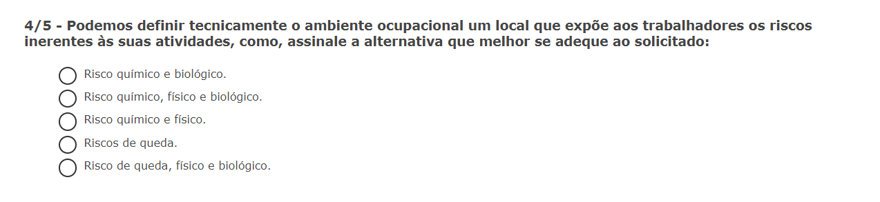 <p>4/5 - Podemos definir tecnicamente o ambiente ocupacional um local que expõe aos trabalhadores os riscos inerentes às suas atividades, como, assinale a alternativa que melhor se adeque ao solicitado: Risco químico e biológico. Risco químico, físico e biológico. Risco químico e físico. Riscos de queda. Risco de queda, físico e biológico.</p>