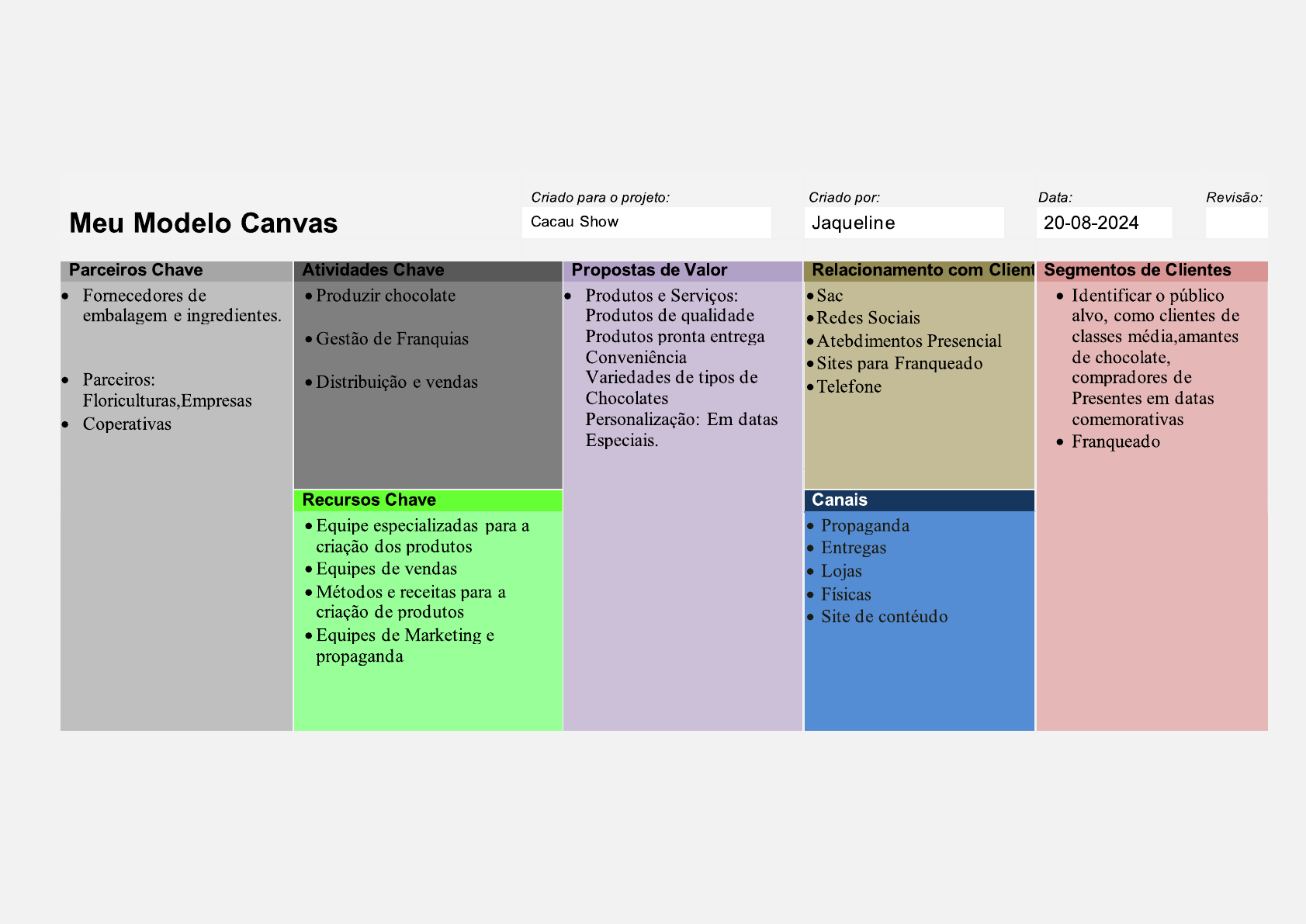 <p>Criado para o projeto: Criado por: Data: Revisão: Meu Modelo Canvas Cacau Show Jaqueline 20-08-2024 Parceiros Chave Atividades Chave Propostas de Valor Relacionamento com Client Segmentos de Clientes Fornecedores de Produzir chocolate Produtos e Serviços: Sac Identificar o público embalagem e ingredientes. Produtos de qualidade Redes Sociais alvo, como clientes de Gestão de Franquias Produtos pronta entrega Atebdimentos Presencial classes média,amantes Conveniência Sites para Franqueado de chocolate, Parceiros: Distribuição e vendas Variedades de tipos de Telefone compradores de Floriculturas, Empresas Chocolates Presentes em datas Coperativas Personalização: Em datas comemorativas Especiais. Franqueado Recursos Chave Canais Equipe especializadas para a Propaganda criação dos produtos Entregas Equipes de vendas Lojas Métodos e receitas para a Físicas criação de produtos Site de contéudo Equipes de Marketing e propaganda</p><p>Estrutura de Custos Fontes de Renda Custo de Matéria prima Vendas direitas de Produtos especialmente em datas sazonais Custo de mão de obra Franquias Custo de Infraestrutura Retorno de Públicidades Custo de manuntenção do site e redes Social Pagamentos dos parceiros contratados Aluguel</p>