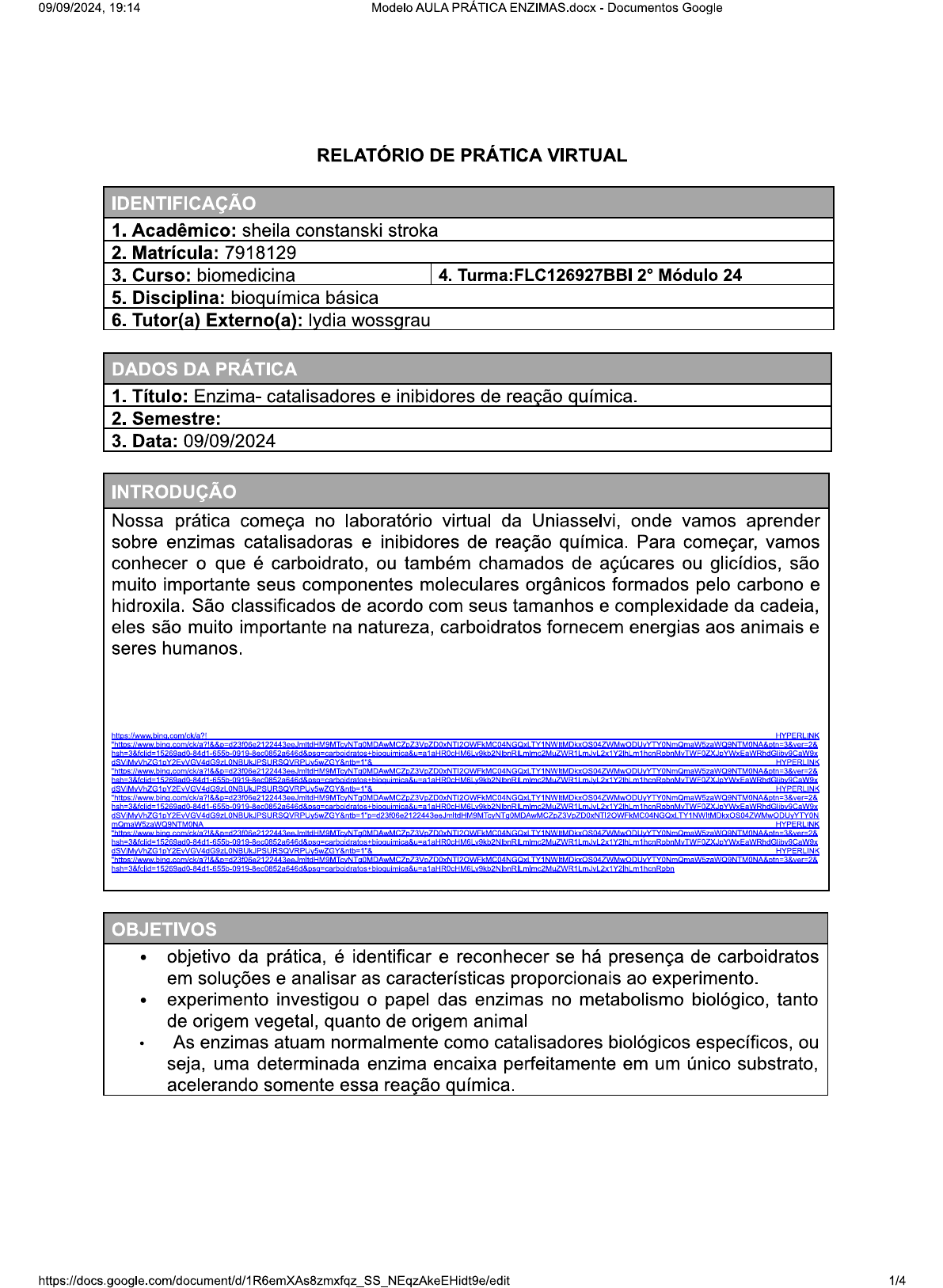 <p>09/09/2024, 19:14 Modelo AULA PRÁTICA ENZIMAS.docx Documentos Google RELATÓRIO DE PRÁTICA VIRTUAL IDENTIFICAÇÃO 1. Acadêmico: sheila constanski stroka 2. Matrícula: 7918129 3. Curso: biomedicina 4. Turma:FLC126927BBI 2° Módulo 24 5. Disciplina: bioquímica básica 6. Tutor(a) Externo(a): lydia wossgrau DADOS DA PRÁTICA 1. Título: Enzima- catalisadores e inibidores de reação química. 2. Semestre: 3. Data: 09/09/2024 INTRODUÇÃO Nossa prática começa no laboratório virtual da Uniasselvi, onde vamos aprender sobre enzimas catalisadoras e inibidores de reação química. Para começar, vamos conhecer o que é carboidrato, ou também chamados de açúcares ou glicídios, são muito importante seus componentes moleculares orgânicos formados pelo carbono e hidroxila. São classificados de acordo com seus tamanhos e complexidade da cadeia, eles são muito importante na natureza, carboidratos fornecem energias aos animais e seres humanos. HYPERLINK HYPERLINK HYPERLINK OBJETIVOS objetivo da prática, é identificar e reconhecer se há presença de carboidratos em soluções e analisar as características proporcionais ao experimento. experimento investigou o papel das enzimas no metabolismo biológico, tanto de origem vegetal, quanto de origem animal As enzimas atuam normalmente como catalisadores biológicos específicos, ou seja, uma determinada enzima encaixa perfeitamente em um único substrato, acelerando somente essa reação química. 1/4</p><p>09/09/2024, 19:14 Modelo AULA PRÁTICA ENZIMAS.docx Documentos Google MATERIAIS luvas, jaleco, pipeta pasteur de 1 ml óculos, béqueres de 50ml, suco de limão água oxigenada, vidros de petri pedaços de fígados cru e cozido batata crua, batata cozida METODOLOGIA Quando abrimos o laboratório virtual da Uniasselvi, encontramos alguns materiais utilizados já na bancada, logo precisamos colocar os epis, e assim começar o experimento. Logo pegamos três frascos de béquer,pegamos água oxigenada e colocamos dentro dos béqueres, logo pegamos as batatas cruas na posição um,e batata cozida no béquer dois. No béquer um, temos uma reação onde a batata com a água começa a borbulhar, ela está separando o oxigênio da batata crua e da água. em seguida, pegamos os vidros de petri, quatro vidros, na posição três colocamos um pedaço de fígado cru, e no vidro quatro um pedaço cru, logo ponhamos um pouco de suco de limão fresco na opção três e quatro, não havendo nenhuma reação. voltamos e com a água oxigenada e colocamos nos vidros um e dois o que gerou uma reação de borbulhar no fígado cru sem suco de limão. RESULTADOS E DISCUSSÕES No experimento com batatas cruas causou efervescência na água oxigenada pois houve quebra de enzimas, já nas batatas cozidas causou desnaturação da enzima. No experimento com fígados crus também causou uma efervescência na água oxigenada, o oxigênio foi para parte superior do fígado. No fígado cozido não houve nenhuma reação. 2/4</p><p>09/09/2024, 19:14 Modelo AULA PRÁTICA ENZIMAS.docx - Documentos Google REGISTRO FOTOGRÁFICO 3/4</p><p>09/09/2024, 19:14 Modelo AULA PRÁTICA ENZIMAS.docx - Documentos Google REFERÊNCIAS https://www.bing.com/ck/a?!HYPERLINK HYPERLINK 4/4</p>