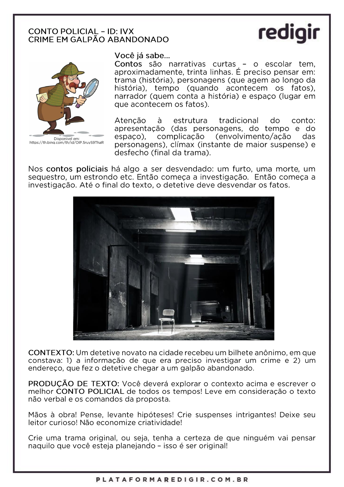 <p>CONTO POLICIAL - ID: IVX CRIME EM GALPÃO ABANDONADO redigir Você já sabe... Contos são narrativas curtas - escolar tem, aproximadamente, trinta linhas. É preciso pensar em: trama (história), personagens (que agem ao longo da história), tempo (quando acontecem os fatos), narrador (quem conta a história) e espaço (lugar em que acontecem os fatos). Atenção à estrutura tradicional do conto: apresentação (das personagens, do tempo e do Disponível em: espaço), complicação (envolvimento/ação das https://th.bing.com/th/id/OIP.5ruyS9Thal personagens), clímax (instante de maior suspense) e desfecho (final da trama). Nos contos policiais há algo a ser desvendado: um furto, uma morte, um sequestro, um estrondo etc. Então começa a investigação. Então começa a investigação. Até final do texto, detetive deve desvendar os fatos. CONTEXTO: Um detetive novato na cidade recebeu um bilhete anônimo, em que constava: 1) a informação de que era preciso investigar um crime e 2) um endereço, que fez detetive chegar a um galpão abandonado. PRODUÇÃO DE TEXTO: Você deverá explorar contexto acima e escrever melhor CONTO POLICIAL de todos os tempos! Leve em consideração texto não verbal e os comandos da proposta. Mãos à obra! Pense, levante hipóteses! Crie suspenses intrigantes! Deixe seu leitor curioso! Não economize criatividade! Crie uma trama original, ou seja, tenha a certeza de que ninguém vai pensar naquilo que você esteja planejando isso é ser original!</p>