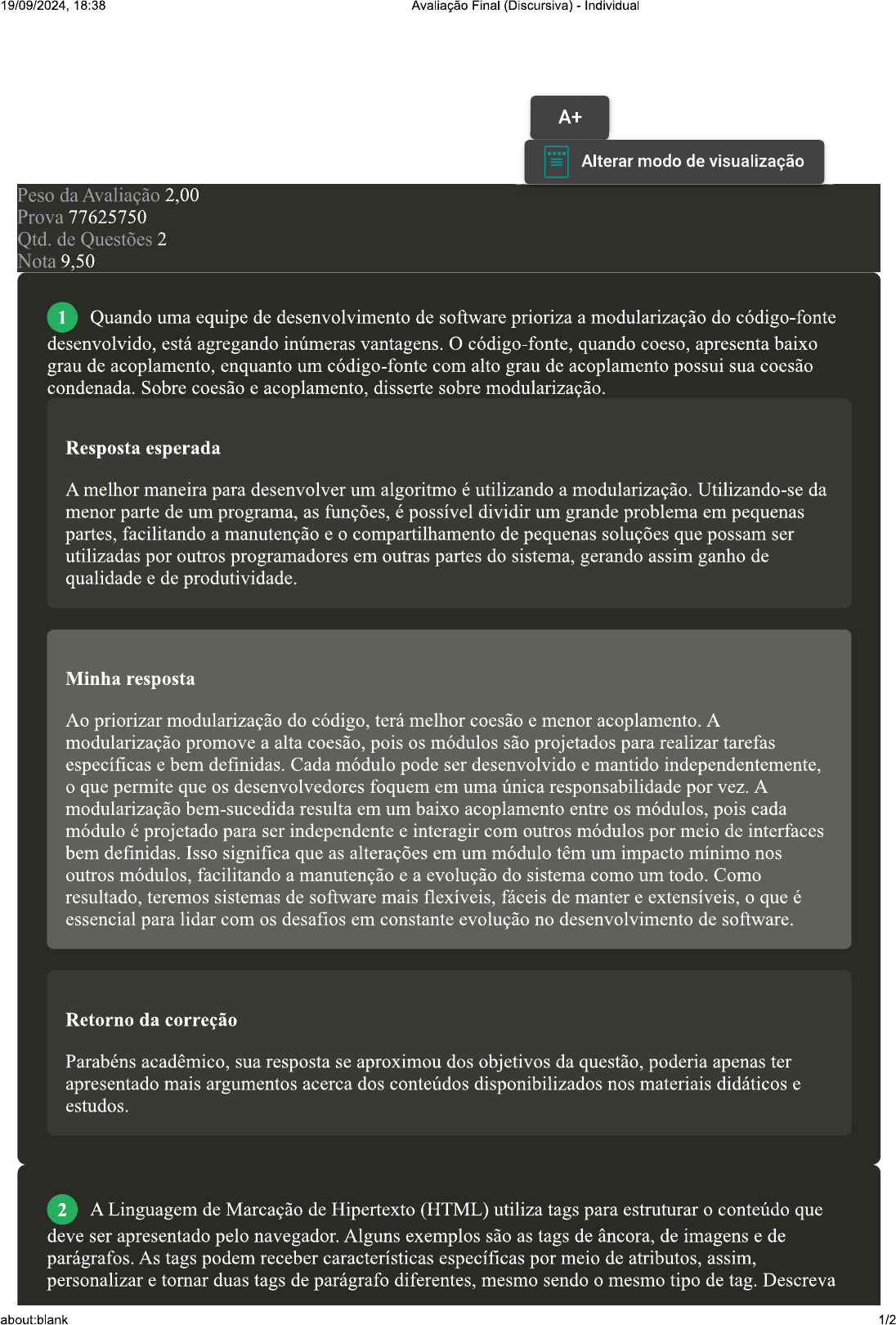 <p>18:38 Avaliação Final (Discursiva) Individual A+ Alterar modo de visualização Peso da Avaliação 2,00 Prova 77625750 Qtd. de Questões 2 Nota 9,50 1 Quando uma equipe de desenvolvimento de software prioriza a modularização do código-fonte desenvolvido, está agregando inúmeras vantagens. O código-fonte, quando coeso, apresenta baixo grau de acoplamento, enquanto um código-fonte com alto grau de acoplamento possui sua coesão condenada. Sobre coesão e acoplamento, disserte sobre modularização. Resposta esperada A melhor maneira para desenvolver um algoritmo é utilizando a modularização. Utilizando-se da menor parte de um programa, as funções, é possível dividir um grande problema em pequenas partes, facilitando a manutenção e compartilhamento de pequenas soluções que possam ser utilizadas por outros programadores em outras partes do sistema, gerando assim ganho de qualidade e de produtividade. Minha resposta Ao priorizar modularização do terá melhor coesão e menor acoplamento. A modularização promove a alta coesão, pois os módulos são projetados para realizar tarefas específicas e bem definidas. Cada módulo pode ser desenvolvido e mantido independentemente, o que permite que os desenvolvedores foquem em uma única responsabilidade por vez. A modularização bem-sucedida resulta em um baixo acoplamento entre os módulos, pois cada módulo é projetado para ser independente e interagir com outros módulos por meio de interfaces bem definidas. Isso significa que as alterações em um módulo têm um impacto mínimo nos outros módulos, facilitando a manutenção e a evolução do sistema como um todo. Como resultado, teremos sistemas de software mais flexíveis, fáceis de manter e extensíveis, que é essencial para lidar com os desafios em constante evolução no desenvolvimento de software. Retorno da correção Parabéns acadêmico, sua resposta se aproximou dos objetivos da questão, poderia apenas ter apresentado mais argumentos acerca dos conteúdos disponibilizados nos materiais didáticos e estudos. 2 A Linguagem de Marcação de Hipertexto (HTML) utiliza tags para estruturar conteúdo que deve ser apresentado pelo navegador. Alguns exemplos são as tags de âncora, de imagens e de parágrafos. As tags podem receber características específicas por meio de atributos, assim, personalizar e tornar duas tags de parágrafo diferentes, mesmo sendo mesmo tipo de tag. Descreva about:blank 1/2</p><p>19/09/2024, 18:38 Avaliação Final (Discursiva) - Individual um documento Hello Word por meio de um HTML padrão, no Body deste HTML imprima um Parágrafo utilizando PHP. Resposta esperada echo " Hello World! ?> Minha resposta Hello World Olá, mundo! ":?> Retorno da correção Parabéns, acadêmico, sua resposta atingiu os objetivos da questão e você contemplou esperado, demonstrando a competência da análise e síntese do assunto abordado, apresentando excelentes argumentos próprios, com base nos materiais disponibilizados. Imprimir about:blank 2/2</p>