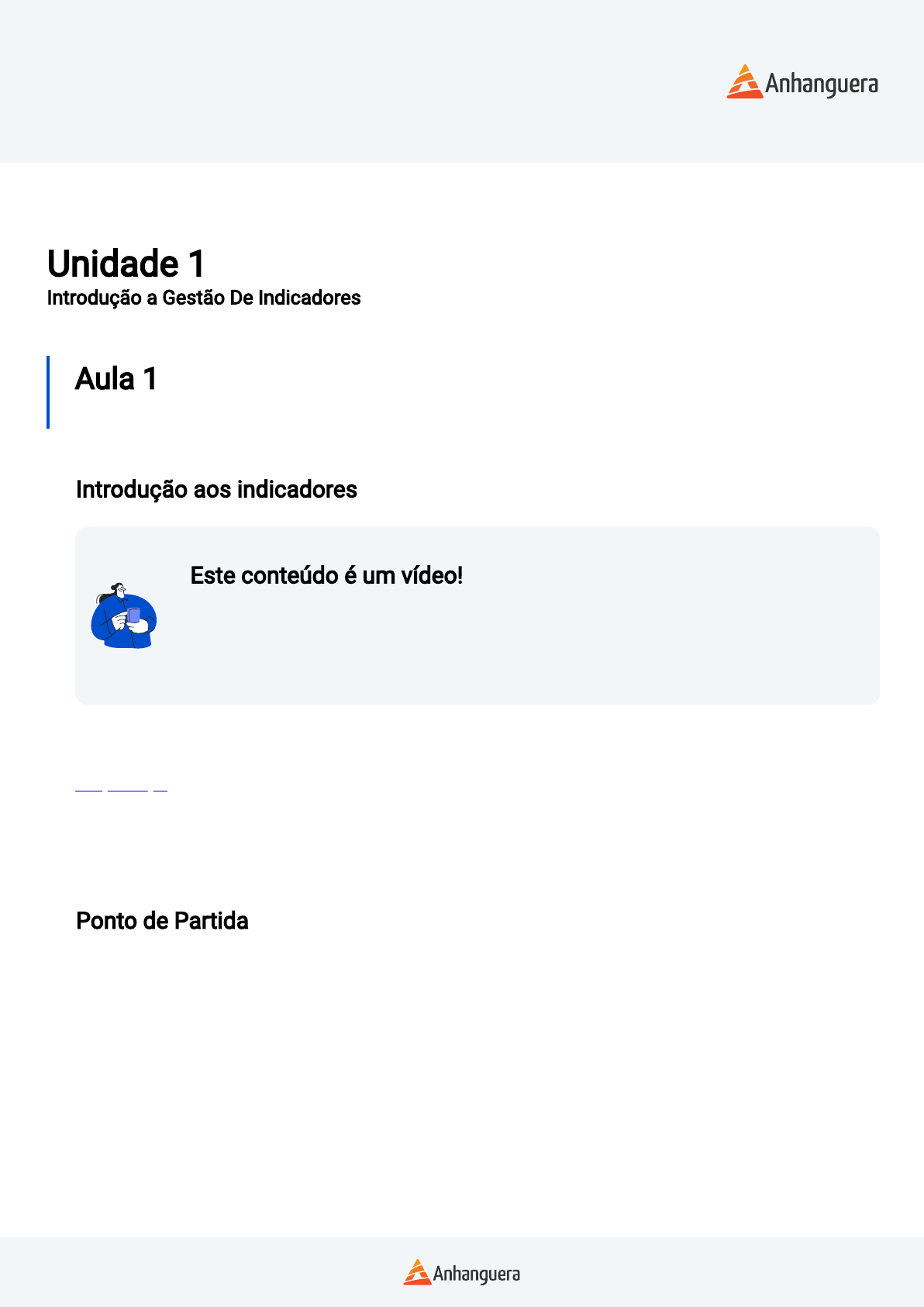 <p>Disciplina</p><p>GESTÃO DE INDICADORES</p><p>Unidade 1</p><p>Introdução a Gestão De Indicadores</p><p>Aula 1</p><p>Introdução aos Indicadores</p><p>Introdução aos indicadores</p><p>Este conteúdo é um vídeo!</p><p>Para assistir este conteúdo é necessário que você acesse o AVA pelo</p><p>computador ou pelo aplicativo. Você pode baixar os vídeos direto no aplicativo</p><p>para assistir mesmo sem conexão à internet.</p><p>Estudante, esta videoaula foi preparada especialmente para você. Nela, você irá aprender</p><p>conteúdos importantes para a sua formação pro�ssional. Vamos assisti-la?</p><p>Clique aqui para acessar os slides da sua videoaula.</p><p>Bons estudos!</p><p>Ponto de Partida</p><p>Olá, estudante!</p><p>Você já se perguntou como as organizações tomam decisões informadas para atingir seus</p><p>objetivos estratégicos? Como os líderes avaliam se estão no caminho certo para o sucesso?</p><p>Nesta aula, vamos explorar a importância dos indicadores de desempenho nas organizações e</p><p>como eles exercem um papel fundamental na tomada de decisões estratégicas. Nestas</p><p>discussões, analisaremos como os indicadores de desempenho possuem um papel crítico nesse</p><p>processo.</p><p>Vamos analisar como eles são essenciais na avaliação do progresso em direção a metas e</p><p>objetivos, na identi�cação de áreas de melhoria e na promoção de uma cultura de</p><p>https://cm-kls-content.s3.amazonaws.com/202401/ALEXANDRIA/GESTAO_DE_INDICADORES/PPT/u1a1_ges_ind.pdf</p><p>Disciplina</p><p>GESTÃO DE INDICADORES</p><p>responsabilidade e e�ciência. Para contextualizar sua aprendizagem, ao �nal da aula</p><p>discutiremos o caso de uma empresa de comércio eletrônico que deseja melhorar sua e�ciência</p><p>operacional e, para isso, precisa implementar indicadores de desempenho em várias áreas-</p><p>chave. Tal conhecimento não apenas enriquecerá sua compreensão do mundo dos negócios,</p><p>mas também o capacitará a aplicar essas habilidades em sua futura carreira pro�ssional.</p><p>Portanto, aproveite ao máximo esta aula e descubra como os indicadores podem fazer a</p><p>diferença em seu cotidiano de trabalho.</p><p>Vamos Começar!</p><p>O papel estratégico dos indicadores de desempenho</p><p>Os indicadores de desempenho são essenciais na tomada de decisões das organizações, pois</p><p>fornecem informações que permitem avaliar se os objetivos estratégicos estão sendo atingidos</p><p>(Camillis et al., 2018). Eles servem como guias para o caminho do sucesso, possibilitando que</p><p>líderes e gestores façam escolhas embasadas em dados concretos. Em um cenário empresarial</p><p>cada vez mais orientado por dados, os indicadores são cruciais para a busca de e�ciência,</p><p>produtividade e qualidade.</p><p>Independentemente da área de atuação, seja �nanças, vendas, operações, recursos humanos,</p><p>qualidade ou atendimento ao cliente, os indicadores são a linguagem universal que conecta</p><p>todas as partes interessadas em uma organização. Eles transcendem fronteiras e</p><p>departamentos, fornecendo uma compreensão objetiva do que está funcionando bem e do que</p><p>precisa ser aprimorado.</p><p>Além disso, os indicadores podem ser tanto quantitativos quanto qualitativos, e são essenciais</p><p>para a gestão proativa de projetos, identi�cação precoce de problemas, tomada de decisões</p><p>informadas, avaliação precisa do desempenho e busca por melhoria contínua. Podem ser</p><p>expressos em números, percentuais, moedas, contas ou classi�cações (Kerzner, 2015).</p><p>Um indicador e�caz deve ter um propósito claro, fornecer informações úteis e relevantes, focar</p><p>em um objetivo especí�co, ser mensurável com precisão, re�etir o verdadeiro status do projeto e</p><p>ser aceito pelas partes interessadas como uma ferramenta para tomada de decisões informadas</p><p>(Kerzner, 2015).</p><p>Disciplina</p><p>GESTÃO DE INDICADORES</p><p>Figura 1 | Categorias de indicadores. Fonte: elaborada pela autora.</p><p>Existem diversas categorias de indicadores, cada uma com aplicações especí�cas, e todas</p><p>podem ser usadas como ferramentas poderosas para impulsionar o sucesso organizacional:</p><p>Indicadores �nanceiros: cruciais para decisões de investimento, planejamento</p><p>orçamentário e gerenciamento de custos.</p><p>Indicadores de desempenho operacional: essenciais para a melhoria da produtividade,</p><p>redução de custos operacionais e garantia da qualidade do produto ou serviço.</p><p>Indicadores de recursos humanos: necessários para a gestão de talentos, retenção de</p><p>funcionários e promoção de uma cultura organizacional saudável.</p><p>Indicadores de marketing: importantes para a avaliação do impacto das estratégias de</p><p>marketing, otimização dos gastos e aumento da e�cácia das campanhas.</p><p>Indicadores de satisfação do cliente: fundamentais para a melhora da �delidade do cliente,</p><p>aprimoramento do suporte e impulsionamento do crescimento da base de clientes.</p><p>Indicadores de sustentabilidade e responsabilidade social: essenciais para a satisfação das</p><p>expectativas dos stakeholders, promoção de uma cultura de responsabilidade social e</p><p>redução do impacto ambiental.</p><p>Disciplina</p><p>GESTÃO DE INDICADORES</p><p>Em suma, a aplicação dessas categorias de indicadores permite que as organizações avaliem</p><p>seu desempenho em várias áreas críticas. Ademais, elas fornecem dados concretos que podem</p><p>orientar resoluções mais informadas e estratégicas.</p><p>Siga em Frente...</p><p>Decisões informadas: a importância dos indicadores na gestão</p><p>A cultura da gestão por indicadores é amplamente difundida no meio empresarial devido aos</p><p>inúmeros benefícios que proporciona. Ela possui um papel fundamental na capacidade de uma</p><p>organização medir o seu desempenho, tomar