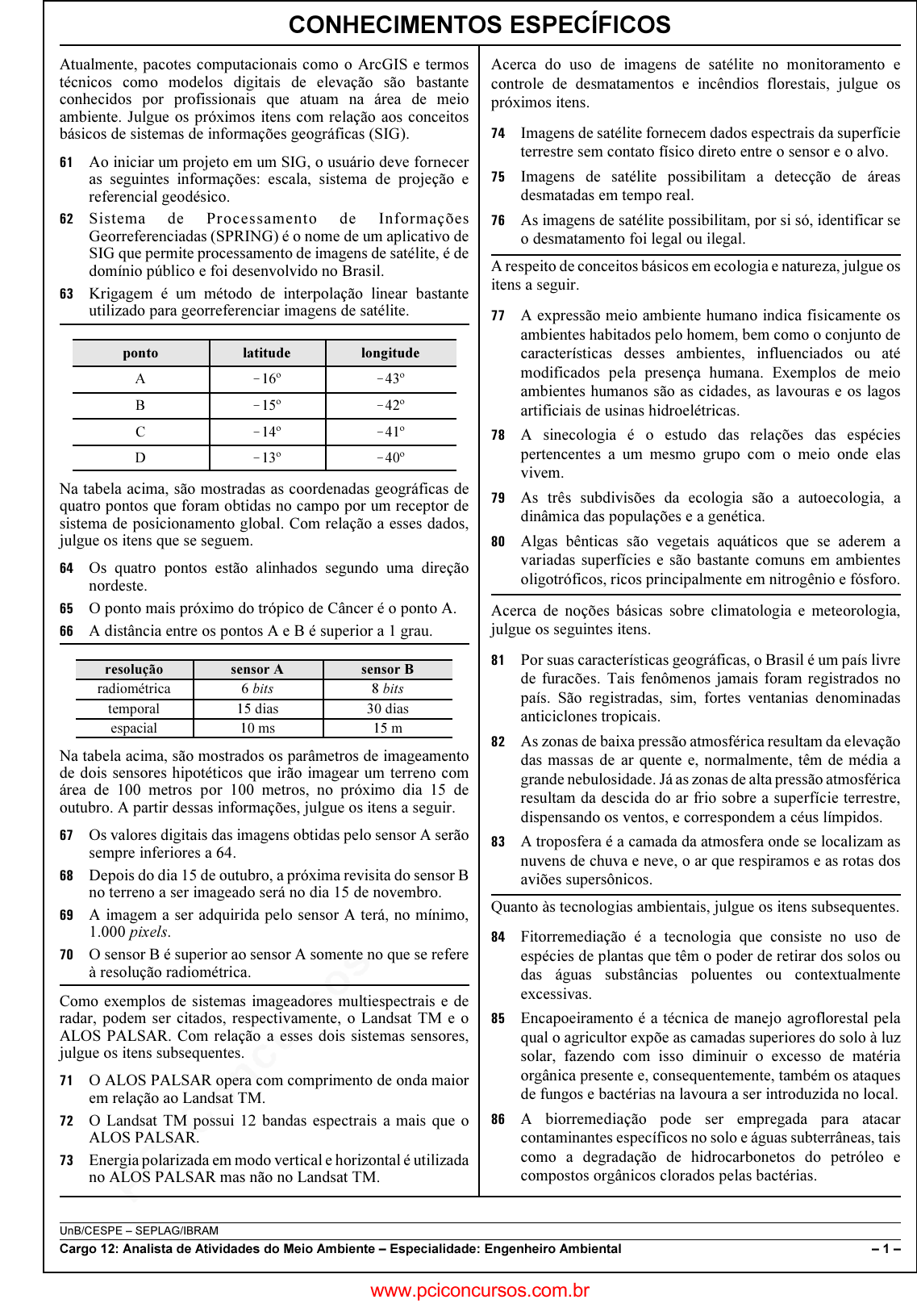<p>pcimarkpci MDAwMDowMDAwOjAwMDA6MDAwMDowMDAwOmZmZmY6YmQxOTo5NWYy:RnJpLCAxMiBNYXkgMjAyMyAxMDowODoxOCAtMDMwMA==</p><p>www.pciconcursos.com.br</p><p>UnB/CESPE – SEPLAG/IBRAM</p><p>Cargo 12: Analista de Atividades do Meio Ambiente – Especialidade: Engenheiro Ambiental – 1 –</p><p>CONHECIMENTOS ESPECÍFICOS</p><p>Atualmente, pacotes computacionais como o ArcGIS e termos</p><p>técnicos como modelos digitais de elevação são bastante</p><p>conhecidos por profissionais que atuam na área de meio</p><p>ambiente. Julgue os próximos itens com relação aos conceitos</p><p>básicos de sistemas de informações geográficas (SIG).</p><p>�� Ao iniciar um projeto em um SIG, o usuário deve fornecer</p><p>as seguintes informações: escala, sistema de projeção e</p><p>referencial geodésico.</p><p>�� Sistema de Processamento de Informações</p><p>Georreferenciadas (SPRING) é o nome de um aplicativo de</p><p>SIG que permite processamento de imagens de satélite, é de</p><p>domínio público e foi desenvolvido no Brasil.</p><p>�� Krigagem é um método de interpolação linear bastante</p><p>utilizado para georreferenciar imagens de satélite.</p><p>ponto latitude longitude</p><p>A !16º !43º</p><p>B !15º !42º</p><p>C !14º !41º</p><p>D !13º !40º</p><p>Na tabela acima, são mostradas as coordenadas geográficas de</p><p>quatro pontos que foram obtidas no campo por um receptor de</p><p>sistema de posicionamento global. Com relação a esses dados,</p><p>julgue os itens que se seguem.</p><p>�� Os quatro pontos estão alinhados segundo uma direção</p><p>nordeste.</p><p>�� O ponto mais próximo do trópico de Câncer é o ponto A.</p><p>�� A distância entre os pontos A e B é superior a 1 grau.</p><p>resolução sensor A sensor B</p><p>radiométrica 6 bits 8 bits</p><p>temporal 15 dias 30 dias</p><p>espacial 10 ms 15 m</p><p>Na tabela acima, são mostrados os parâmetros de imageamento</p><p>de dois sensores hipotéticos que irão imagear um terreno com</p><p>área de 100 metros por 100 metros, no próximo dia 15 de</p><p>outubro. A partir dessas informações, julgue os itens a seguir.</p><p>�� Os valores digitais das imagens obtidas pelo sensor A serão</p><p>sempre inferiores a 64.</p><p>�� Depois do dia 15 de outubro, a próxima revisita do sensor B</p><p>no terreno a ser imageado será no dia 15 de novembro.</p><p>� A imagem a ser adquirida pelo sensor A terá, no mínimo,</p><p>1.000 pixels.</p><p>�</p><p>O sensor B é superior ao sensor A somente no que se refere</p><p>à resolução radiométrica.</p><p>Como exemplos de sistemas imageadores multiespectrais e de</p><p>radar, podem ser citados, respectivamente, o Landsat TM e o</p><p>ALOS PALSAR. Com relação a esses dois sistemas sensores,</p><p>julgue os itens subsequentes.</p><p>�� O ALOS PALSAR opera com comprimento de onda maior</p><p>em relação ao Landsat TM.</p><p>�� O Landsat TM possui 12 bandas espectrais a mais que o</p><p>ALOS PALSAR.</p><p>�� Energia polarizada em modo vertical e horizontal é utilizada</p><p>no ALOS PALSAR mas não no Landsat TM.</p><p>Acerca do uso de imagens de satélite no monitoramento e</p><p>controle de desmatamentos e incêndios florestais, julgue os</p><p>próximos itens.</p><p>�� Imagens de satélite fornecem dados espectrais da superfície</p><p>terrestre sem contato físico direto entre o sensor e o alvo.</p><p>�� Imagens de satélite possibilitam a detecção de áreas</p><p>desmatadas em tempo real.</p><p>�� As imagens de satélite possibilitam, por si só, identificar se</p><p>o desmatamento foi legal ou ilegal.</p><p>A respeito de conceitos básicos em ecologia e natureza, julgue os</p><p>itens a seguir.</p><p>�� A expressão meio ambiente humano indica fisicamente os</p><p>ambientes habitados pelo homem, bem como o conjunto de</p><p>características desses ambientes, influenciados ou até</p><p>modificados pela presença humana. Exemplos de meio</p><p>ambientes humanos são as cidades, as lavouras e os lagos</p><p>artificiais de usinas hidroelétricas.</p><p>�� A sinecologia é o estudo das relações das espécies</p><p>pertencentes a um mesmo grupo com o meio onde elas</p><p>vivem.</p><p>� As três subdivisões da ecologia são a autoecologia, a</p><p>dinâmica das populações e a genética.</p><p>�</p><p>Algas bênticas são vegetais aquáticos que se aderem a</p><p>variadas superfícies e são bastante comuns em ambientes</p><p>oligotróficos, ricos principalmente em nitrogênio e fósforo.</p><p>Acerca de noções básicas sobre climatologia e meteorologia,</p><p>julgue os seguintes itens.</p><p>�� Por suas características geográficas, o Brasil é um país livre</p><p>de furacões. Tais fenômenos jamais foram registrados no</p><p>país. São registradas, sim, fortes ventanias denominadas</p><p>anticiclones tropicais.</p><p>�� As zonas de baixa pressão atmosférica resultam da elevação</p><p>das massas de ar quente e, normalmente, têm de média a</p><p>grande nebulosidade. Já as zonas de alta pressão atmosférica</p><p>resultam da descida do ar frio sobre a superfície terrestre,</p><p>dispensando os ventos, e correspondem a céus límpidos.</p><p>�� A troposfera é a camada da atmosfera onde se localizam as</p><p>nuvens de chuva e neve, o ar que respiramos e as rotas dos</p><p>aviões supersônicos.</p><p>Quanto às tecnologias ambientais, julgue os itens subsequentes.</p><p>�� Fitorremediação é a tecnologia que consiste no uso de</p><p>espécies de plantas que têm o poder de retirar dos solos ou</p><p>das águas substâncias poluentes ou contextualmente</p><p>excessivas.</p><p>�� Encapoeiramento é a técnica de manejo agroflorestal pela</p><p>qual o agricultor expõe as camadas superiores do solo à luz</p><p>solar, fazendo com isso diminuir o excesso de matéria</p><p>orgânica presente e, consequentemente, também os ataques</p><p>de fungos e bactérias na lavoura 