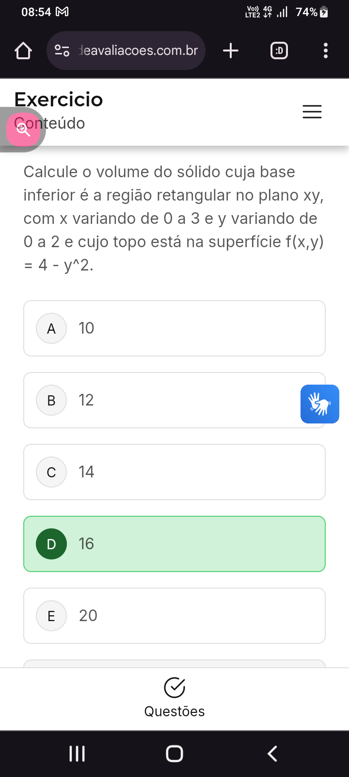 <p>08:54 M Vo)) LTE2 74% deavaliacoes.com.br + :D Exercicio Conteúdo Calcule o volume do sólido cuja base inferior é a região retangular no plano xy, com X variando de 0 a 3 e y variando de 0 a 2 e cujo topo está na superfície f(x,y) - y^2. A 10 B 12 C 14 D 16 E 20 Questões O</p>