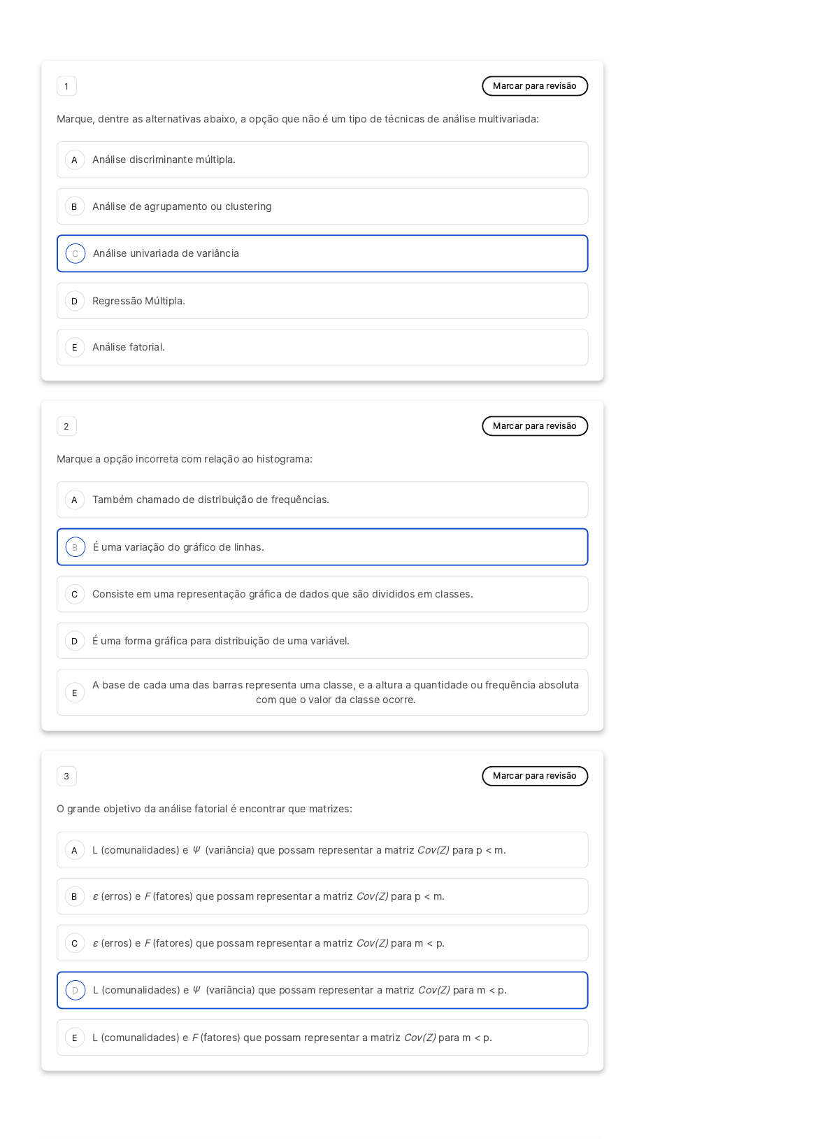 <p>A</p><p>B</p><p>C</p><p>D</p><p>E</p><p>A</p><p>B</p><p>C</p><p>D</p><p>E</p><p>A</p><p>B</p><p>C</p><p>D</p><p>E</p><p>1 Marcar para revisão</p><p>Marque, dentre as alternativas abaixo, a opção que não é um tipo de técnicas de análise multivariada:</p><p>Análise discriminante múltipla.</p><p>Análise de agrupamento ou clustering</p><p>Análise univariada de variância</p><p>Regressão Múltipla.</p><p>Análise fatorial.</p><p>2 Marcar para revisão</p><p>Marque a opção incorreta com relação ao histograma:</p><p>Também chamado de distribuição de frequências.</p><p>É uma variação do gráfico de linhas.</p><p>Consiste em uma representação gráfica de dados que são divididos em classes.</p><p>É uma forma gráfica para distribuição de uma variável.</p><p>A base de cada uma das barras representa uma classe, e a altura a quantidade ou frequência absoluta</p><p>com que o valor da classe ocorre.</p><p>3 Marcar para revisão</p><p>O grande objetivo da análise fatorial é encontrar que matrizes:</p><p>L (comunalidades) e Ψ (variância) que possam representar a matriz Cov(Z) para p < m.</p><p>ε (erros) e F (fatores) que possam representar a matriz Cov(Z) para p < m.</p><p>ε (erros) e F (fatores) que possam representar a matriz Cov(Z) para m < p.</p><p>L (comunalidades) e Ψ (variância) que possam representar a matriz Cov(Z) para m < p.</p><p>L (comunalidades) e F (fatores) que possam representar a matriz Cov(Z) para m < p.</p><p>A</p><p>B</p><p>C</p><p>D</p><p>E</p><p>A</p><p>B</p><p>C</p><p>D</p><p>E</p><p>A</p><p>B</p><p>C</p><p>D</p><p>E</p><p>4 Marcar para revisão</p><p>Marque a opção incorreta com relação à Análise de Regressão Múltipla:</p><p>É uma técnica de dependência que é a usada de forma versátil, aplicável na tomada de decisões em</p><p>economia e negócios.</p><p>É uma variação do modelo de análise fatorial.</p><p>É o fundamento para realizar previsões dos problemas estudados.</p><p>É uma técnica importante para relacionar matematicamente duas ou mais variáveis, com uma função.</p><p>Os coeficientes de regressão (βi) representam a variação estimada na variável dependente por</p><p>variação unitária da variável independente.</p><p>5 Marcar para revisão</p><p>Com relação a análise de variância multivariada �MANOVA � Multiple Analysis Of VAriance) é incorreto afirmar :</p><p>é uma extensão ou forma generalizada da análise de variância �ANOVA�.</p><p>é utilizada em casos em que existem duas ou mais variáveis dependentes.</p><p>é um procedimento para comparação de médias amostrais multivariadas.</p><p>envolve variáveis dependentes não métricas e variáveis independentes categóricas.</p><p>analisa simultaneamente múltiplas medidas de cada indivíduo ou objeto sob investigação. envolve</p><p>variáveis dependentes métricas e variáveis independentes categóricas.</p><p>6 Marcar para revisão</p><p>MANOVA está interessada em diferenças entre grupos (ou tratamentos experimentais). São representadas</p><p>nesta forma geral:</p><p>Y = X .1 1</p><p>X � X +...� X � Y � Y +...� Y .1 2 n 1 2 n</p><p>Y � Y +...� Y = X � X +...� X .1 2 n 1 2 n</p><p>Y � Y +...� Y = X.1 2 n</p><p>Y � X � X +...� X .1 2 n</p><p>7 Marcar para revisão</p><p>A</p><p>B</p><p>C</p><p>D</p><p>E</p><p>A</p><p>B</p><p>C</p><p>D</p><p>E</p><p>A</p><p>B</p><p>C</p><p>Marque a opção incorreta com relação análise conjunta:</p><p>A análise conjunta tradicional é uma metodologia que emprega os princípios clássicos da análise</p><p>conjunta na tarefa conjunta, usando um modelo aditivo da preferência de consumidor e métodos de</p><p>apresentação de comparação pareada ou de perfil completo.</p><p>A análise conjunta determina se as variáveis podem ser resumidas a um conjunto menor de fatores.</p><p>A análise conjunta é uma técnica multivariada usada especificamente para entender como os</p><p>respondentes desenvolvem preferencias por quaisquer tipos de objetos (produtos, serviços ou ideias).</p><p>A análise conjunta é mais adequada para compreender reações de consumidores e avaliações de</p><p>combinações predeterminadas de atributos que representam produtos ou serviços potenciais.</p><p>A análise conjunta é na verdade uma família de técnicas e métodos especificamente desenvolvidos</p><p>para entender preferencias individuais que compartilham uma fundamentação teórica com base nos</p><p>modelos de integração de informação e medição funcional.</p><p>8 Marcar para revisão</p><p>O método aglomerativo segue um processo simples e repetitivo, marque a opção que não corresponde a um</p><p>passo:</p><p>Continuar a combinar os dois agrupamentos mais parecidos em um novo, reduzindo assim a quantia</p><p>de agrupamentos em uma unidade.</p><p>Repetir o processo novamente, usando medida de similaridade para combinar os dois agrupamentos</p><p>mais parecidos em um novo.</p><p>Usando a medida de similaridade, não há necessidade de formar agrupamentos.</p><p>Usando a medida de similaridade, combinar os dois agrupamentos mais parecidos em um novo (agora</p><p>contendo duas observações), reduzindo assim a quantia de agrupamentos em uma unidade.</p><p>Começar com todas as observações como formando seus próprios agrupamentos (ou seja, cada</p><p>observação forma um agrupamento unitário), de forma que o número de agrupamentos seja igual ao</p><p>de observações.</p><p>9 Marcar para revisão</p><p>As dimensões são características de um objeto. Pode-se imaginar que um objeto específico possui dimensões</p><p>percebidas/subjetivas (p. ex., caro, frágil) e objetivas (p. ex., cor, preço, características). Dimensão objetivas</p><p>são características físicas ou tangíveis de um objeto que têm uma base objetiva de comparação. Por exemplo,</p><p>um produto tem tamanho, forma, cor, peso e assim por diante. Já a dimensão percebidas/subjetivas seria uma</p>
