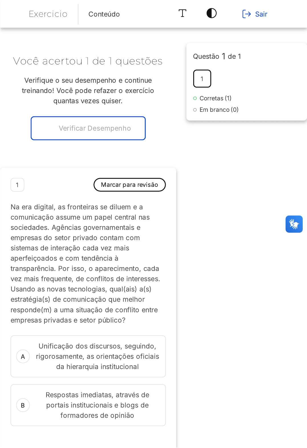 <p>19/09/24, 20:36 https://estacio.saladeavaliacoes.com.br/exercicio/66d84426c669e5c9f4af6562/gabarito/</p><p>https://estacio.saladeavaliacoes.com.br/exercicio/66d84426c669e5c9f4af6562/gabarito/ 1/2</p><p>Você acertou 1 de 1 questões</p><p>Verifique o seu desempenho e continue</p><p>treinando! Você pode refazer o exercício</p><p>quantas vezes quiser.</p><p>Verificar Desempenho</p><p>A</p><p>B</p><p>1 Marcar para revisão</p><p>Na era digital, as fronteiras se diluem e a</p><p>comunicação assume um papel central nas</p><p>sociedades. Agências governamentais e</p><p>empresas do setor privado contam com</p><p>sistemas de interação cada vez mais</p><p>aperfeiçoados e com tendência à</p><p>transparência. Por isso, o aparecimento, cada</p><p>vez mais frequente, de conflitos de interesses.</p><p>Usando as novas tecnologias, qual(ais) a(s)</p><p>estratégia(s) de comunicação que melhor</p><p>responde(m) a uma situação de conflito entre</p><p>empresas privadas e setor público?</p><p>Unificação dos discursos, seguindo,</p><p>rigorosamente, as orientações oficiais</p><p>da hierarquia institucional</p><p>Respostas imediatas, através de</p><p>portais institucionais e blogs de</p><p>formadores de opinião</p><p>Questão 1 de 1</p><p>Corretas �1�</p><p>Em branco �0�</p><p>1</p><p>Exercicio Conteúdo Sair</p><p>19/09/24, 20:36 https://estacio.saladeavaliacoes.com.br/exercicio/66d84426c669e5c9f4af6562/gabarito/</p><p>https://estacio.saladeavaliacoes.com.br/exercicio/66d84426c669e5c9f4af6562/gabarito/ 2/2</p><p>C</p><p>D</p><p>E</p><p>Pesquisa cautelosa e apuração</p><p>rigorosa dos elementos em jogo para</p><p>posterior prestação de contas</p><p>Controle das informações internas e</p><p>discurso da transparência para a</p><p>opinião pública.</p><p>Comunicados oficiais, dando uma</p><p>versão própria para os fatos em</p><p>questão, pela internet</p><p>Resposta correta</p><p>Parabéns, você selecionou a</p><p>alternativa correta. Confira o</p><p>gabarito comentado!</p><p>Gabarito Comentado</p><p>Em tempos de redes sociais, comunicação</p><p>instântanea e imagem pública das</p><p>empresas, a posição adequada em</p><p>situações conflituosas e de crise é</p><p>pesquisar com cautela e comunicar com</p><p>transparência.</p>