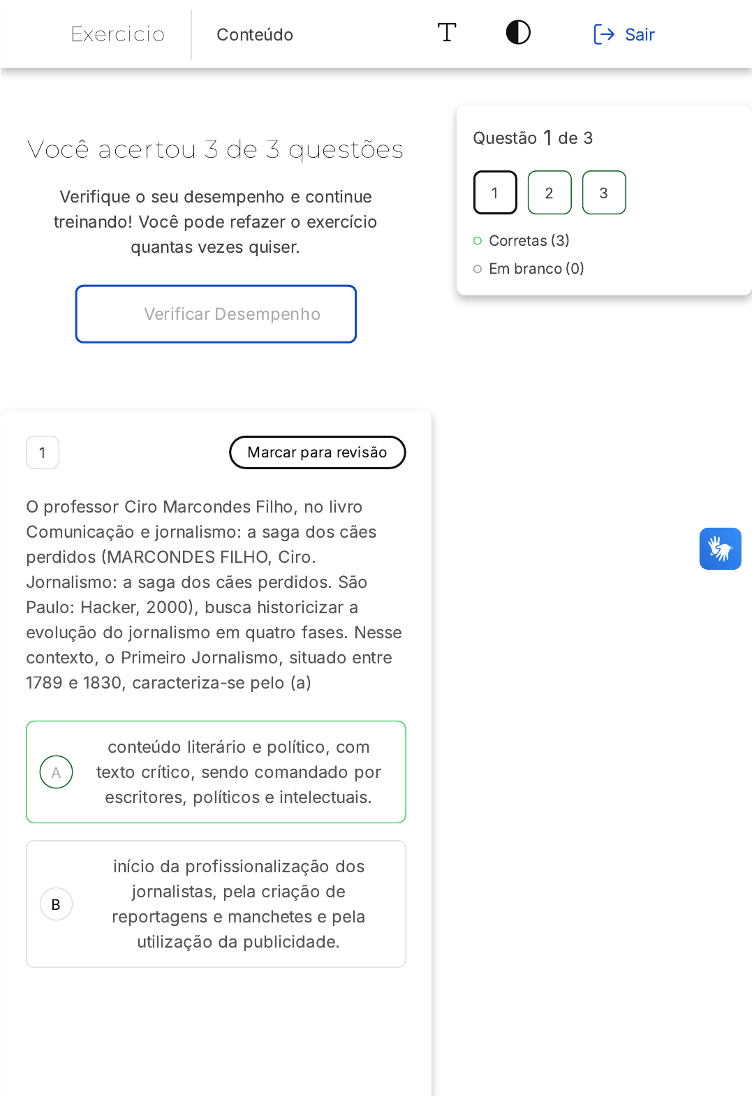 <p>19/09/24, 20:30 https://estacio.saladeavaliacoes.com.br/exercicio/66d842f4c669e5c9f4af555a/gabarito/</p><p>https://estacio.saladeavaliacoes.com.br/exercicio/66d842f4c669e5c9f4af555a/gabarito/ 1/6</p><p>Você acertou 3 de 3 questões</p><p>Verifique o seu desempenho e continue</p><p>treinando! Você pode refazer o exercício</p><p>quantas vezes quiser.</p><p>Verificar Desempenho</p><p>A</p><p>B</p><p>1 Marcar para revisão</p><p>O professor Ciro Marcondes Filho, no livro</p><p>Comunicação e jornalismo: a saga dos cães</p><p>perdidos �MARCONDES FILHO, Ciro.</p><p>Jornalismo: a saga dos cães perdidos. São</p><p>Paulo: Hacker, 2000�, busca historicizar a</p><p>evolução do jornalismo em quatro fases. Nesse</p><p>contexto, o Primeiro Jornalismo, situado entre</p><p>1789 e 1830, caracteriza-se pelo (a)</p><p>conteúdo literário e político, com</p><p>texto crítico, sendo comandado por</p><p>escritores, políticos e intelectuais.</p><p>início da profissionalização dos</p><p>jornalistas, pela criação de</p><p>reportagens e manchetes e pela</p><p>utilização da publicidade.</p><p>Questão 1 de 3</p><p>Corretas �3�</p><p>Em branco �0�</p><p>1 2 3</p><p>Exercicio Conteúdo Sair</p><p>19/09/24, 20:30 https://estacio.saladeavaliacoes.com.br/exercicio/66d842f4c669e5c9f4af555a/gabarito/</p><p>https://estacio.saladeavaliacoes.com.br/exercicio/66d842f4c669e5c9f4af555a/gabarito/ 2/6</p><p>C</p><p>D</p><p>E</p><p>monopolização do mercado por</p><p>grandes grupos empresariais,</p><p>fortemente influenciados por ações de</p><p>relações públicas.</p><p>impressão em grandes tiragens e</p><p>ampla utilização da tecnologia, o que</p><p>motivou mudanças nas funções do</p><p>jornalista profissional.</p><p>valorização da informação visual e</p><p>crise da imprensa escrita, devido aos</p><p>altos índices de analfabetismo</p><p>Resposta correta</p><p>Parabéns, você selecionou a</p><p>alternativa correta. Confira o</p><p>gabarito comentado!</p><p>Gabarito Comentado</p><p>O jornalismo nessa primeira fase ainda não</p><p>conta com a profissionalização formal. A</p><p>divulgação dos negócios de então e a</p><p>reflexão sobre os acontecimentos</p><p>políticos, os debates de ideias figuravam</p><p>nas páginas de jornal e eram elaboradas e</p><p>escritas principalmente por jornalistas e</p><p>homens de ideias.</p><p>-----</p><p>2 Marcar para revisão</p><p>As pesquisas científicas sobre os fenômenos</p><p>de comunicação de massa do início do século</p><p>XX, tanto europeias quanto norte-americanas,</p><p>19/09/24, 20:30 https://estacio.saladeavaliacoes.com.br/exercicio/66d842f4c669e5c9f4af555a/gabarito/</p><p>https://estacio.saladeavaliacoes.com.br/exercicio/66d842f4c669e5c9f4af555a/gabarito/ 3/6</p><p>mesmo com referencial conceitual diferente tem</p><p>concepção do processo de comunicação</p><p>semelhante. Sobre essas teorias podemos</p><p>afirmar que: Assinale V para as afirmações</p><p>verdadeiras e F para as afirmativas falsas.</p><p>( ) As pesquisas norte-americanas desse</p><p>período delimitaram um campo de investigação</p><p>denominado Mass Communication Research,</p><p>cujas características principais foram o método</p><p>quantitativo, o caráter pragmático; e o</p><p>tratamento dos meios de comunicação de</p><p>massa como instrumentos de administração</p><p>social, a preocupação com os efeitos e o</p><p>modelo linear de compreensão do processo de</p><p>comunicação de massa.</p><p>( ) Essas pesquisas ficaram conhecidas pela</p><p>denominação Mathematical Communication</p><p>Research e seu principal objetivo era identificar,</p><p>no processo de comunicação, as</p><p>possibilidades de ruído, a fim de poder eliminá-</p><p>los.</p><p>( ) A Teoria europeia de grande importância,</p><p>contemporânea às teorias norte-americanas da</p><p>primeira metade do século XX, era a Teoria</p><p>Crítica, desenvolvida pelos intelectuais da</p><p>Escola de Frankfurt.</p><p>( ) Os intelectuais da Escola de Frankfurt,</p><p>embora fizessem uma análise do contexto</p><p>sócio-cultural, político e econômico da</p><p>sociedade industrial a partir de referências</p><p>teóricas marxistas, tinham concepção</p><p>semelhante as dos norte-americanos no que</p><p>diz respeito ao processo de comunicação de</p><p>massa, ou seja, entendiam que os meios de</p><p>comunicação garantiam o controle e a</p><p>submissão dos indivíduos.</p><p>( ) A noção de Indústria Cultural, desenvolvida</p><p>por Theodor Adorno e Max Horkheimer</p><p>(pensadores da Escola de Frankfurt), é</p><p>fundamental para a compreensão crítica das</p><p>relações entre política, economia e cultura nas</p><p>sociedades industriais capitalistas no século</p><p>XX.</p><p>19/09/24, 20:30 https://estacio.saladeavaliacoes.com.br/exercicio/66d842f4c669e5c9f4af555a/gabarito/</p><p>https://estacio.saladeavaliacoes.com.br/exercicio/66d842f4c669e5c9f4af555a/gabarito/ 4/6</p><p>A</p><p>B</p><p>C</p><p>D</p><p>E</p><p>V, F, V, V, V</p><p>V, F, F, F, V</p><p>F, V, V, V, F</p><p>F, F, F, V, V</p><p>V, V, V, F, F</p><p>Resposta correta</p><p>Parabéns, você selecionou a</p><p>alternativa correta. Confira o</p><p>gabarito comentado!</p><p>Gabarito Comentado</p><p>V, F, V, V, V � As pesquisas norte</p><p>americanas �Mass Communication</p><p>Research) e a Escola de Frankfurt são as</p><p>visões dominantes no início do século XX</p><p>sobre a comunicação midiática de massa.</p><p>Mass Communication Research grupo de</p><p>pesquisa diverso que se preocupava em</p><p>como usar os meios de comunicação de</p><p>massa como instrumentos de</p><p>administração social ( Teoria Matémática</p><p>da Comunicação, Teoria Funcionalista,</p><p>Teoria Hipodérmica). A Escola de Frankfurt</p><p>com visão crítica sobre o papel dos meios</p><p>massivos, identificados por eles como</p><p>mecanismos de dominação e incentivo ao</p><p>consumo, vide a noção de Indústria</p><p>19